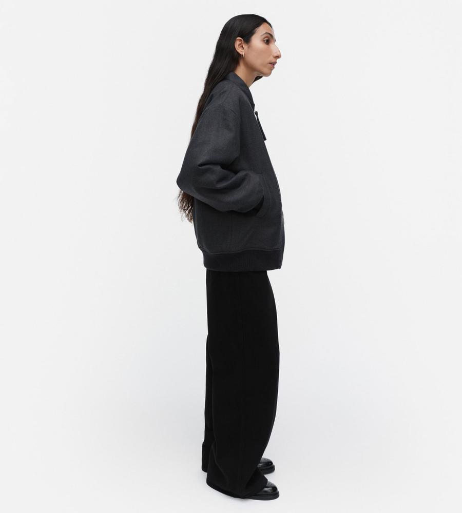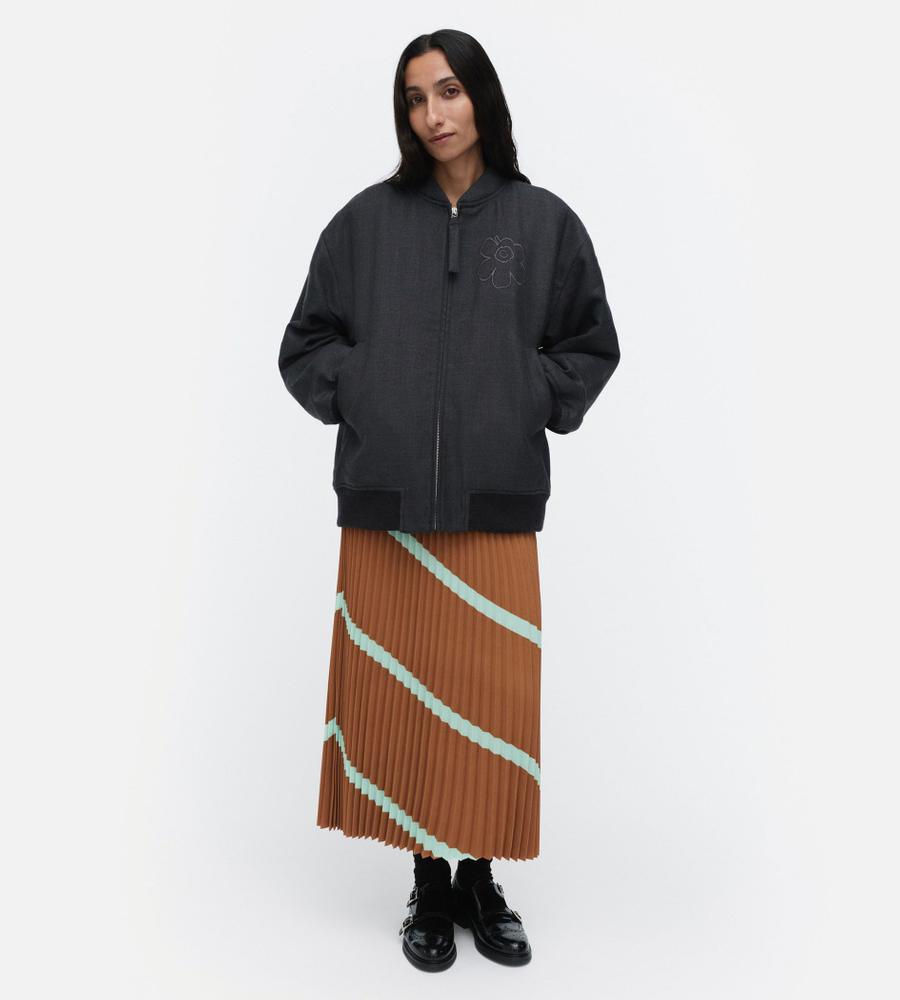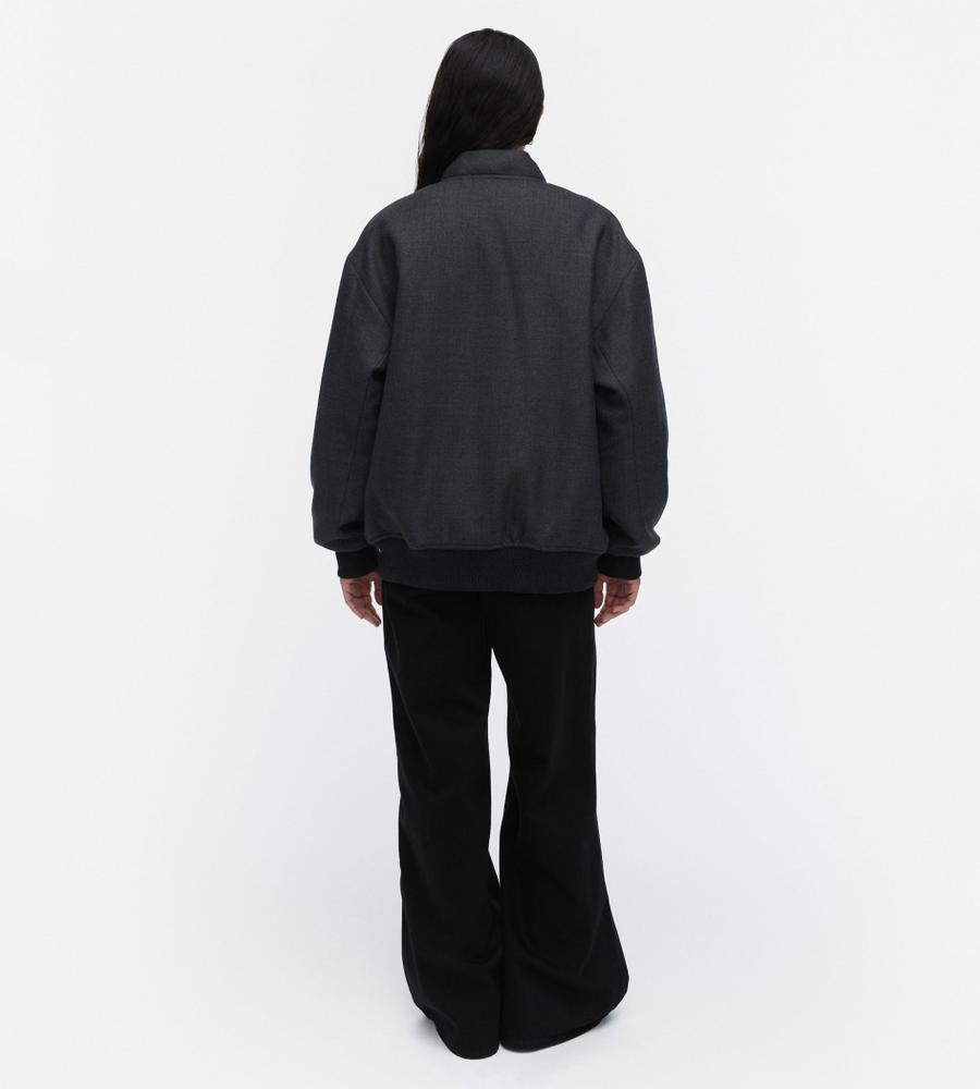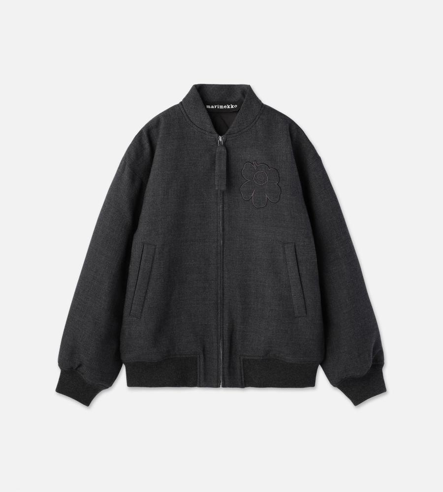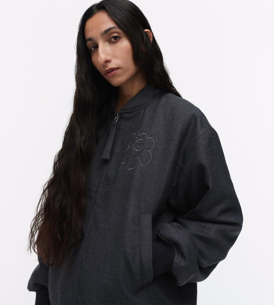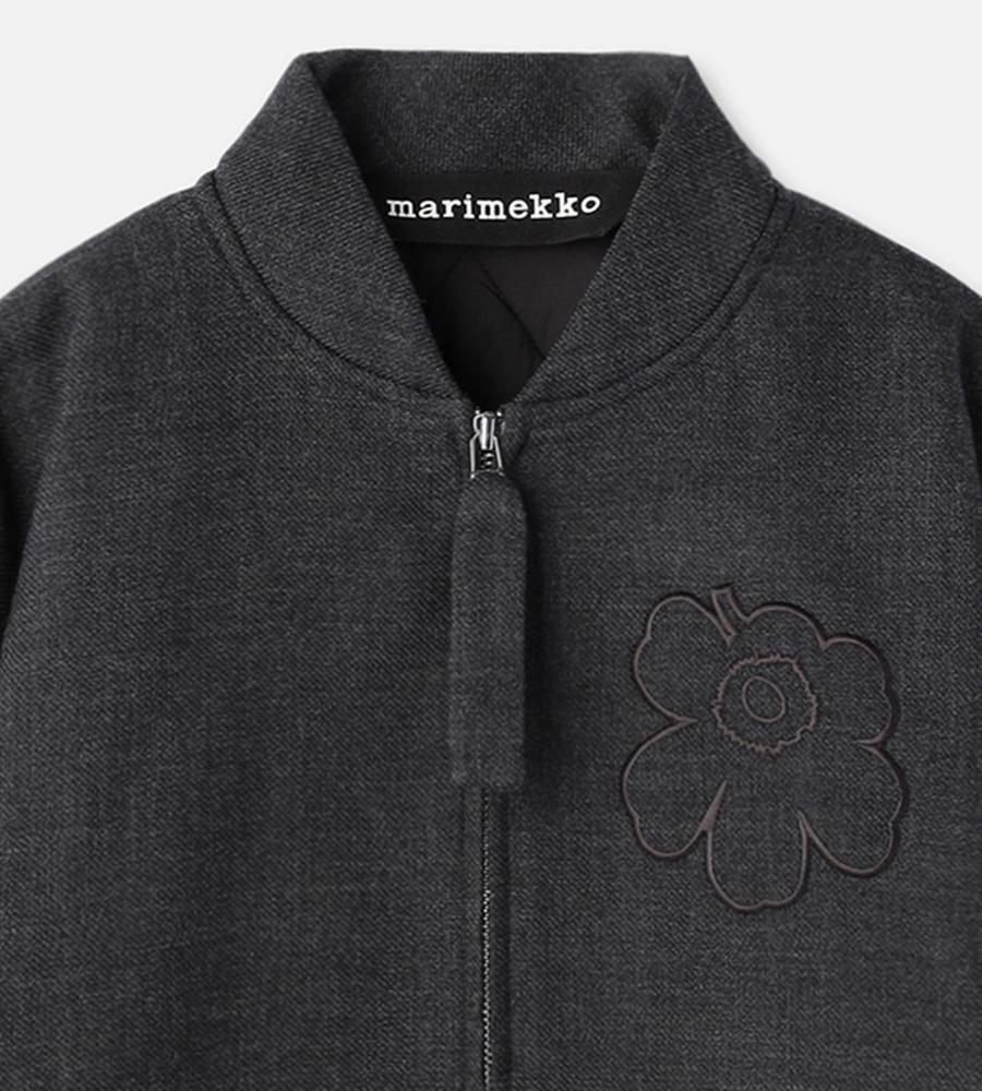 左胸にUnikko柄のエンブロイダリーをワンポイントにあしらった、Monumenttiウールジャケット。フロントはファスナー仕様、左右にポケットを配置。袖先と裾はリブで切り替えています。ドロップショルダーでどこかリラックスしたムードを演出したアイテムです。