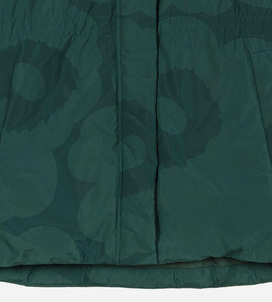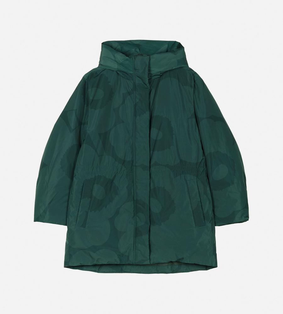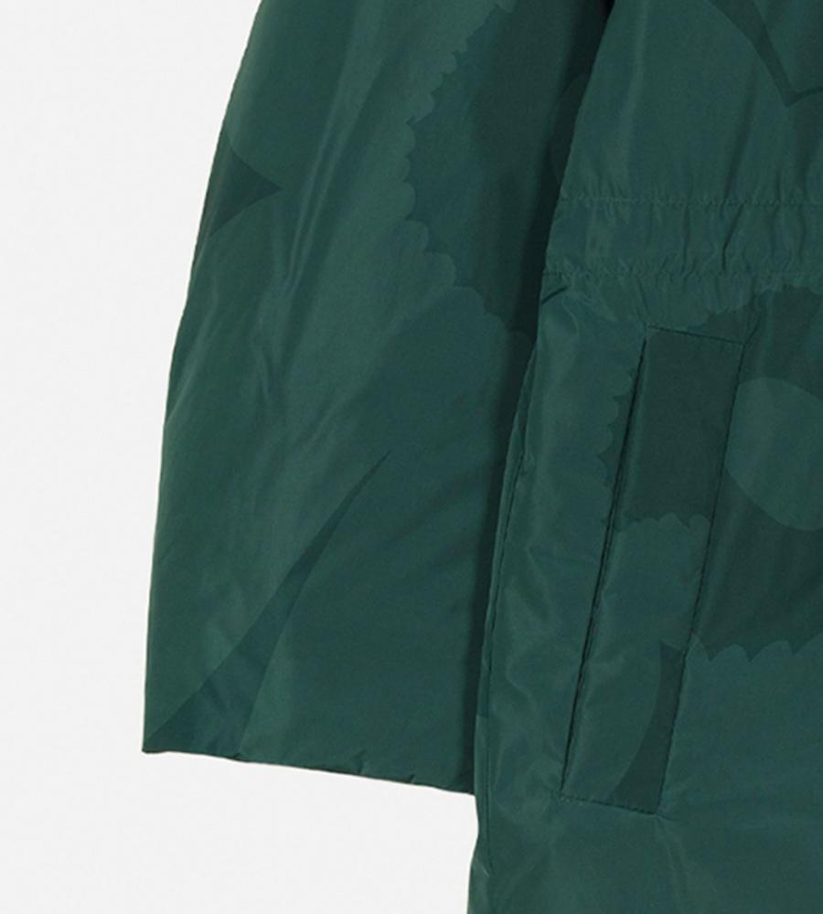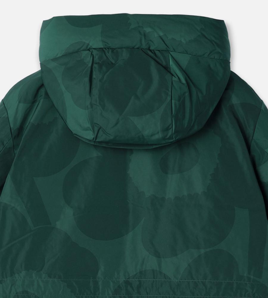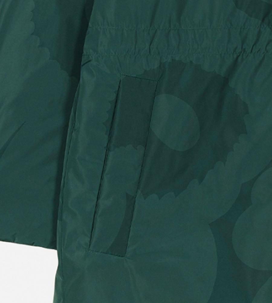 大ぶりなUnikko柄をあしらったダウンコート。表面にダウンステッチのない洗練されたデザインで、カジュアルからキレイめまで幅広い着こなしに合わせやすいアイテムです。大きく立体的なフードはお顔まわりを華やかに演出。ウエスト内側にドローストリングが通っているためシルエットのアレンジも楽しめます。