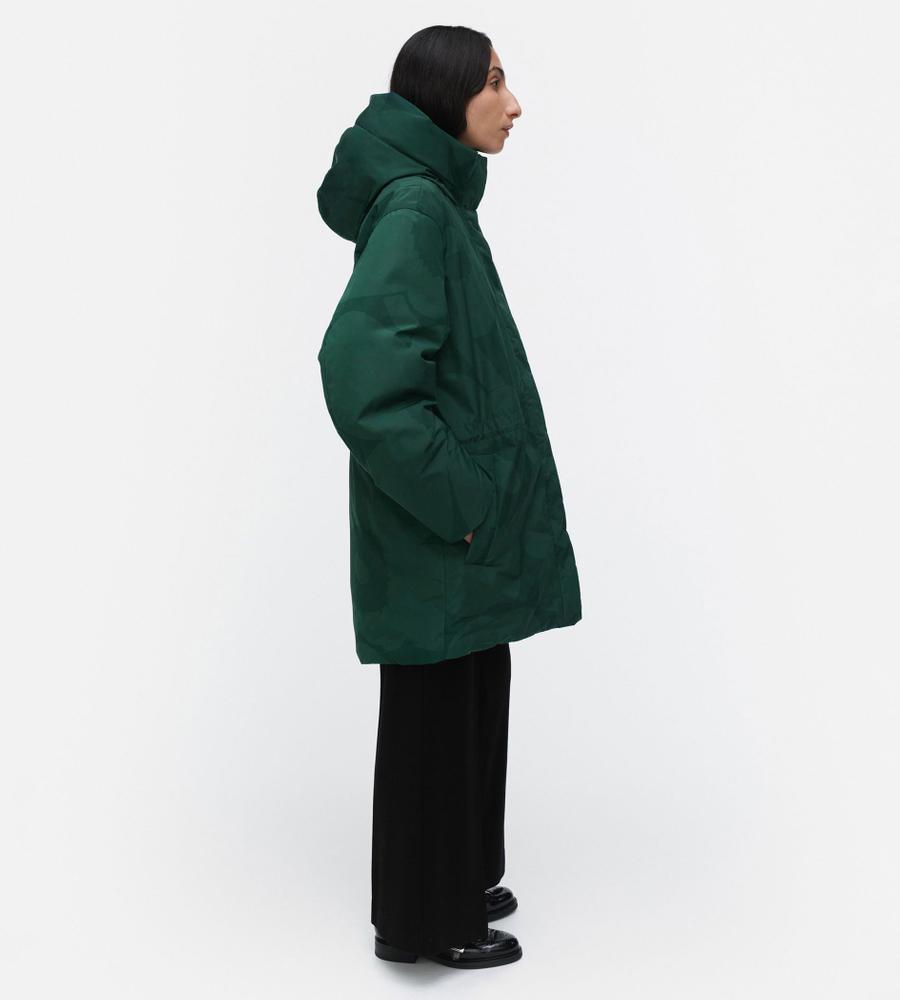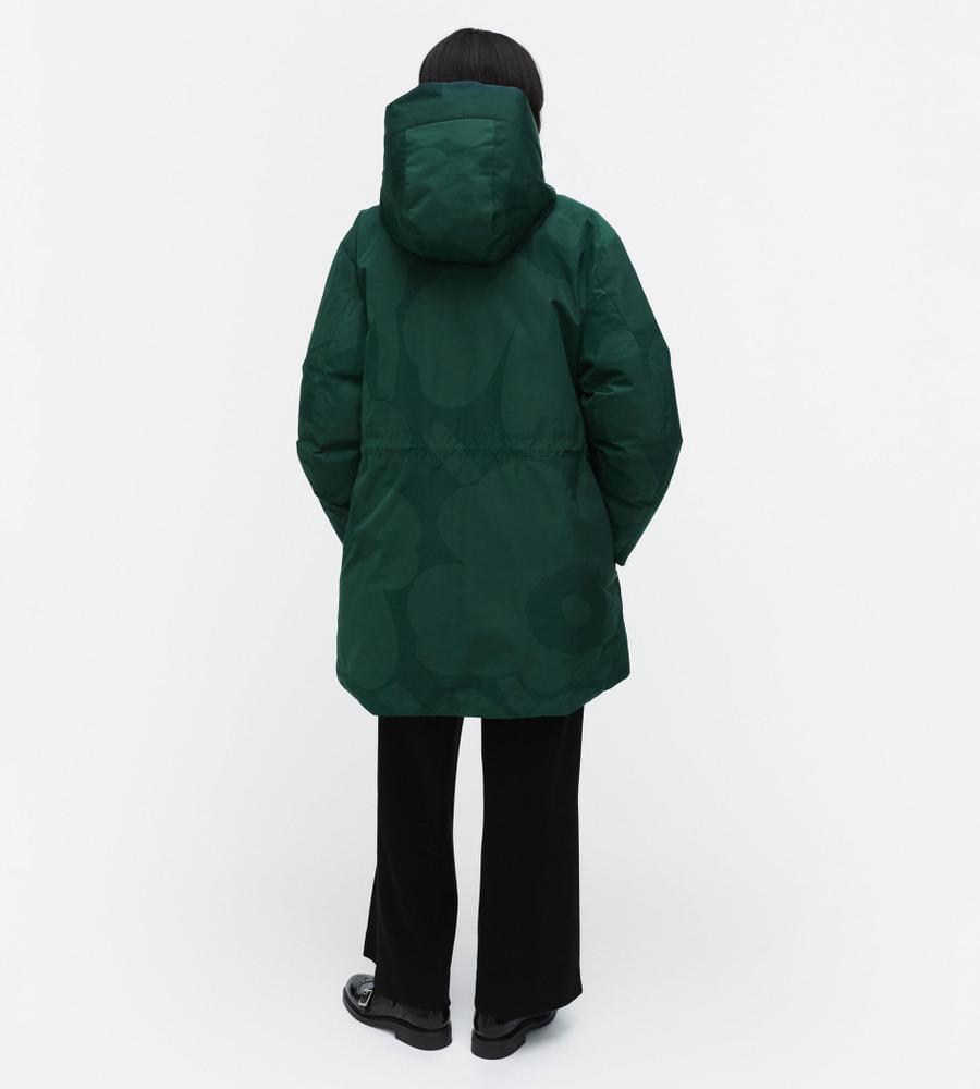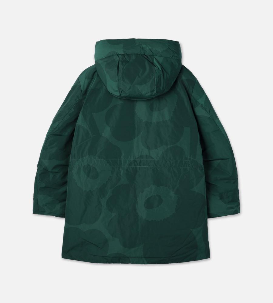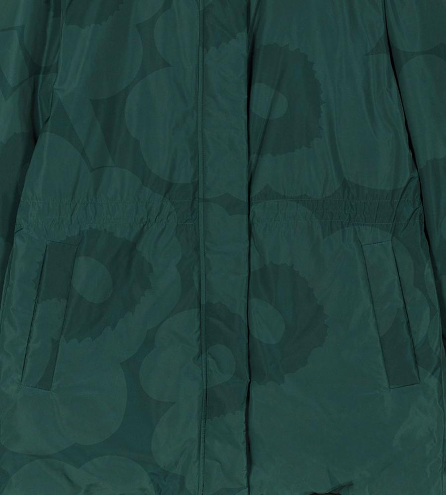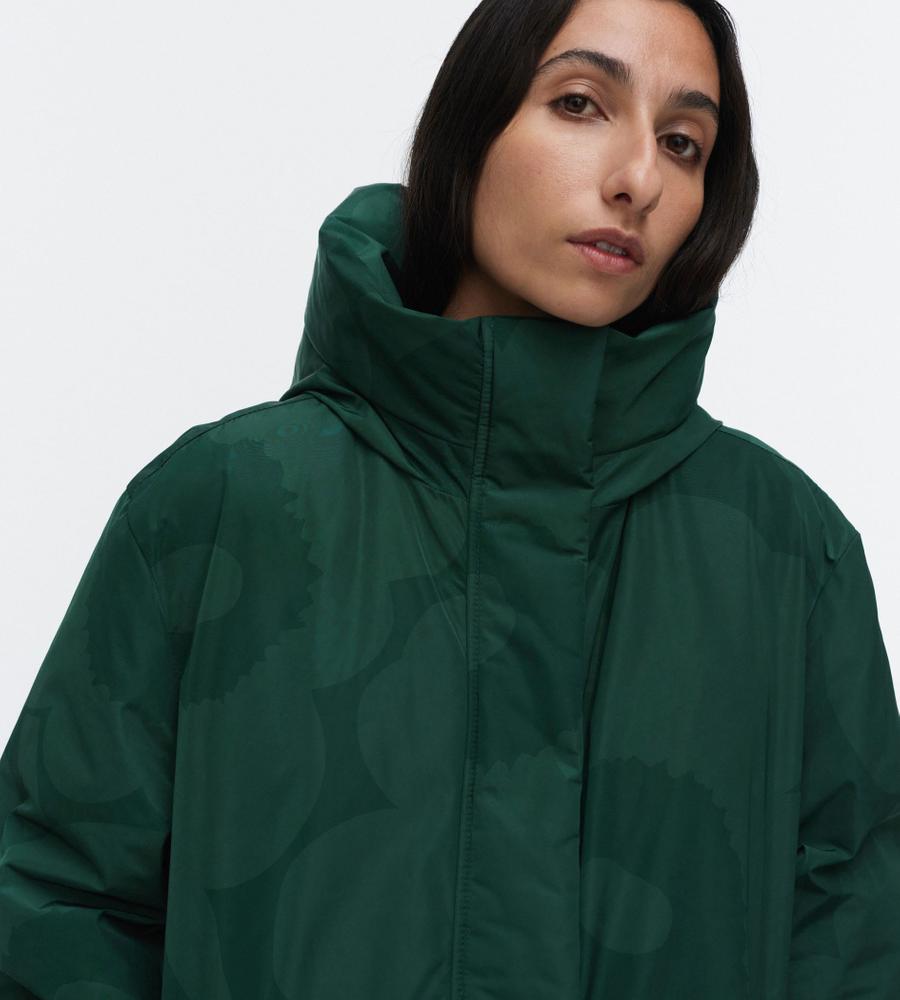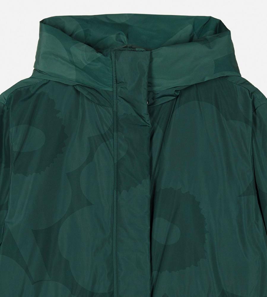 大ぶりなUnikko柄をあしらったダウンコート。表面にダウンステッチのない洗練されたデザインで、カジュアルからキレイめまで幅広い着こなしに合わせやすいアイテムです。大きく立体的なフードはお顔まわりを華やかに演出。ウエスト内側にドローストリングが通っているためシルエットのアレンジも楽しめます。
