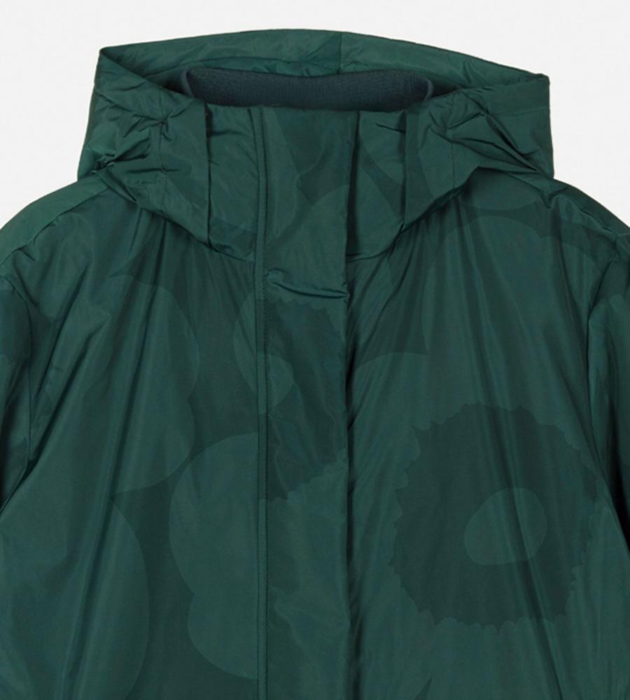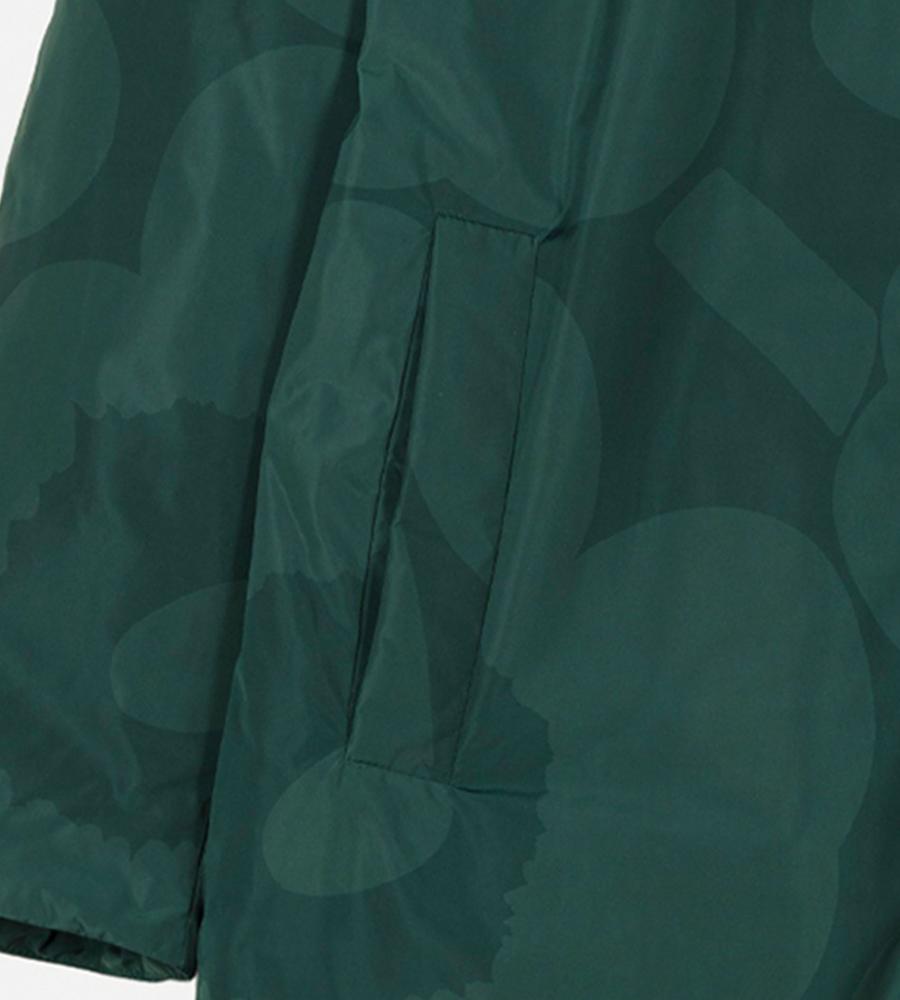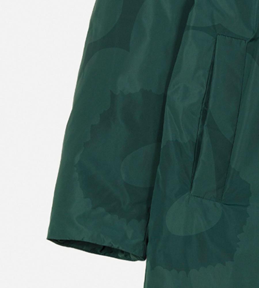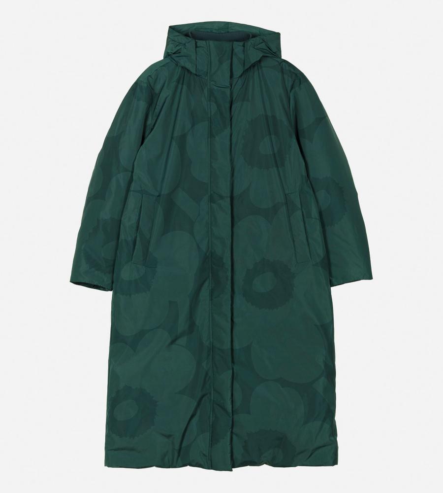 大ぶりなUnikko柄をあしらったフード付きダウンコート。たっぷりのダウン&フェザーを中に詰めており、保温性抜群のアイテムです。膝下までのロング丈と首まわりを覆うハイネックも体を寒さから守ります。装飾を抑えた大人らしいデザインで、カジュアルからキレイめまで様々な着こなしと好相性です。