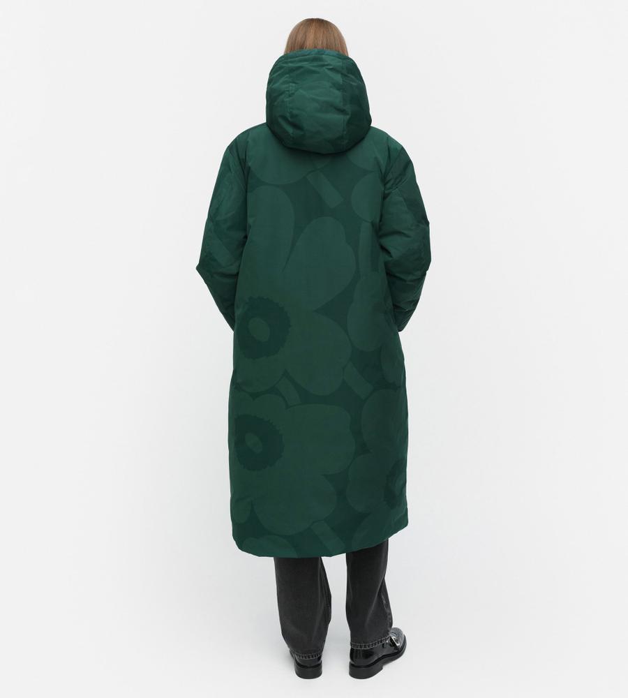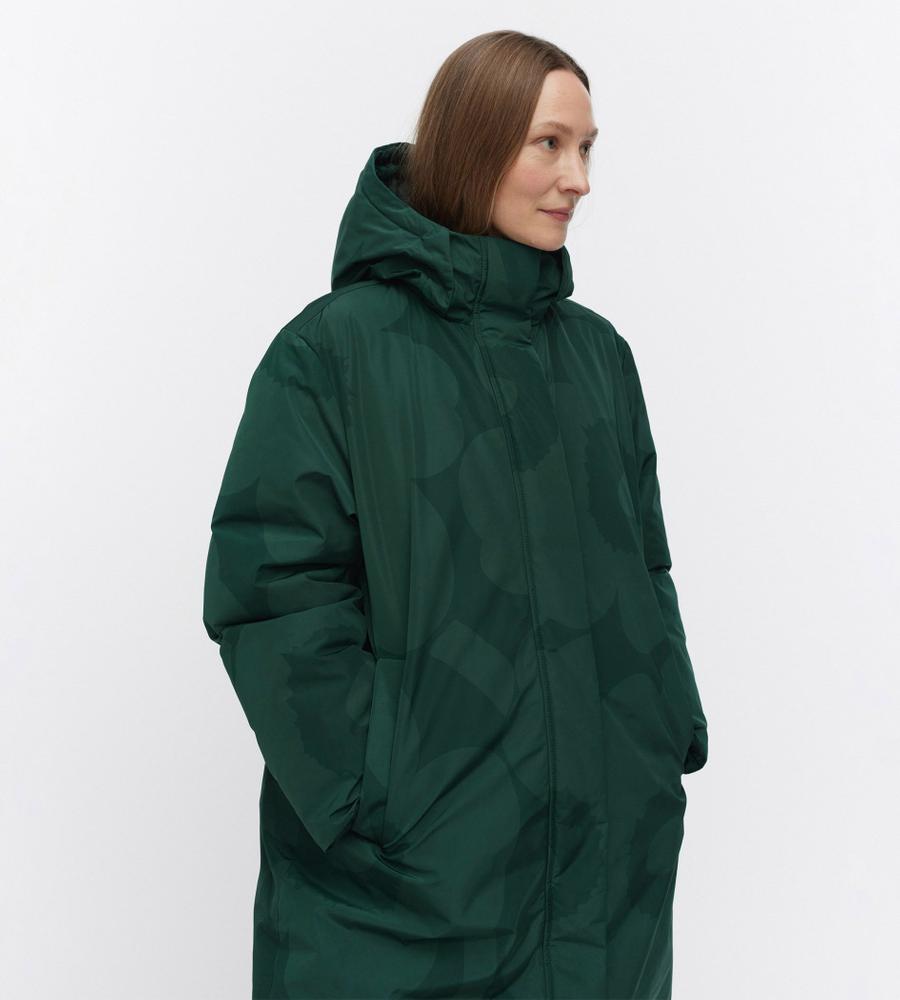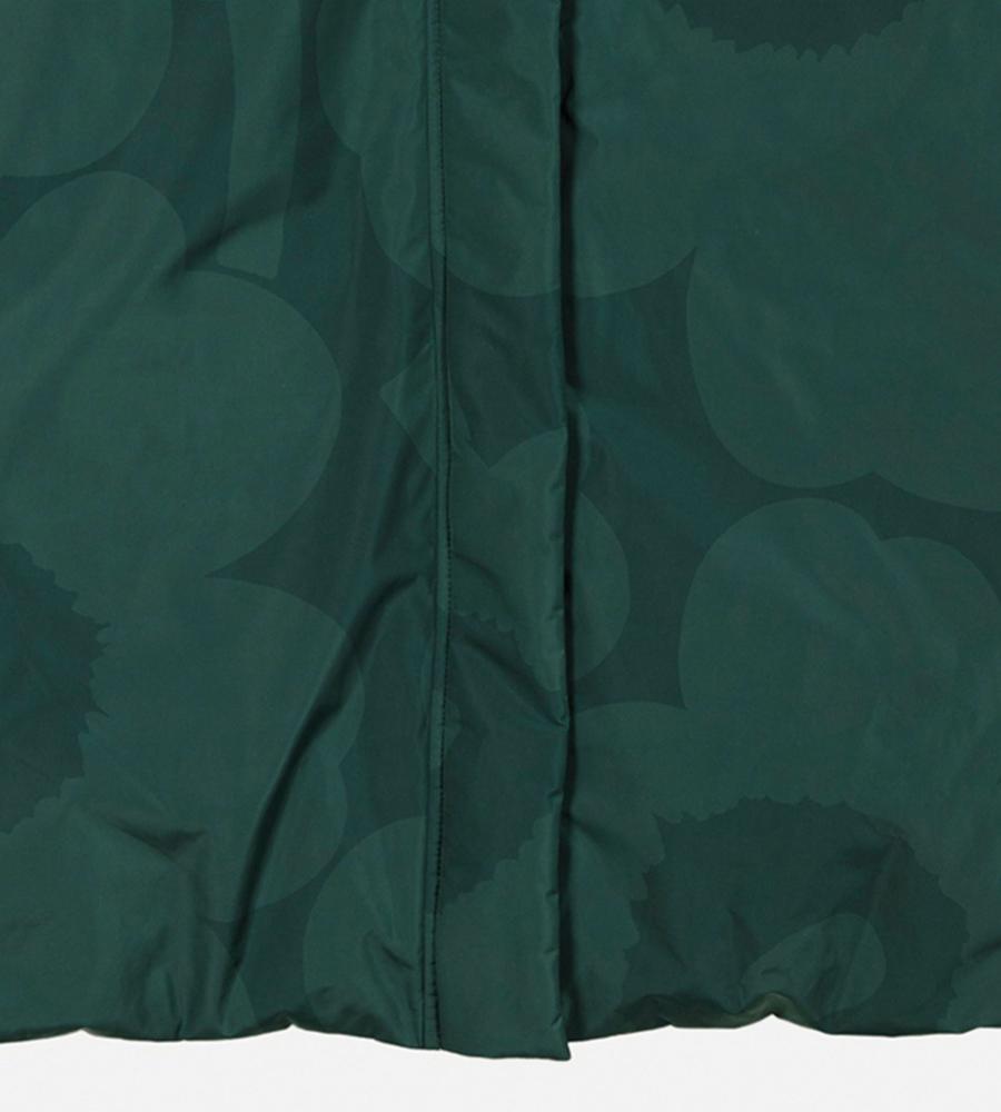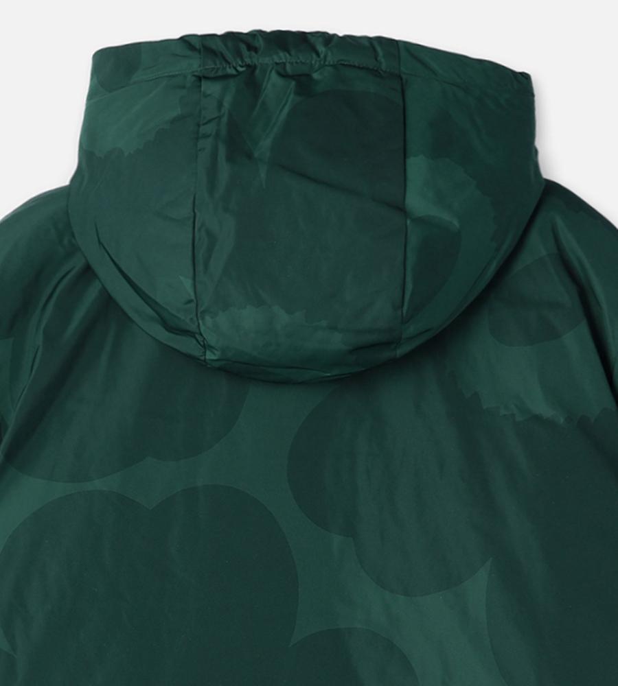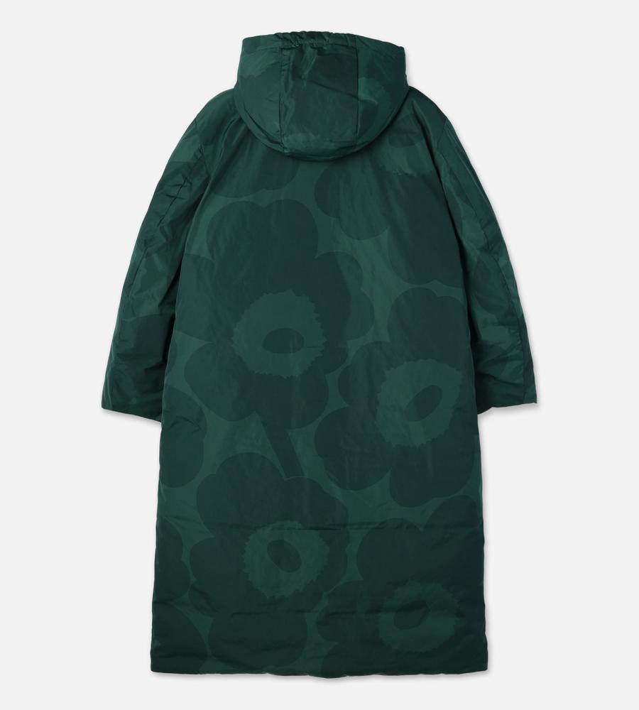 大ぶりなUnikko柄をあしらったフード付きダウンコート。たっぷりのダウン&フェザーを中に詰めており、保温性抜群のアイテムです。膝下までのロング丈と首まわりを覆うハイネックも体を寒さから守ります。装飾を抑えた大人らしいデザインで、カジュアルからキレイめまで様々な着こなしと好相性です。