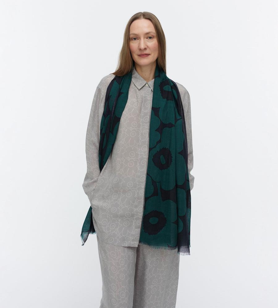 繊細な糸で丁寧に織り上げた、シアーなストールです。薄手なので畳むとコンパクトになり、毎日のお出かけや旅行などへの持ち運びにも便利。大判サイズで使い勝手が良く、ロングシーズン活躍します。シックなバイカラーの「Unikko」柄で、大人な雰囲気を醸しだす一枚です。