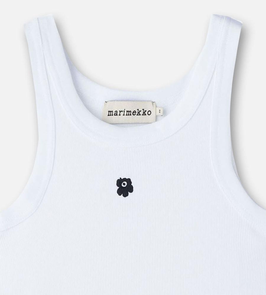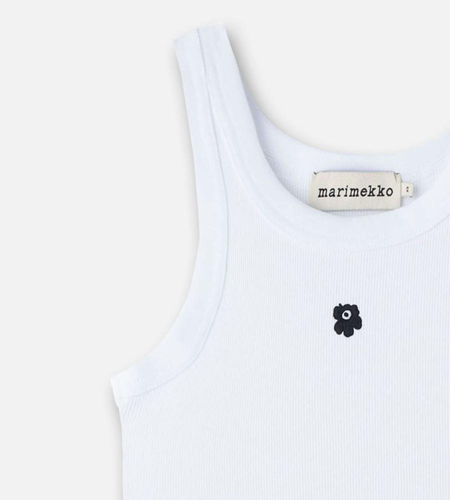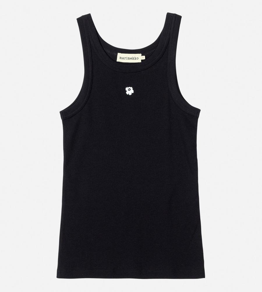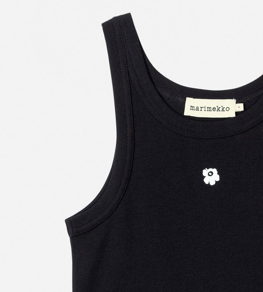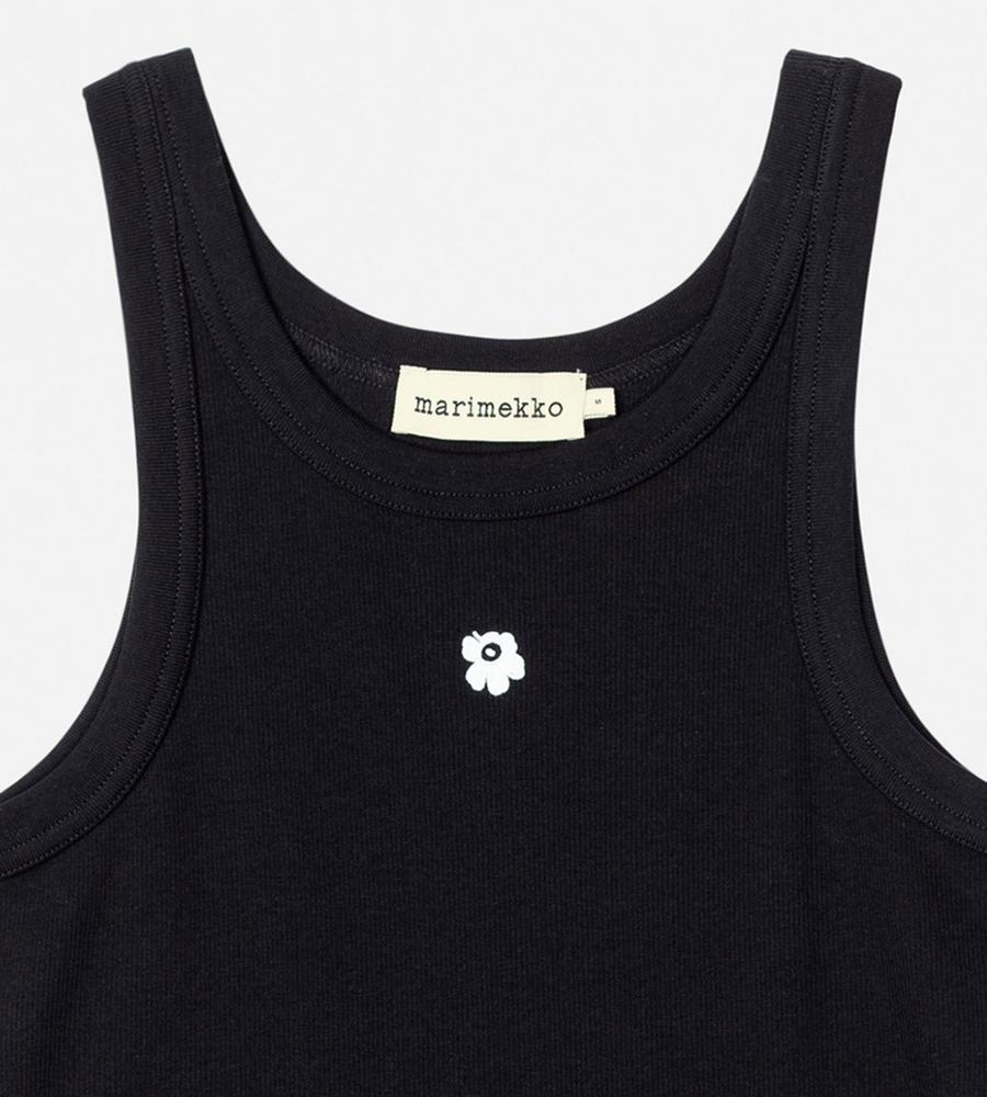 タイトフィットで、女性らしいボディラインを演出するリブタンクトップ。ネックラインとアームはほどよく開き、ヘルシーなスタイルを楽しめます。フロントに小さな、「Unikko」柄の花刺繍をワンポイントであしらったデザインです。シャツやカーディガンのインナーに、ワンピースやサロペット、ジレなどとのレイヤードに、幅広く活躍します。