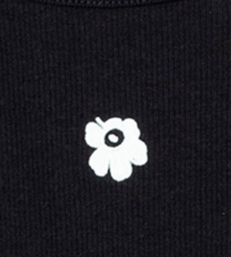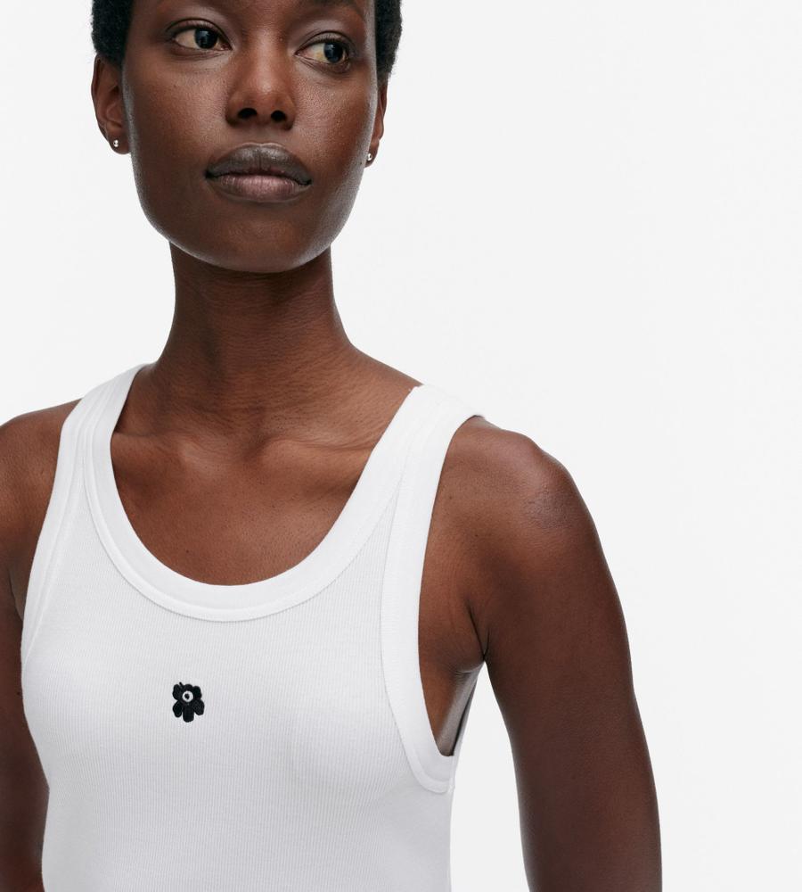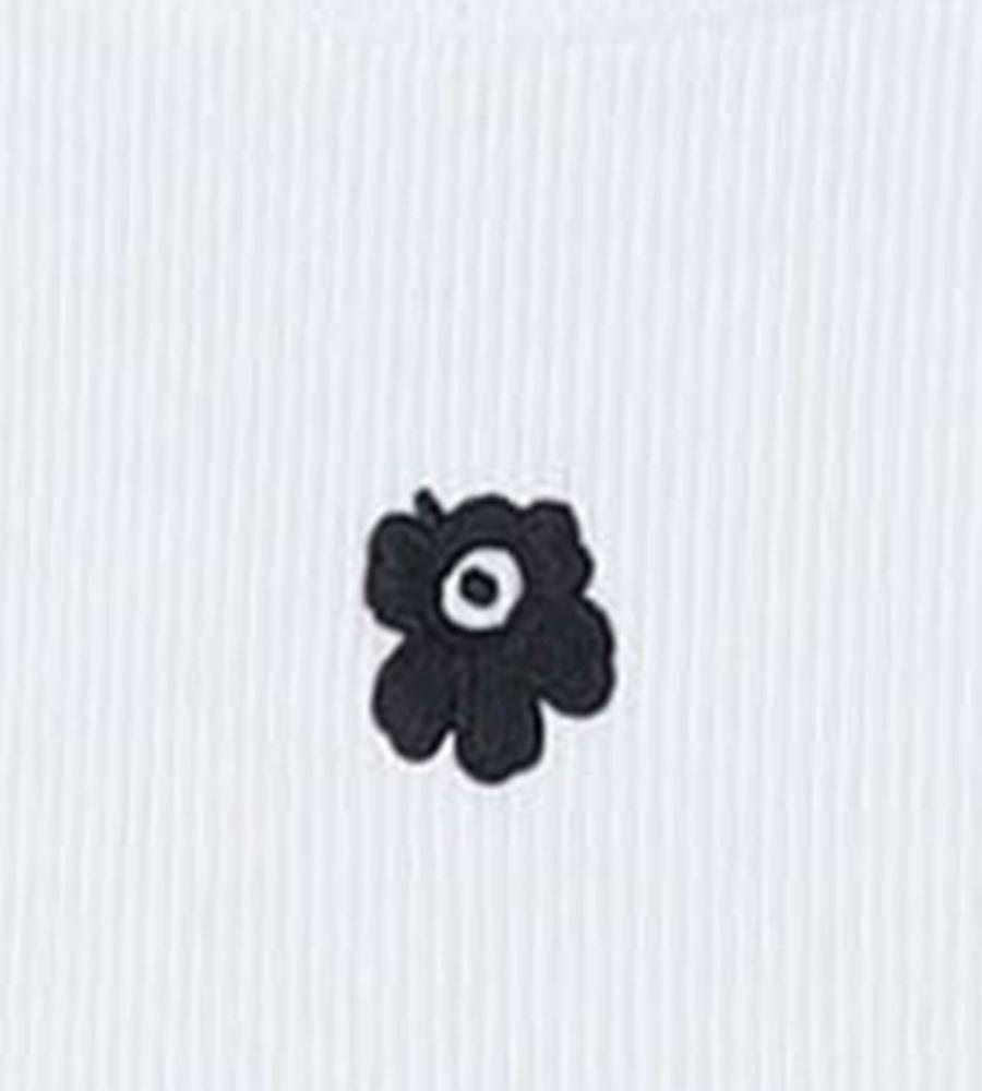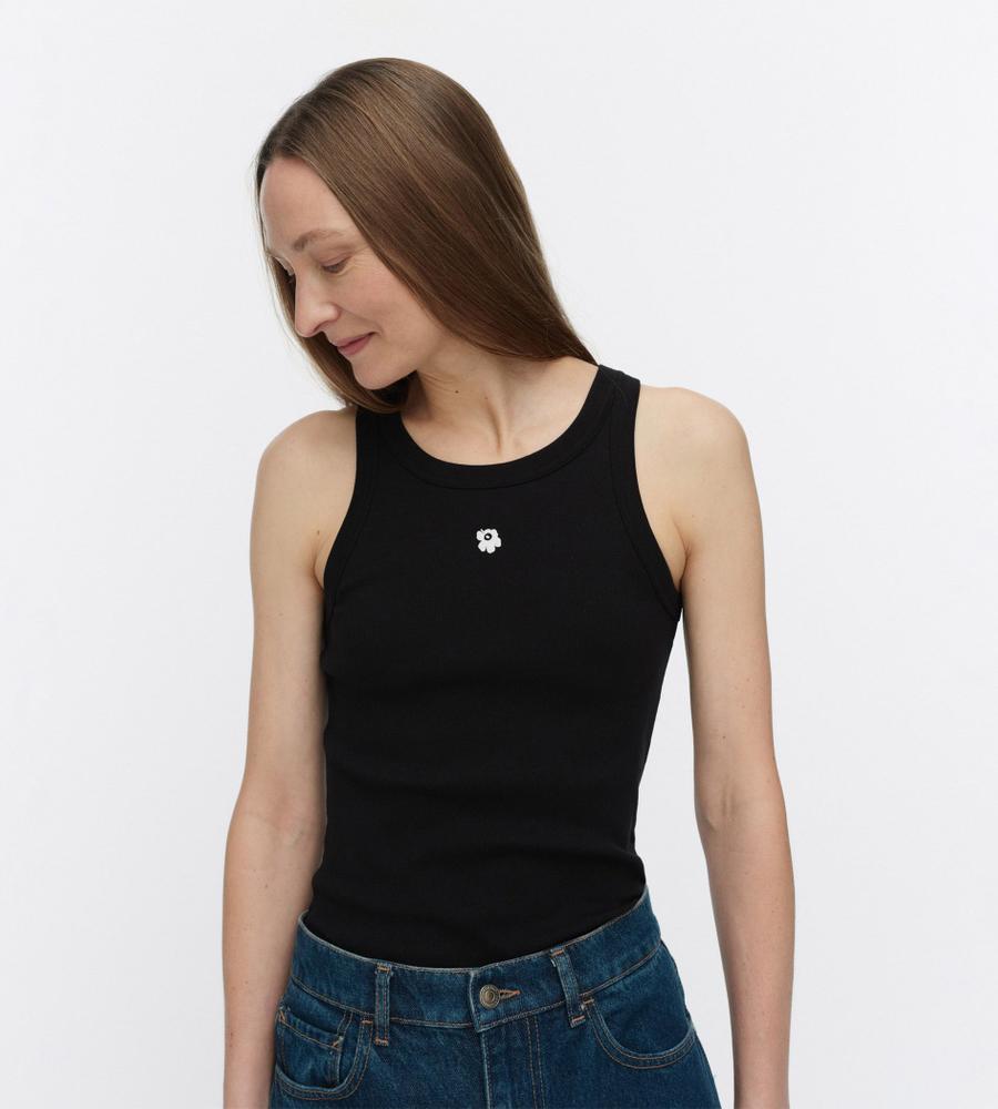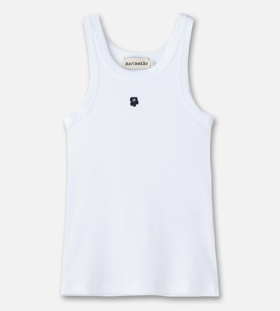 タイトフィットで、女性らしいボディラインを演出するリブタンクトップ。ネックラインとアームはほどよく開き、ヘルシーなスタイルを楽しめます。フロントに小さな、「Unikko」柄の花刺繍をワンポイントであしらったデザインです。シャツやカーディガンのインナーに、ワンピースやサロペット、ジレなどとのレイヤードに、幅広く活躍します。