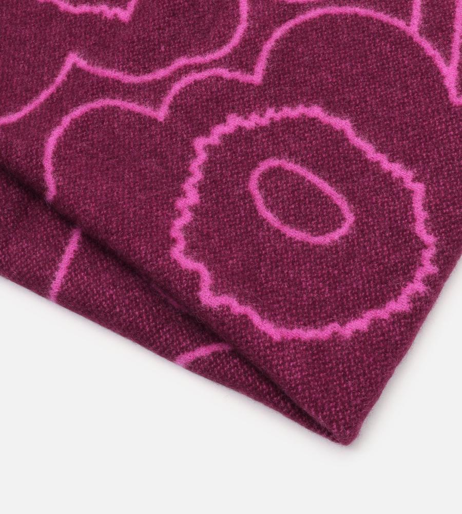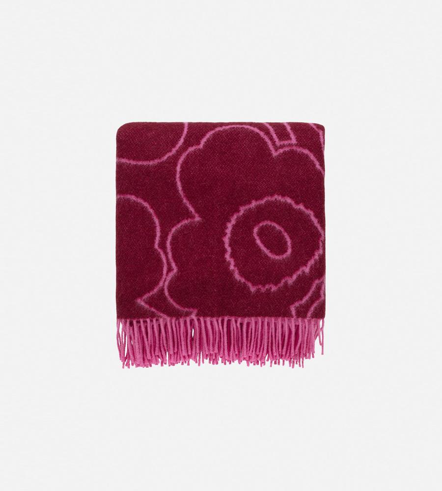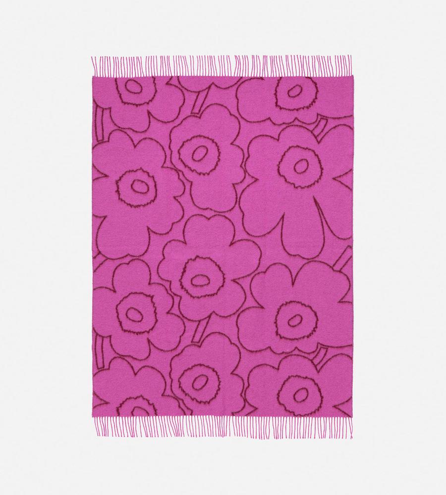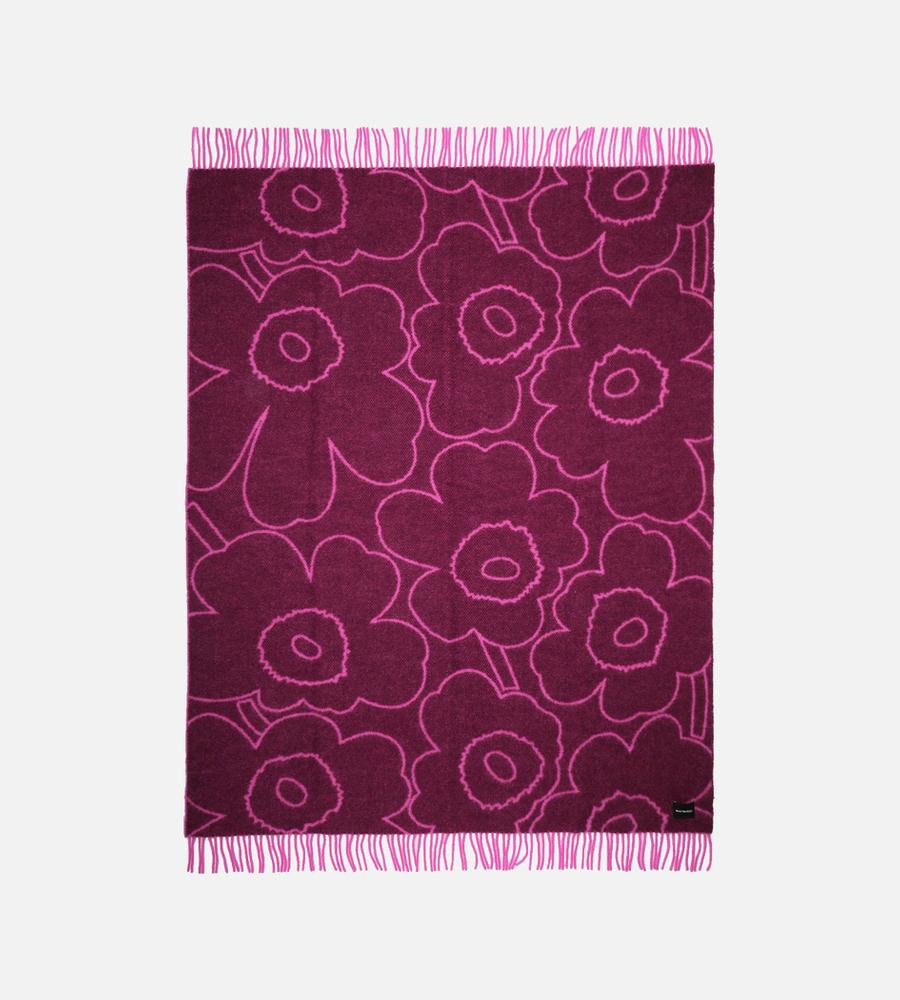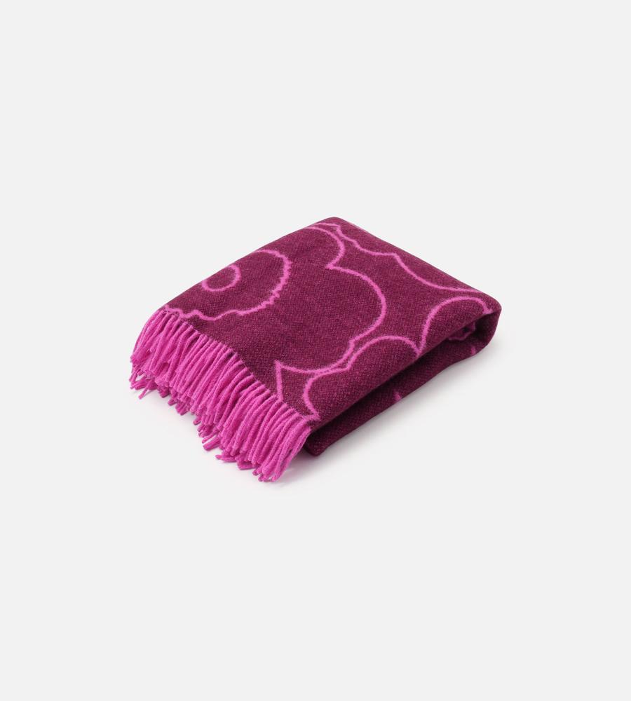 Unikko柄のブランケット (130×170cm)。フラワーモチーフをラインで表現したスタイリッシュなデザイン。毛100%のあたたかな生地感で秋冬シーズンにぴったり。表と裏の異なるカラーを楽しめるデザイン。裾のフリンジも華やかなデザインアクセント。インテリアコーディネートが明るくなるアイテムです。