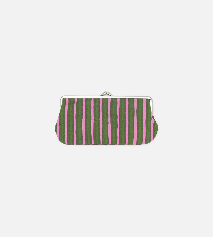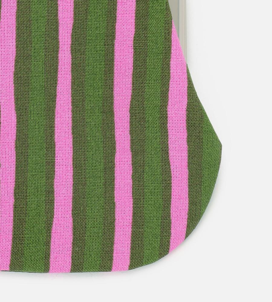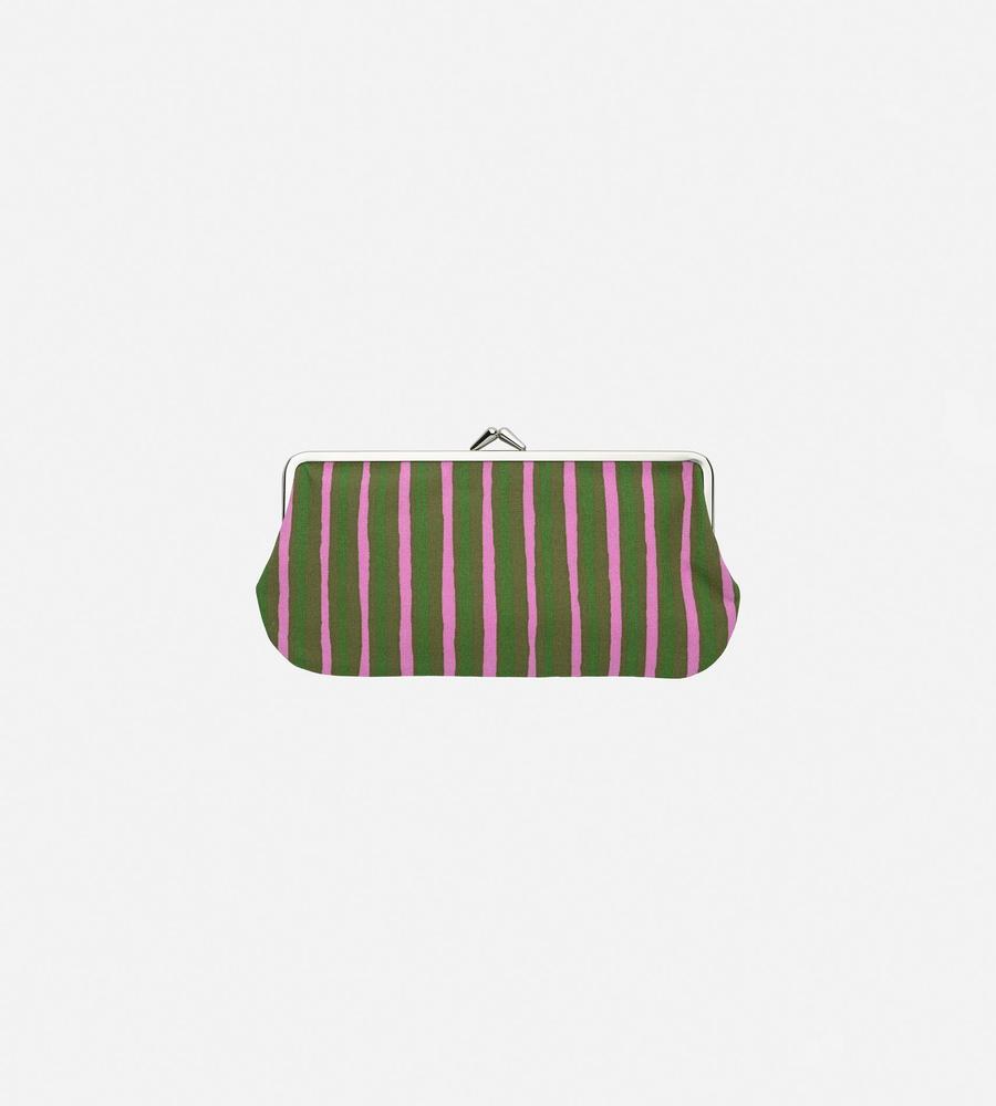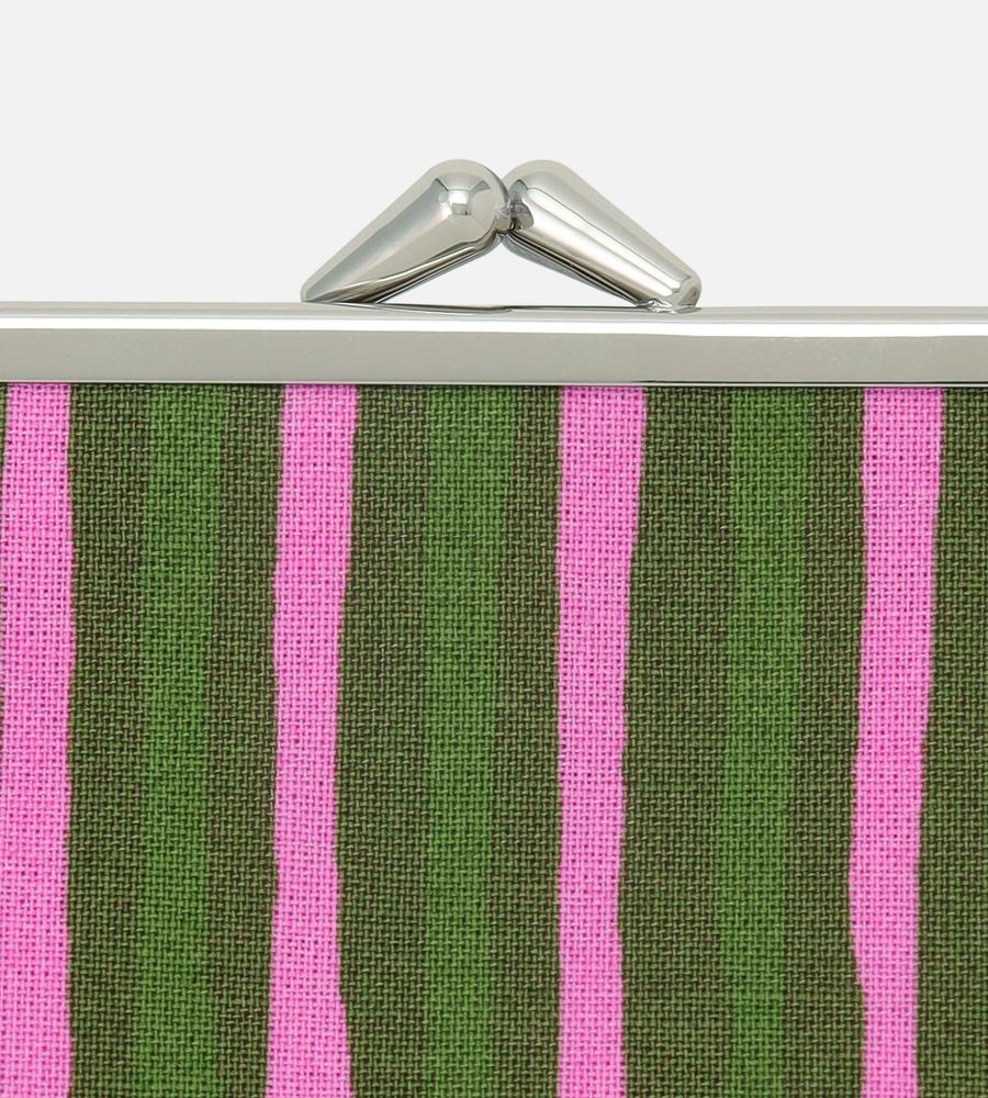 ビビッドなストライプ柄が元気を分けてくれそうなポーチ。横長のフォルムは、メイク道具を収納したいときにも便利。気負わないのにどこかラグジュアリーなデザインで、長く愛用したくなる一品です。