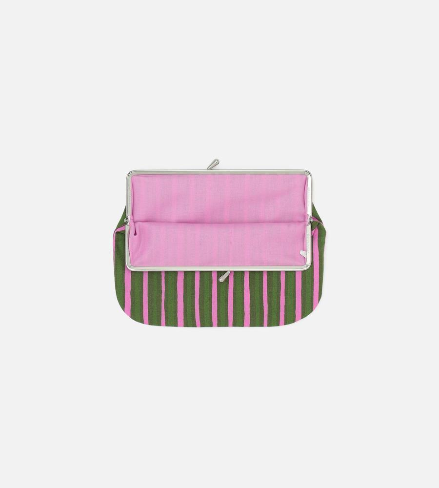ビビッドカラーのストライプ柄がスタイリッシュなポーチ。メイクポーチとしてはもちろん、バッグの中の仕分けにも活躍しそう。気負わないのにどこかラグジュアリーなデザインで、長く愛用したくなる一品です。