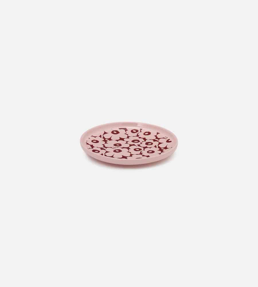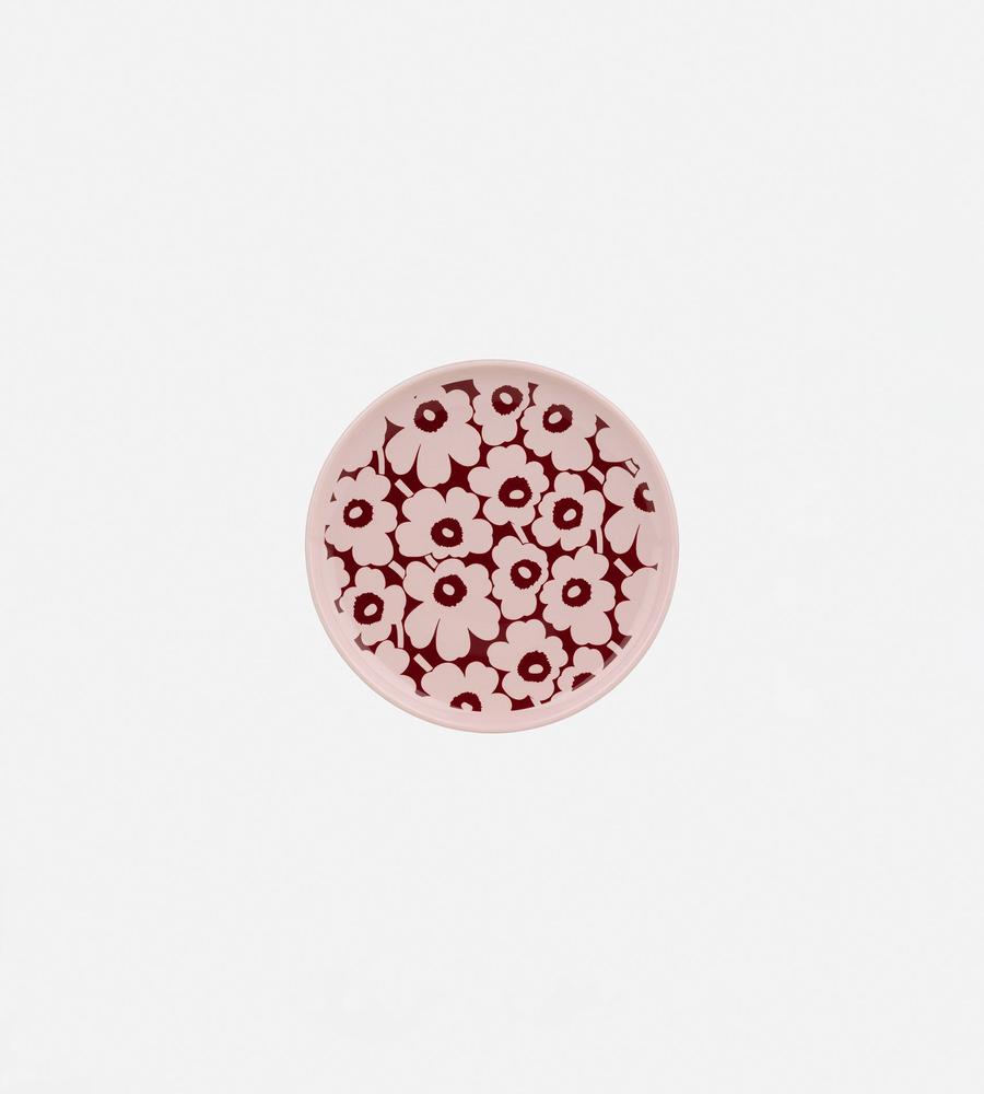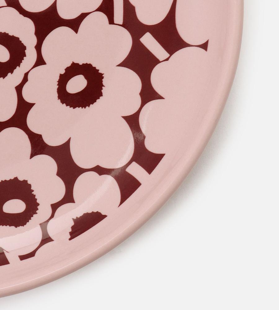 ピンクとワインのツートンカラーが愛らしいUnikko柄プレート。やや小ぶりのサイズは、副菜やスナックタイムにも活躍しそう。置くだけでテーブルがモダンに華やぐ一枚です。