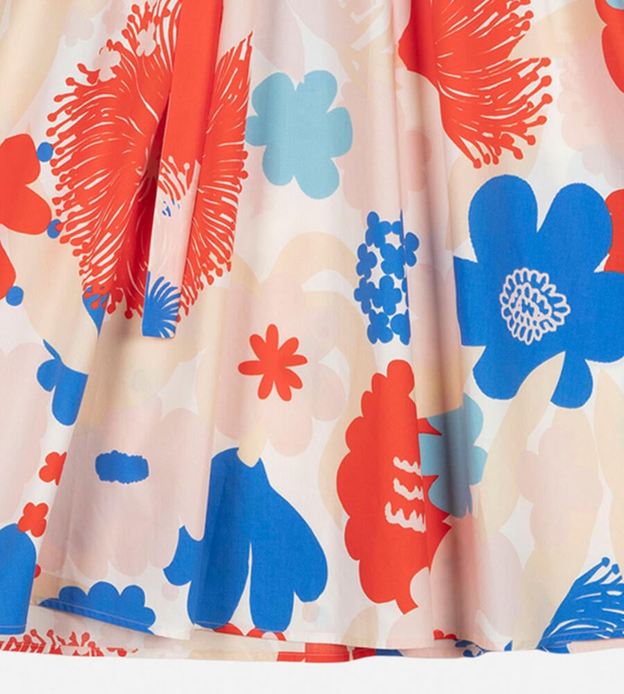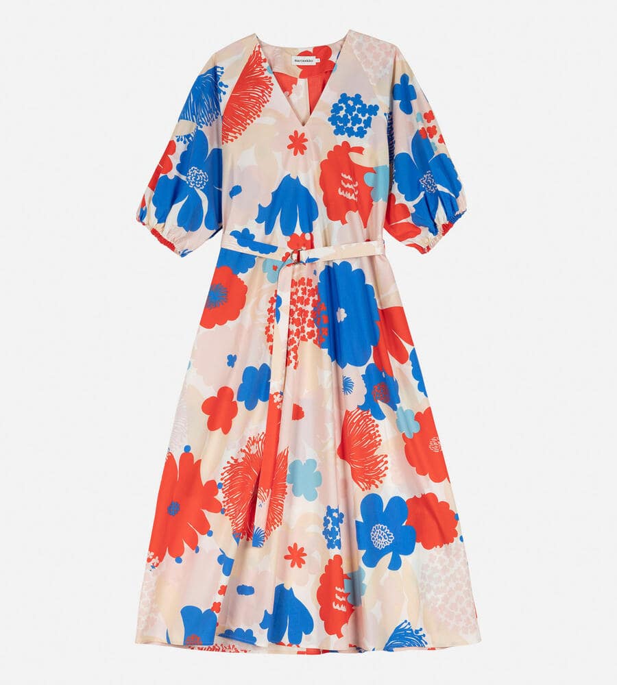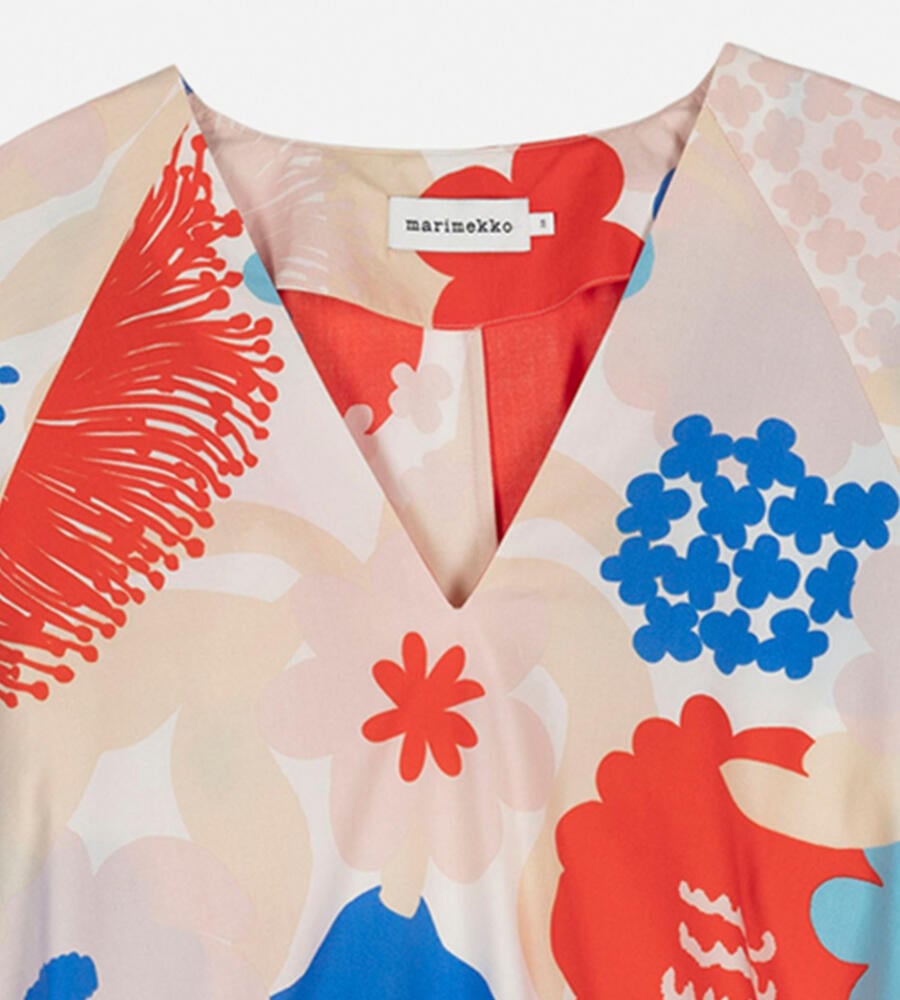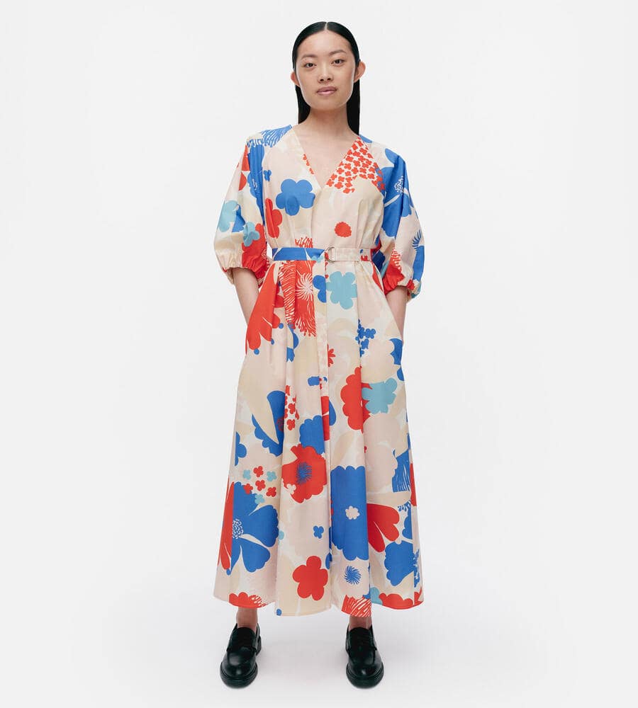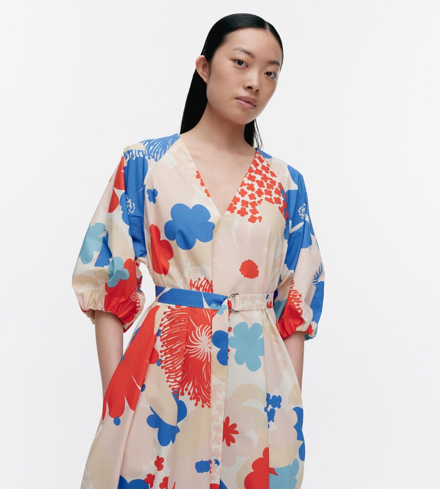 夏の花束を意味するSuvikimppu柄が色鮮やかなワンピース。ゆったりとしたフィット感と裾に向かって広がるAラインがフェミニンなシルエット。ボリュームのあるラグランスリーブもスタイリッシュなデザインポイント。絵の具で描かれたフラワープリントが目を惹く、華やかなデザインのアイテムです。