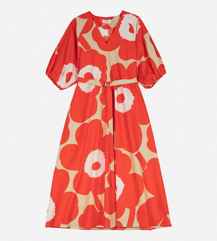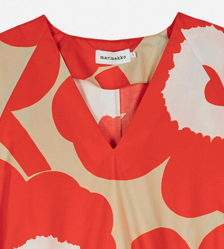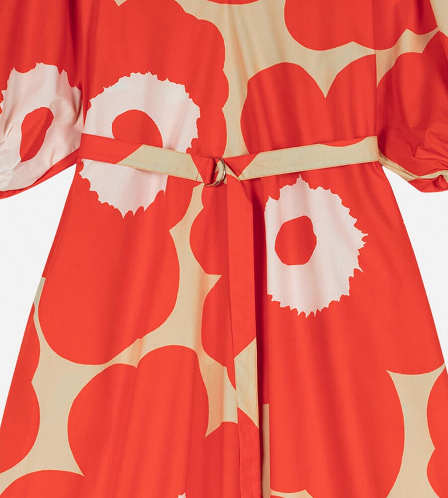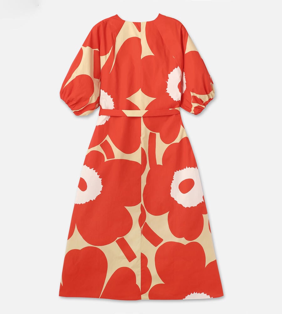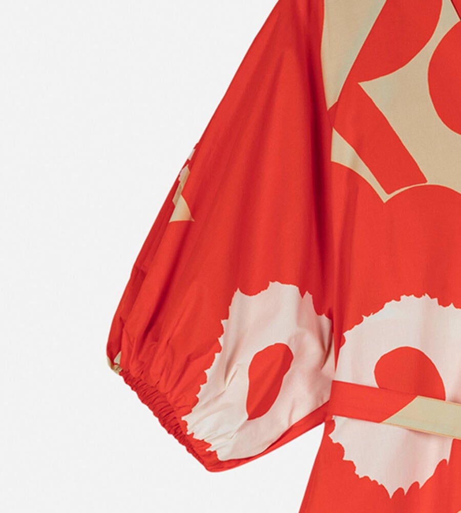 レッド×ブラウン×オフホワイトで展開したUnikkoパターンのVネックロングワンピース。裾に向かって優美に広がるAラインシルエット。ボリュームのあるスリーブデザインが特徴です。独立したDリングベルトは、お好みでオンオフのアレンジが可能です。サイドシームポケット付き。
