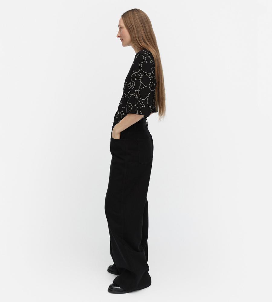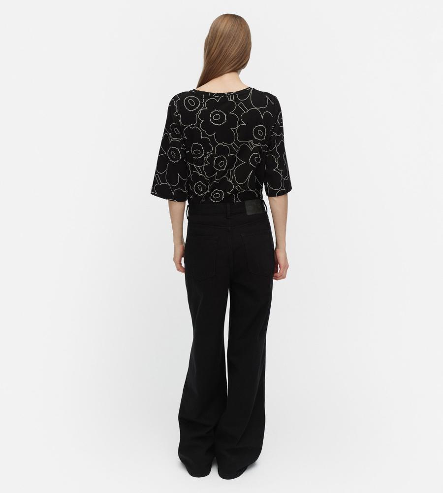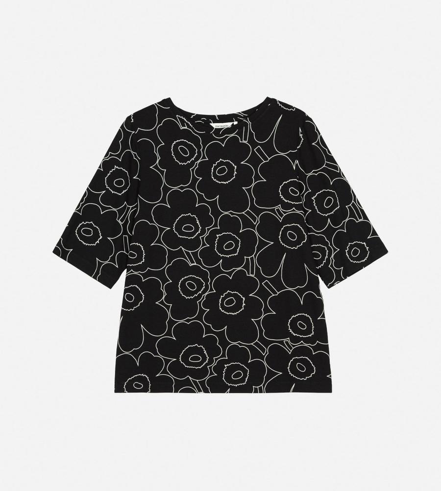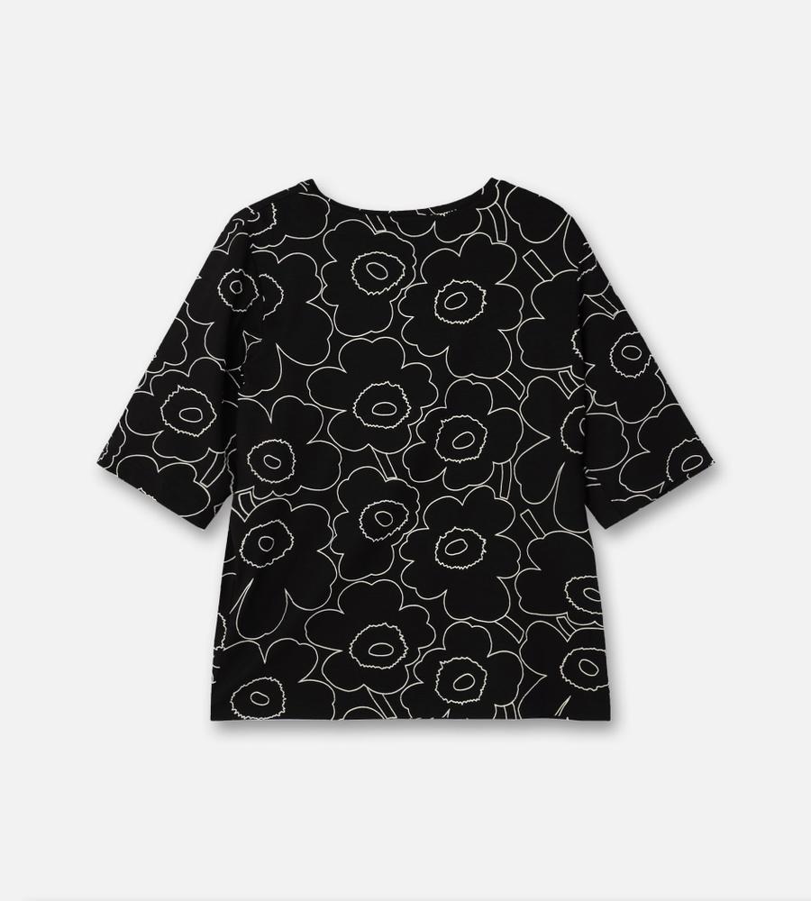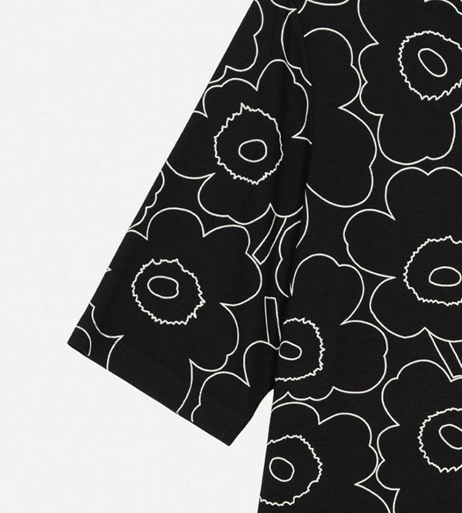 黒ベースのUnikko柄がクールなTシャツ。つかず離れずのシルエットで着心地良く、スマートな着こなしが可能に。長めの5分袖も、ロングシーズン活躍するポイントです。