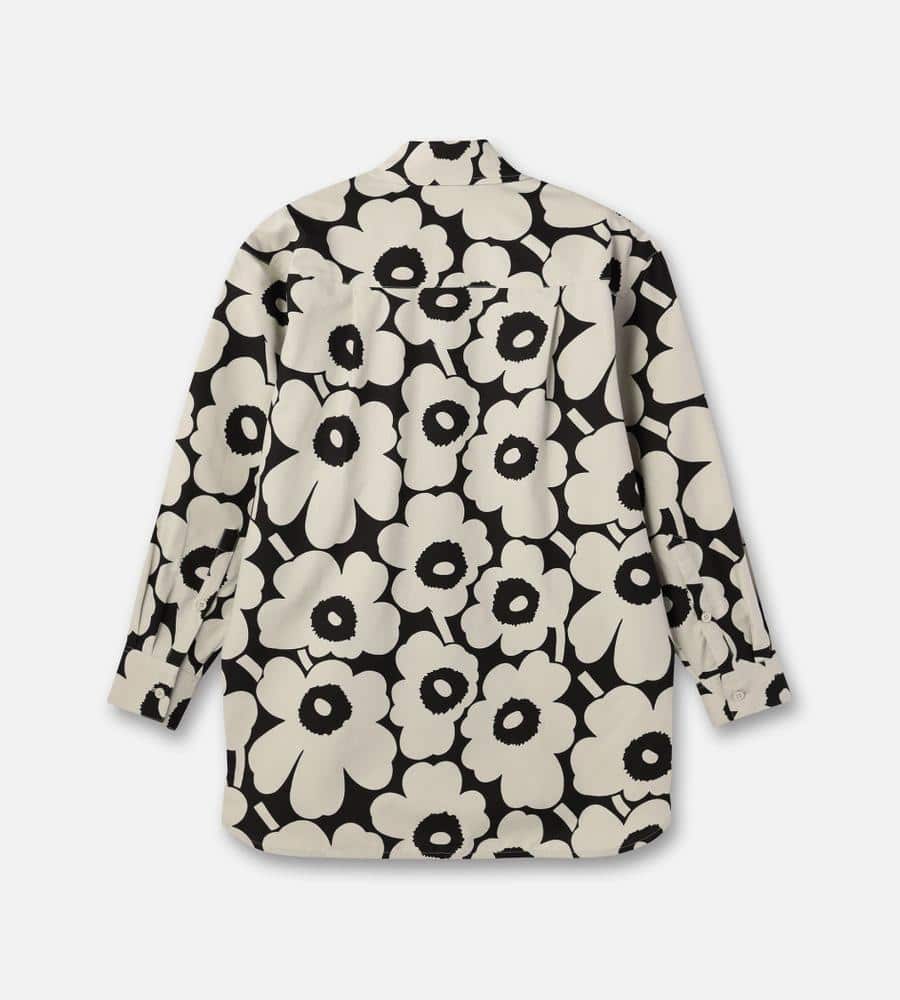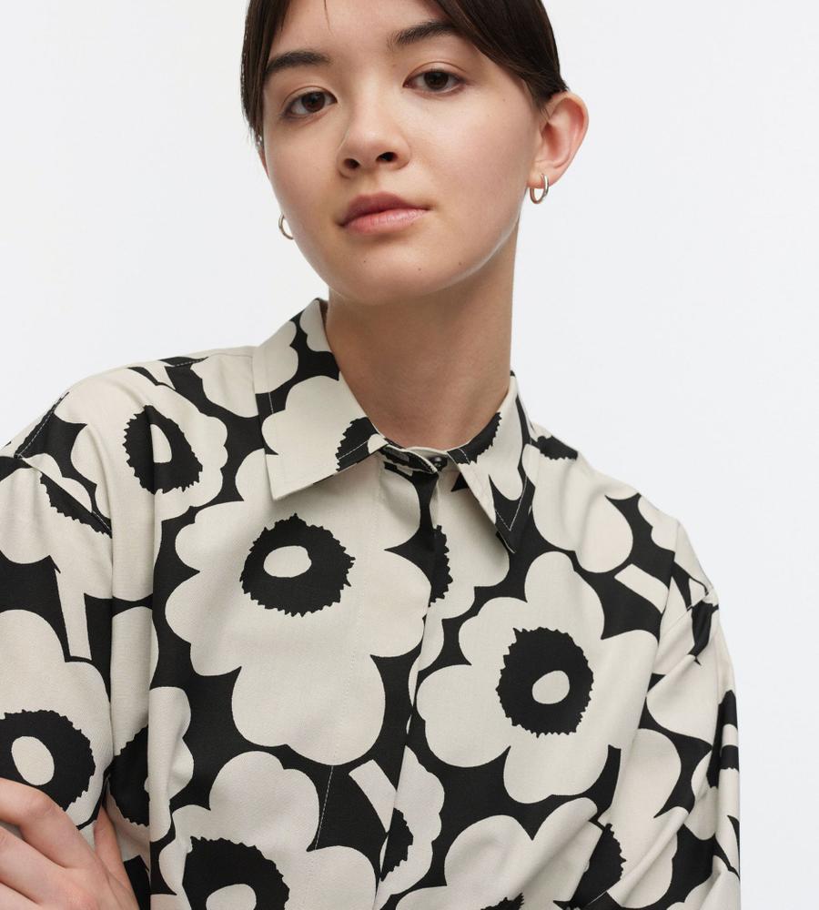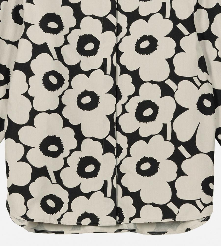 Marimekkoを代表するUnikko柄の長袖シャツ。コントラスのあるフラワーモチーフの総柄が華やかなデザイン。ゆったりとしたストレートフィット、サイドスリットがモダンなシルエット。ボタンの見えない比翼仕立てのすっきりとしたフロントも特徴。お手持ちのボトムに合わせてスタイリッシュな着こなしが決まります。