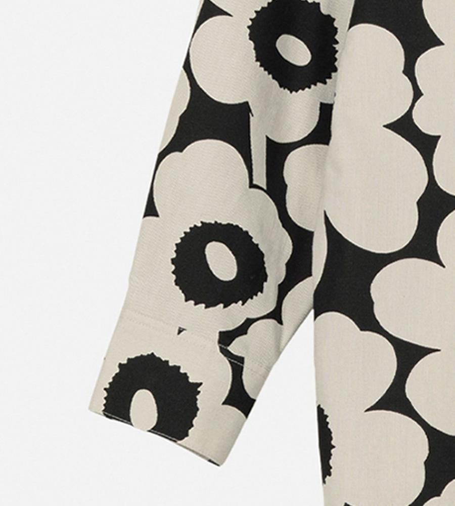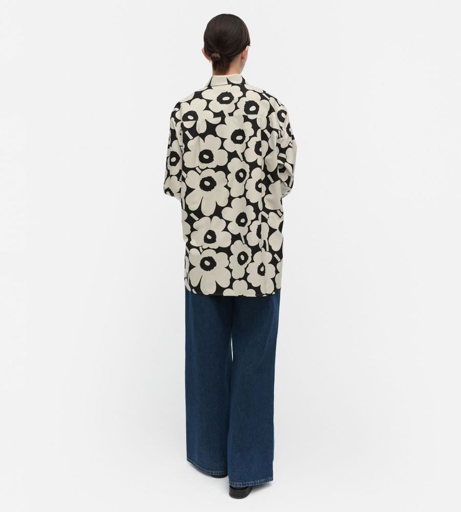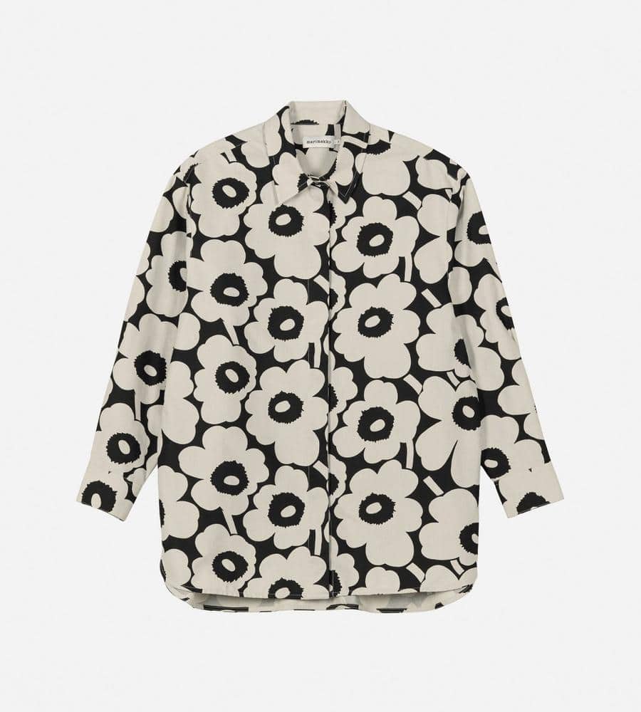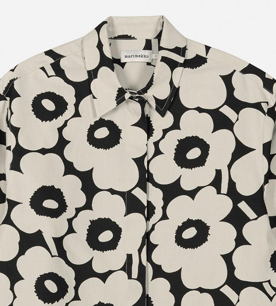 Marimekkoを代表するUnikko柄の長袖シャツ。コントラスのあるフラワーモチーフの総柄が華やかなデザイン。ゆったりとしたストレートフィット、サイドスリットがモダンなシルエット。ボタンの見えない比翼仕立てのすっきりとしたフロントも特徴。お手持ちのボトムに合わせてスタイリッシュな着こなしが決まります。