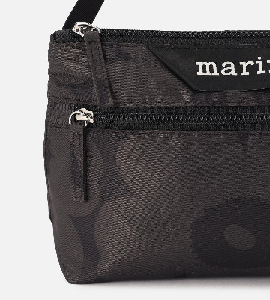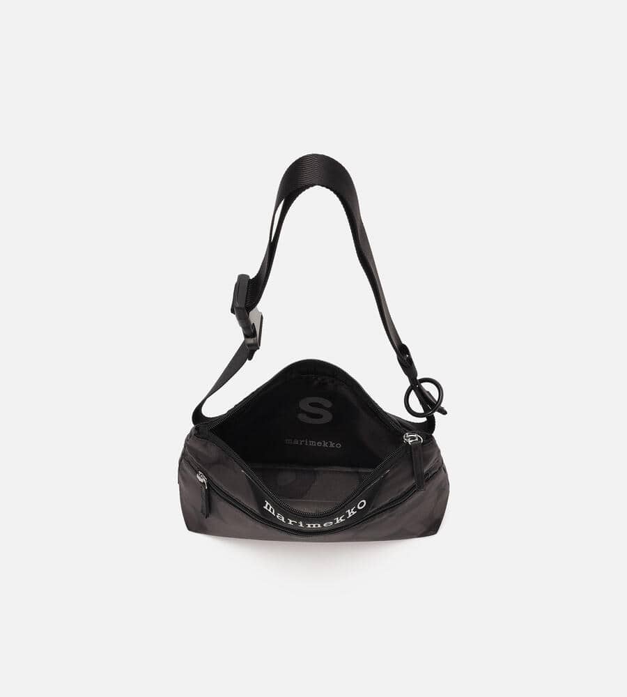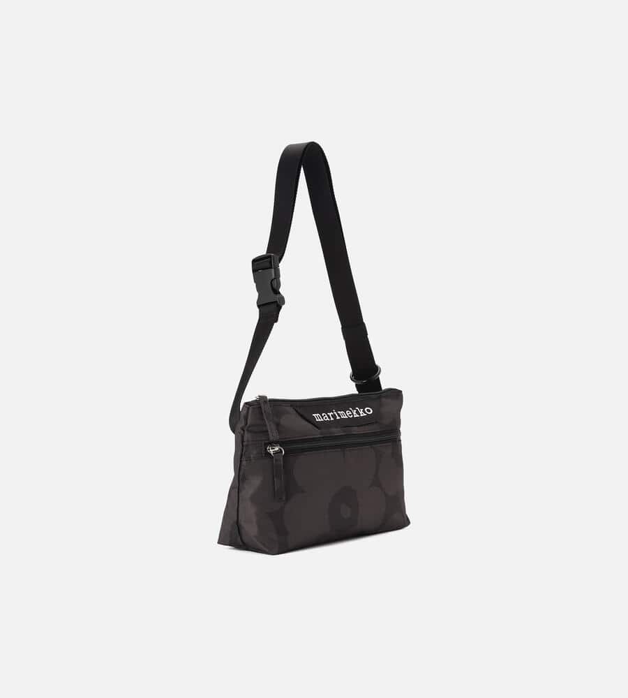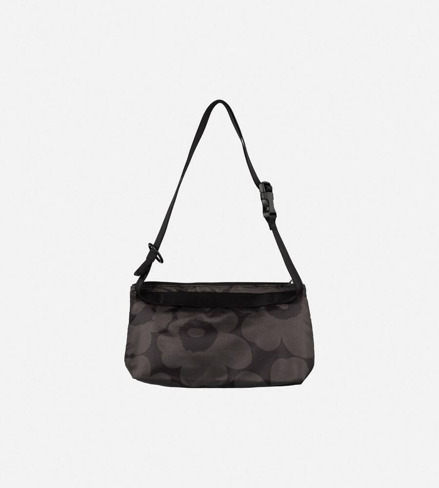軽やかで扱いやすいポリエステル生地のショルダーバッグです。カジュアルながら、ダークグレー×グレーのUnikko柄がシックな印象。やや小ぶりなサイズ感で、ちょっとした外出やアクティブなシーンにぴったりなアイテムです。間口はファスナー仕様で中身をしっかりカバー。ショルダーストラップは長さ調整可能です。