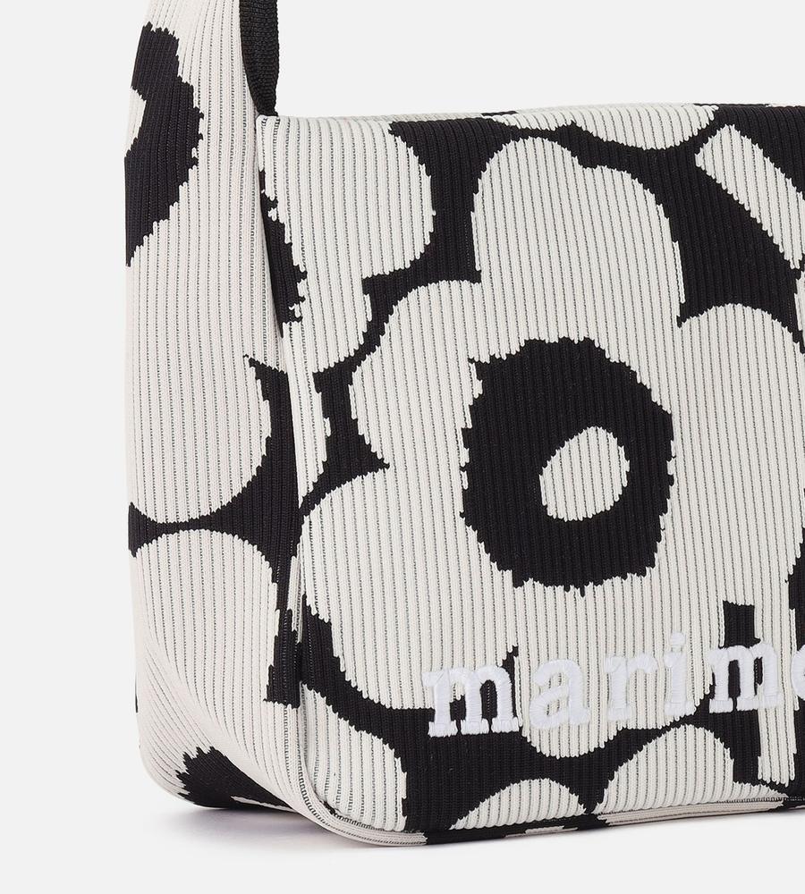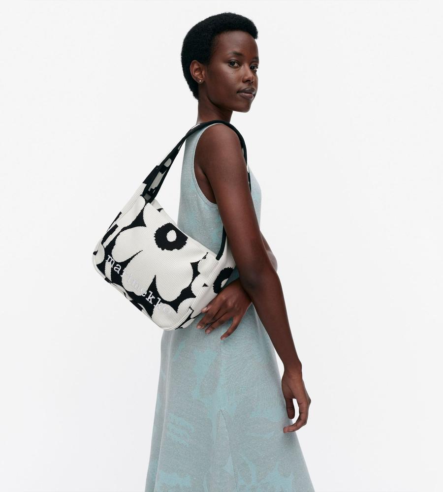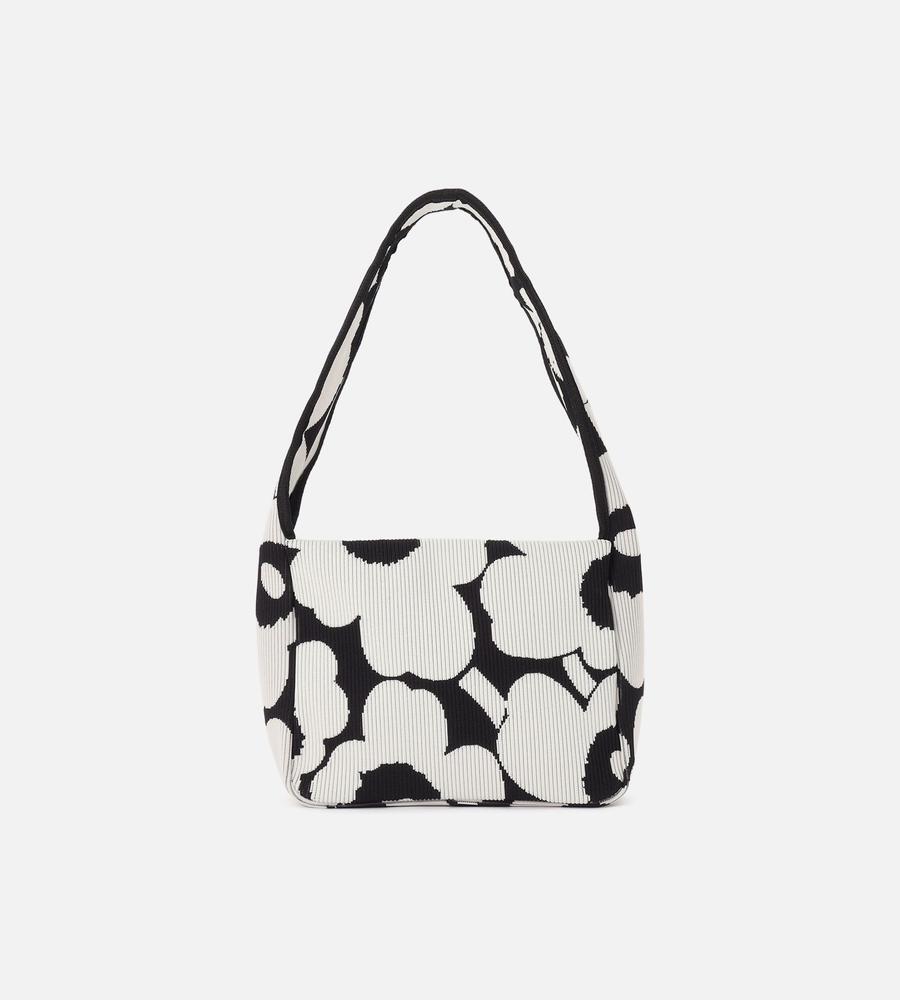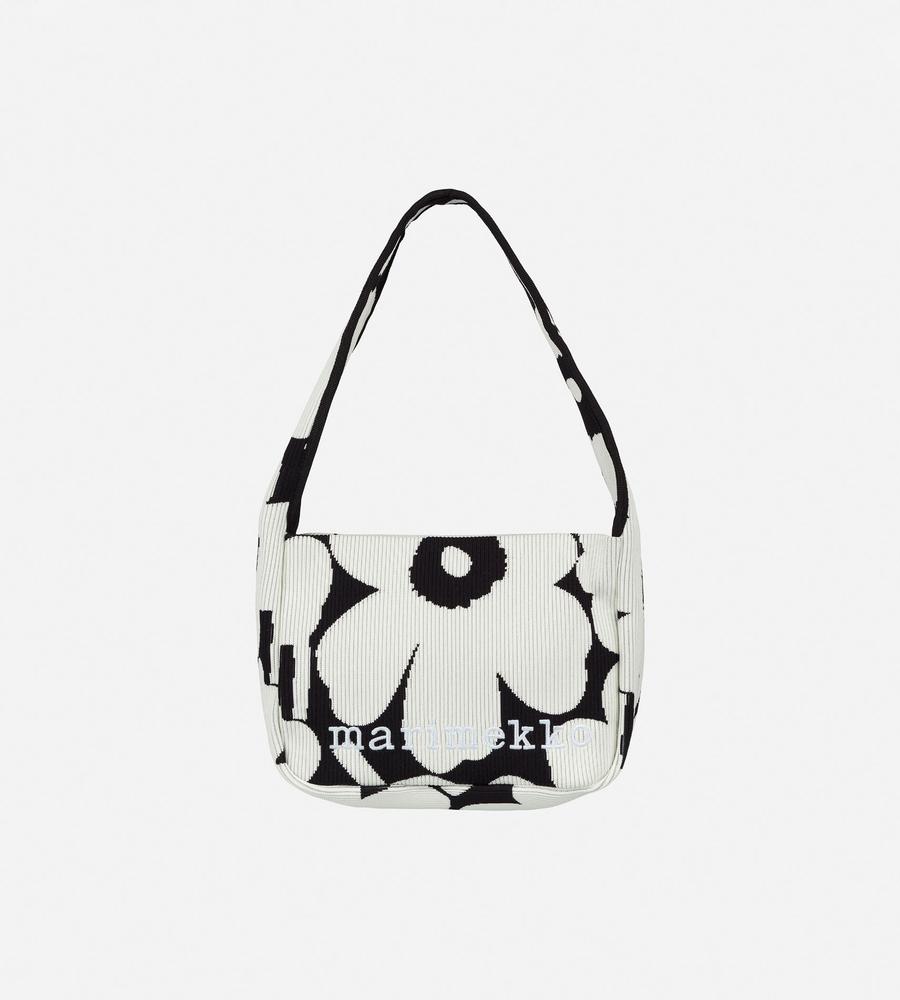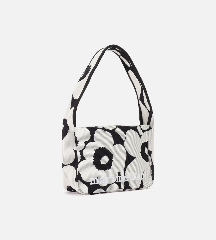 リブのような厚みと凹凸を持つニット素材を用いたショルダーバッグ。Unikko柄を用いることで、コーディネートに華やかなアクセントを加える1点です。肩に掛けると脇にぴったりと収まるサイズ感。マチのある四角いフォルムには、スマートフォンやお財布などの小物がすっきり収納できます。