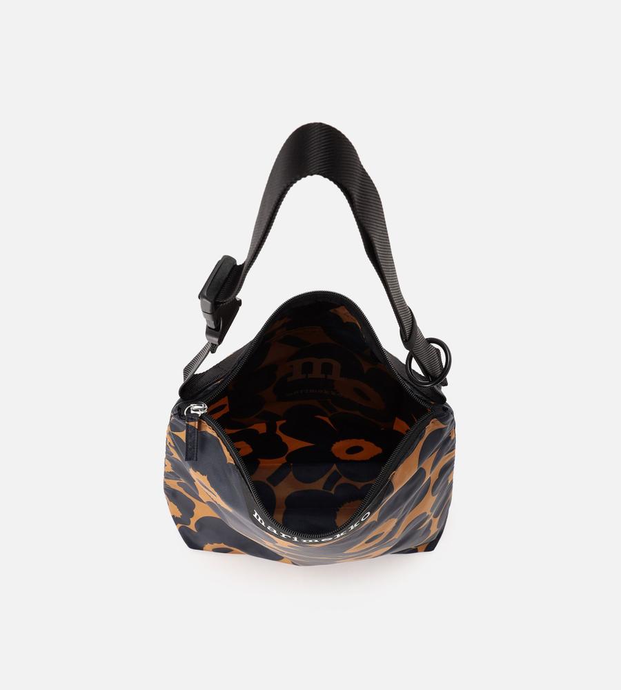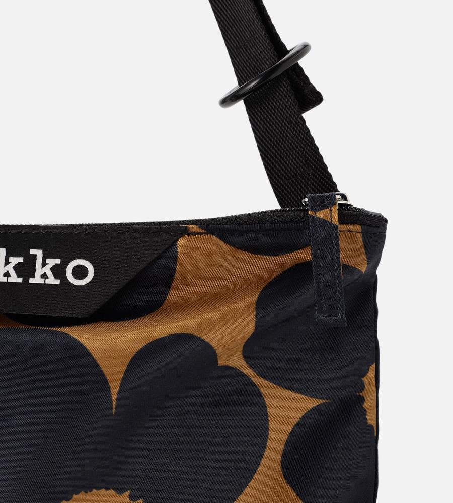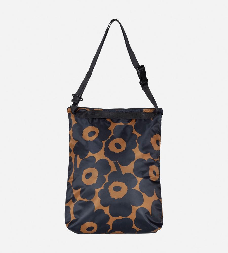 シックな色使いのUnikko柄で、コーディネートを大人らしく引き締めるショルダーバッグ。軽くて丈夫なポリエステル×ナイロン素材を用いています。ショルダーのほか、手提げとしても持てるハンドル付き。ノートや書類、タオルなどもしっかり収まる大きめの作りで、多彩なシーンに活躍します。