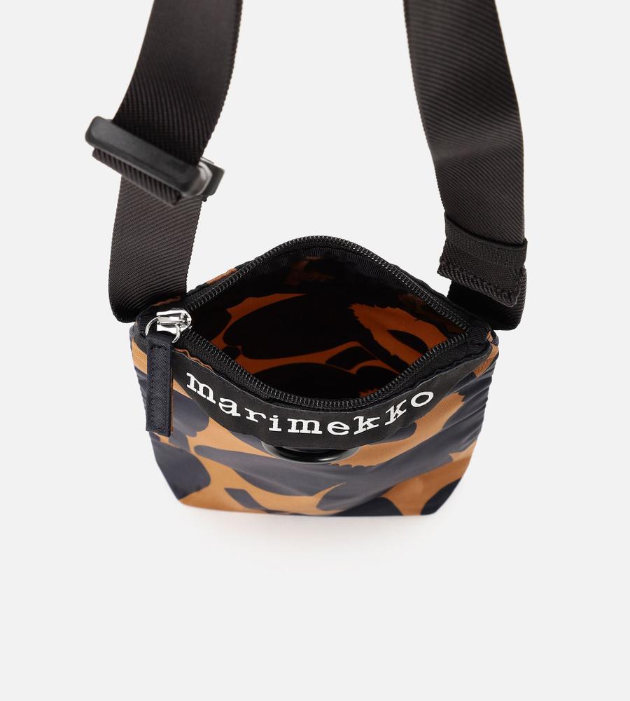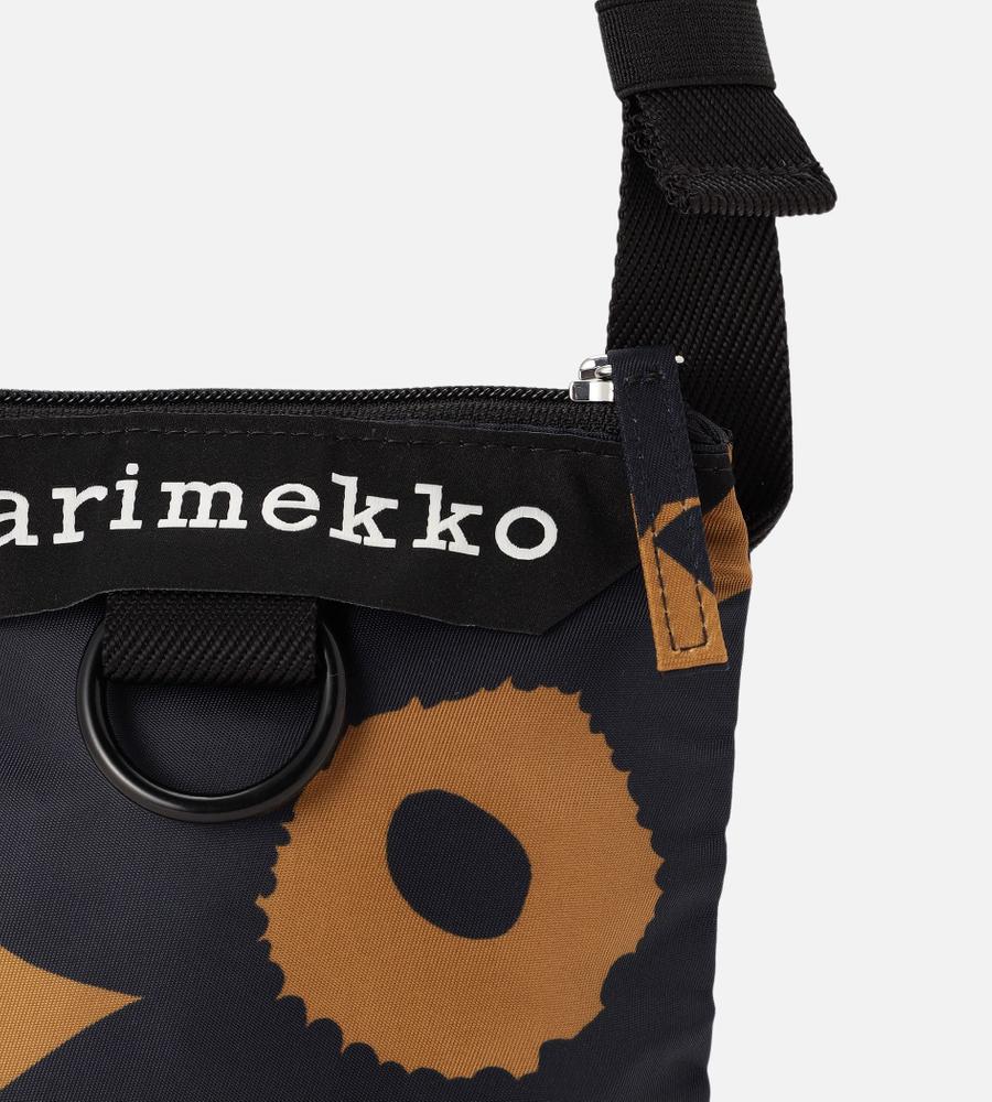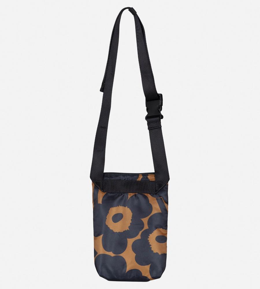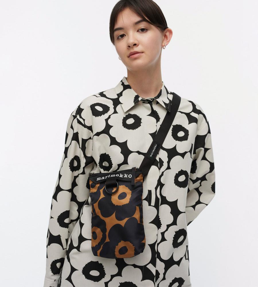 シックな色使いのUnikko柄で、コーディネートを大人らしく引き締めるショルダーバッグ。スマートフォンやミニウォレットなど、肌身離さず身に着けておきたいものがスマートに収まるサイズです。斜め掛けした時のフィット感の良さも満点で、アクティブに動きたいシーンにも最適。ストラップは長さの調節も可能です。