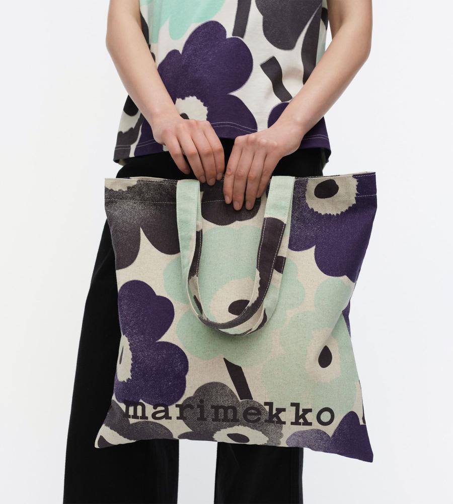 Unikko柄が華やかなデザインのトートバッグ。カラフルなフラワーモチーフの掠れ風プリントがスタイリッシュなデザイン。大きめのブランドロゴもアクセント。使いやすいサイズ感とコンパクトに畳める布製で、メインバッグからセカンドバッグまで様々な使い方が可能。デイリーに活躍するアイテムです。