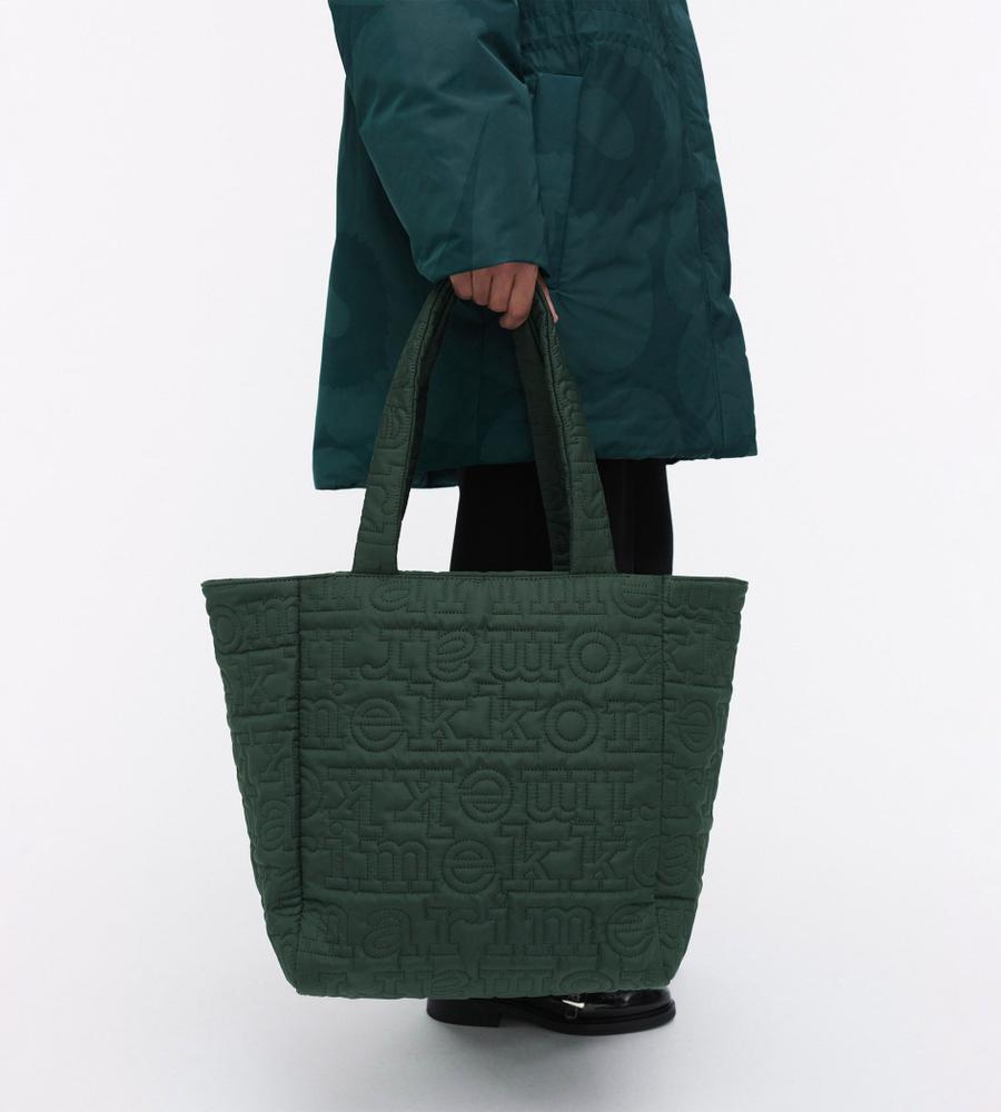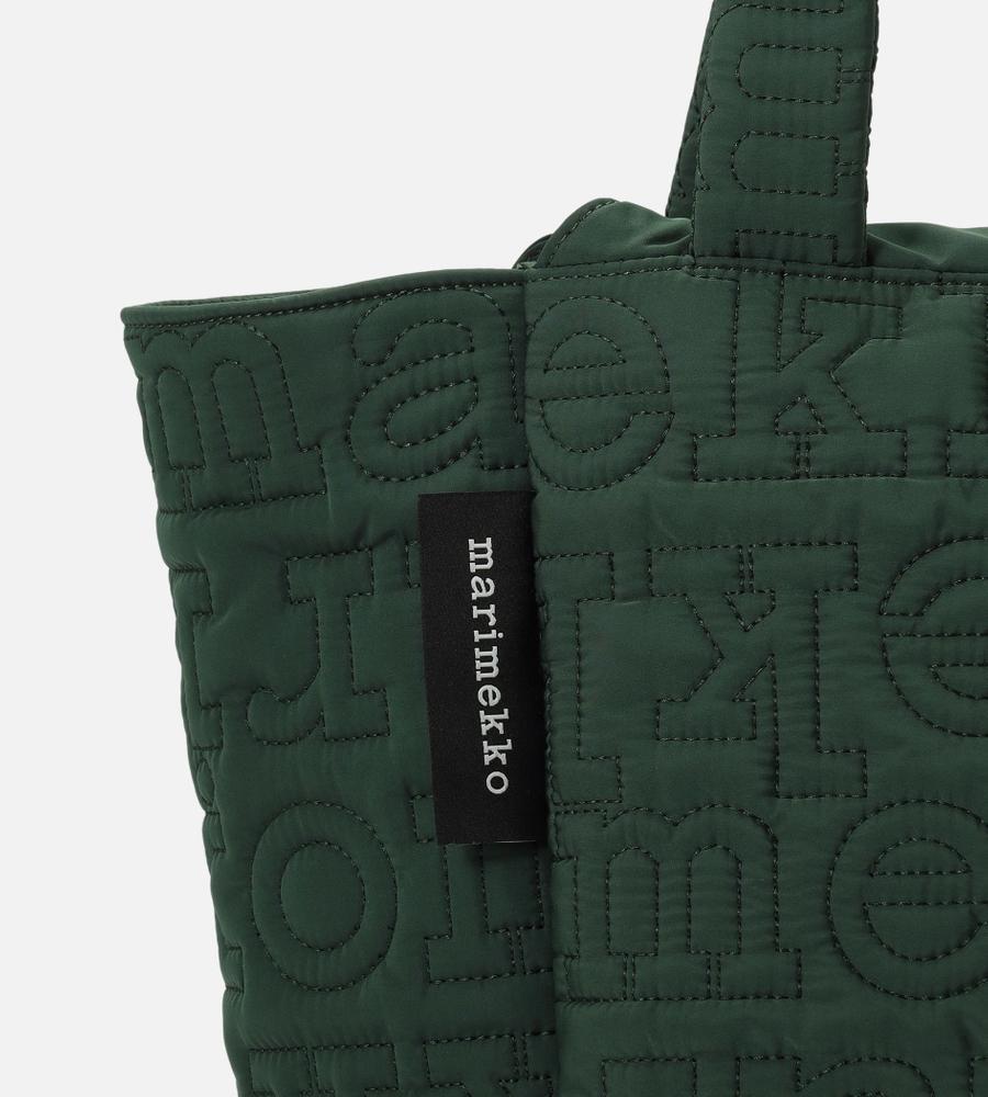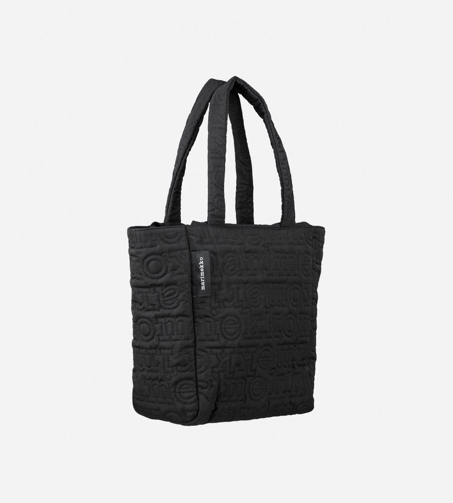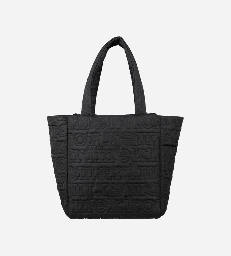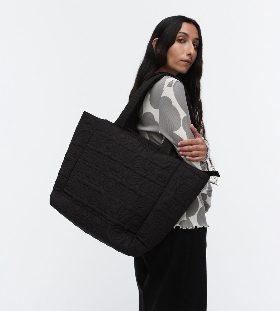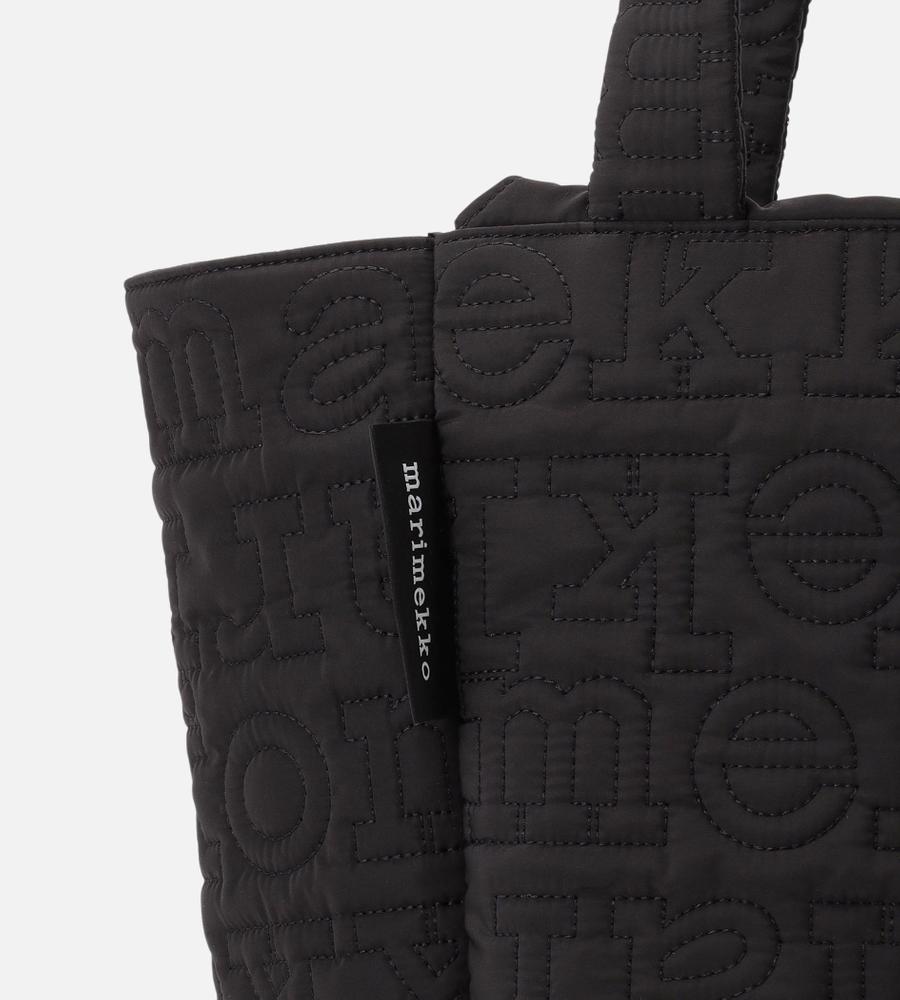 Marimekkoロゴを散りばめたキルティングトートバッグ。柔らかな質感やA4サイズが収まる大きさ、肩掛けしやすい長めのハンドル、ファスナー付きの間口など、細部まで使いやすさに配慮しています。大ぶりなピスタグも目をひくアクセント。シンプルな単色で合わせる服装を問わず、日常使いに最適なアイテムです。