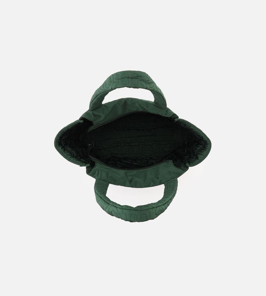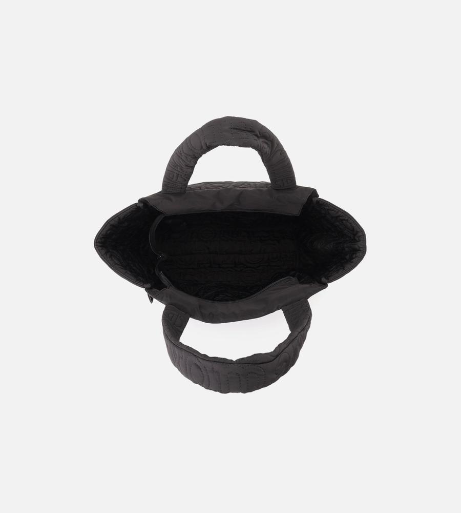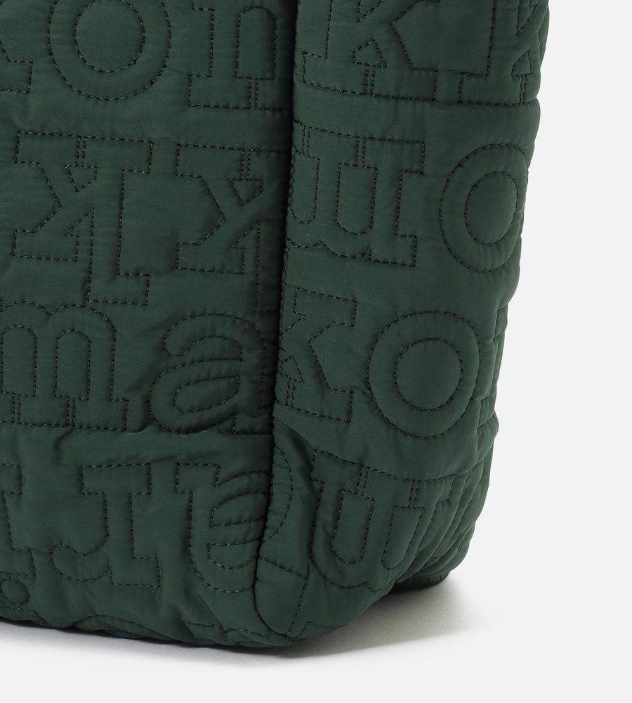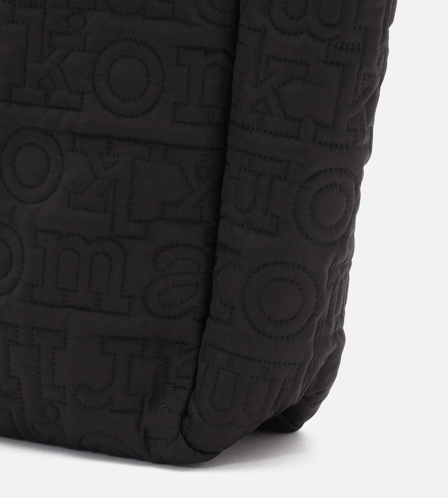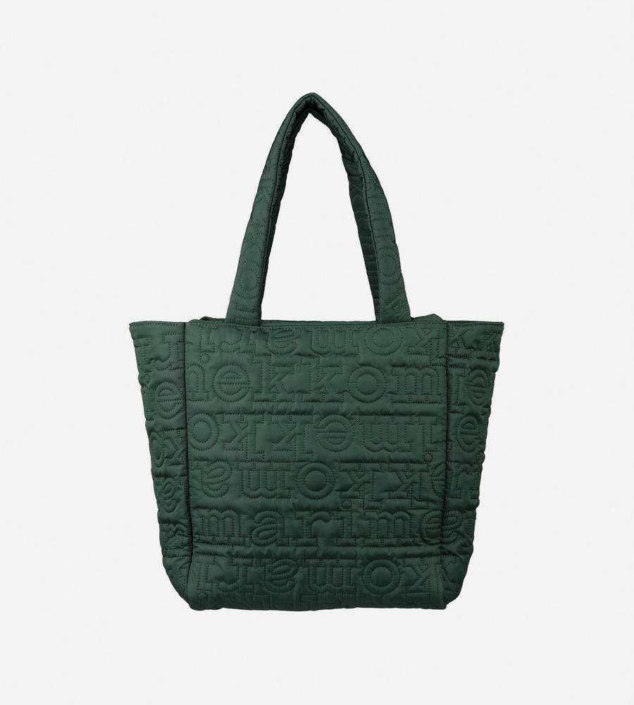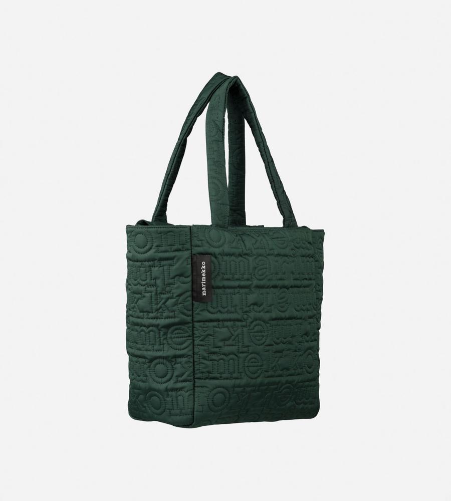 Marimekkoロゴを散りばめたキルティングトートバッグ。柔らかな質感やA4サイズが収まる大きさ、肩掛けしやすい長めのハンドル、ファスナー付きの間口など、細部まで使いやすさに配慮しています。大ぶりなピスタグも目をひくアクセント。シンプルな単色で合わせる服装を問わず、日常使いに最適なアイテムです。