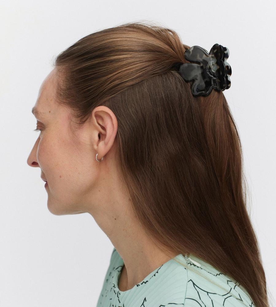 Unikko柄モチーフのヘアクリップミニサイズ。フラワーモチーフを型取ったユニークなデザインが魅力。さっとワンタッチで髪をまとめられる便利なアイテムです。様々なスタイリングになじみやすいオリジナルなニュアンスカラー。いつもの髪型にプラスするだけで、スタイリッシュなヘアアレンジが実現します。