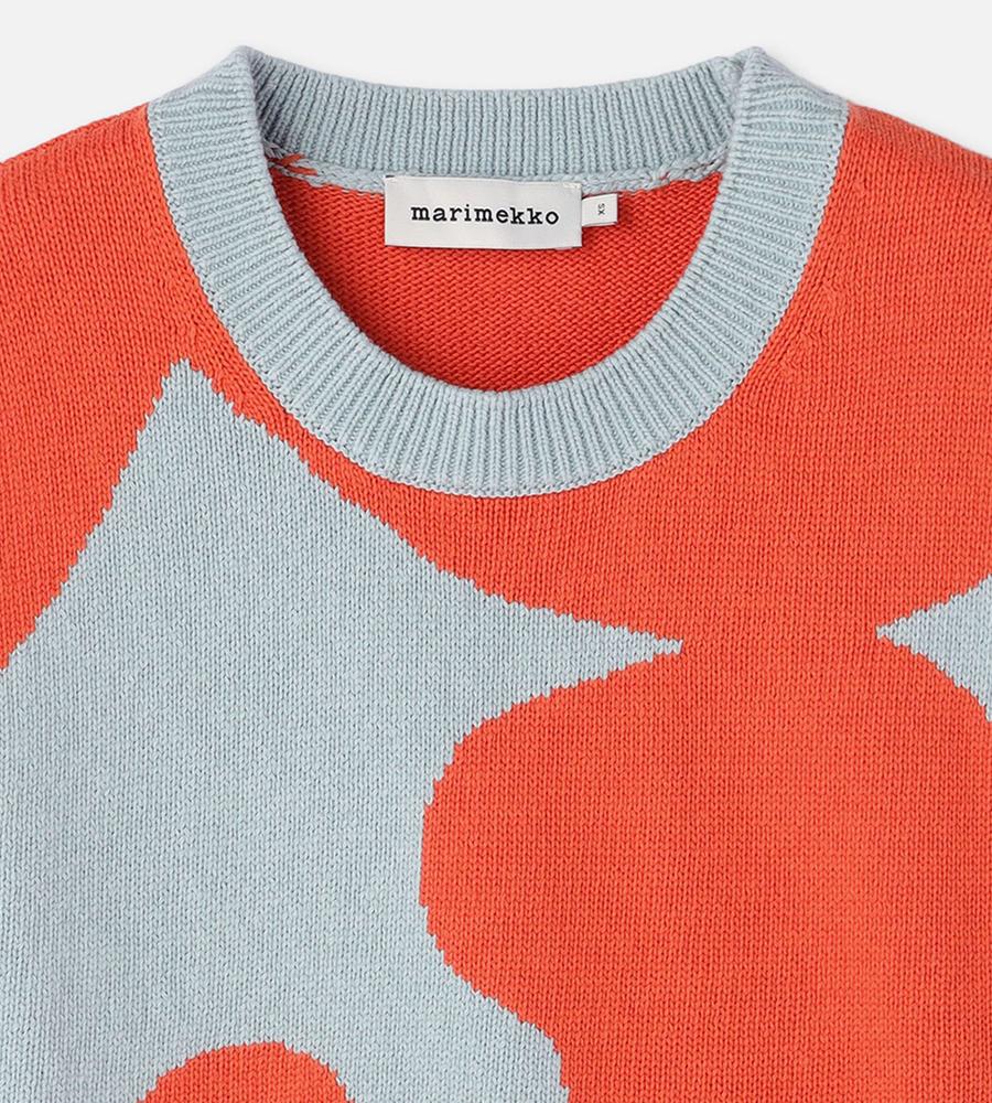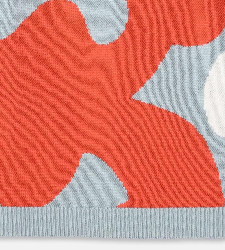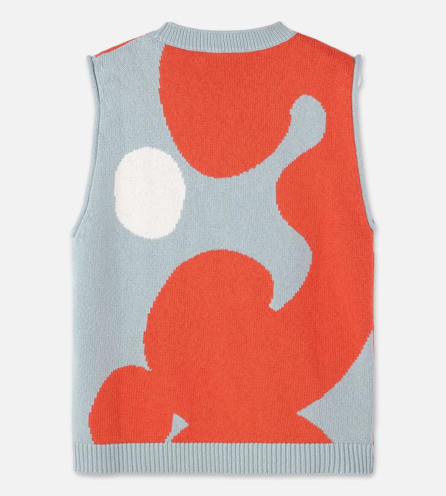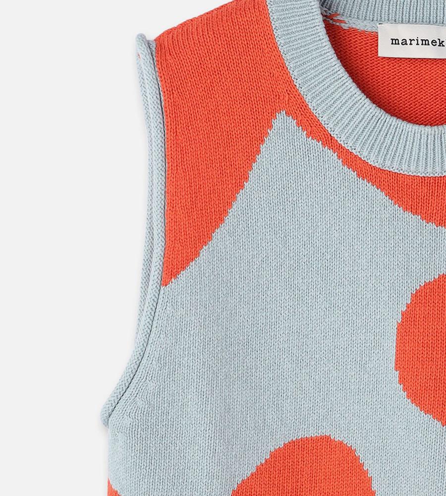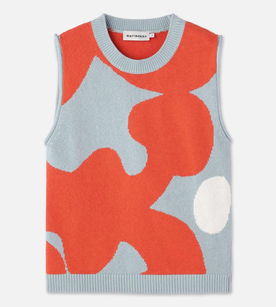 ダークオレンジとライトブルーのコンビで表現したKeidasパターンのノースリーブニットです。スリム&ストレートなシルエット。コットン100%素材を採用しており、Oネックと裾はリブ編みで切り替え、袖の端はくるっと巻いて仕上げています。