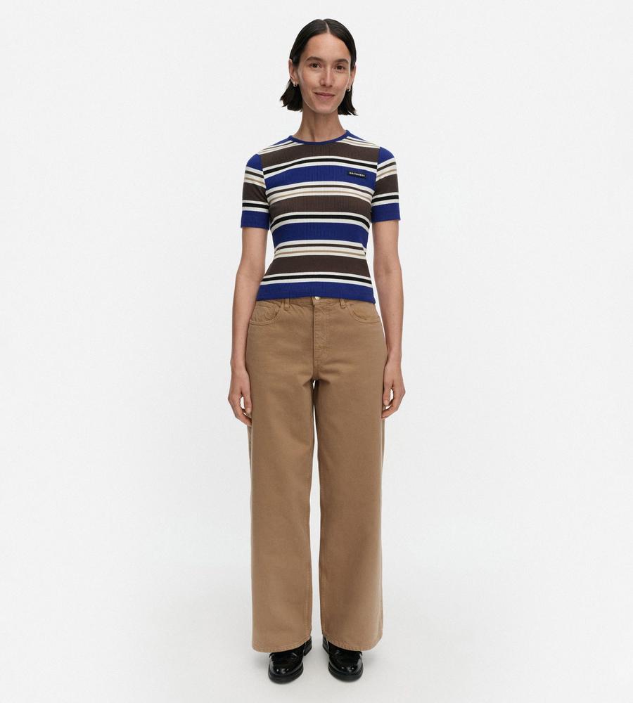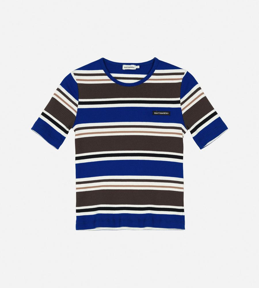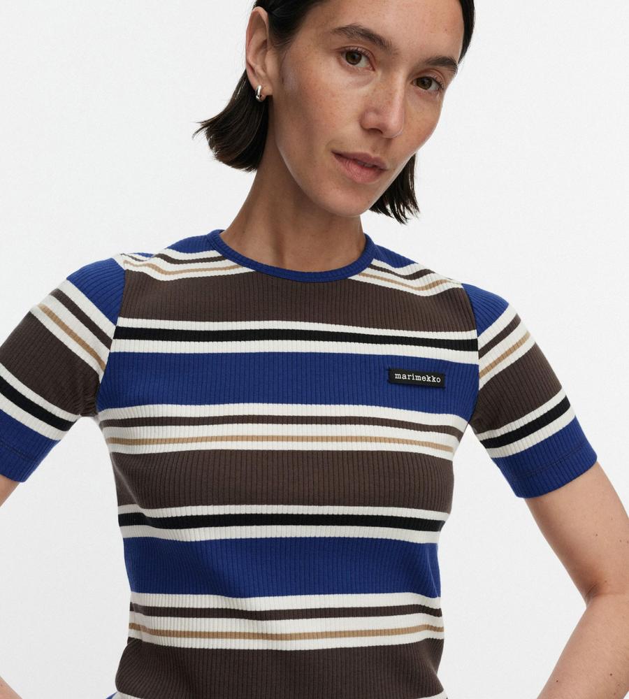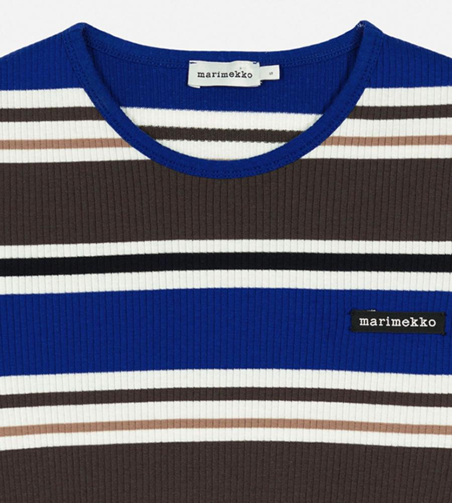 スタイリングのアクセントになるHelviパターンのコットンリブジャージーカットソー。ストレートフィットシルエットですっきりと着こなせるため1枚でももちろん、インナーとしても活躍します。左胸にはマリメッコのロゴ入りラベルを添えてワンポイントに。