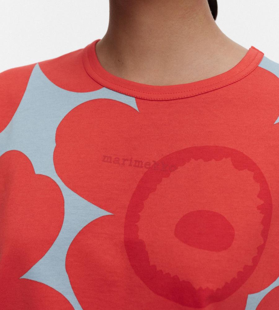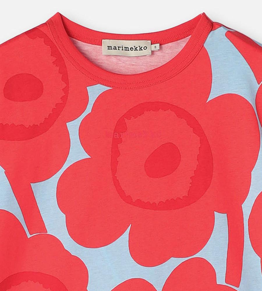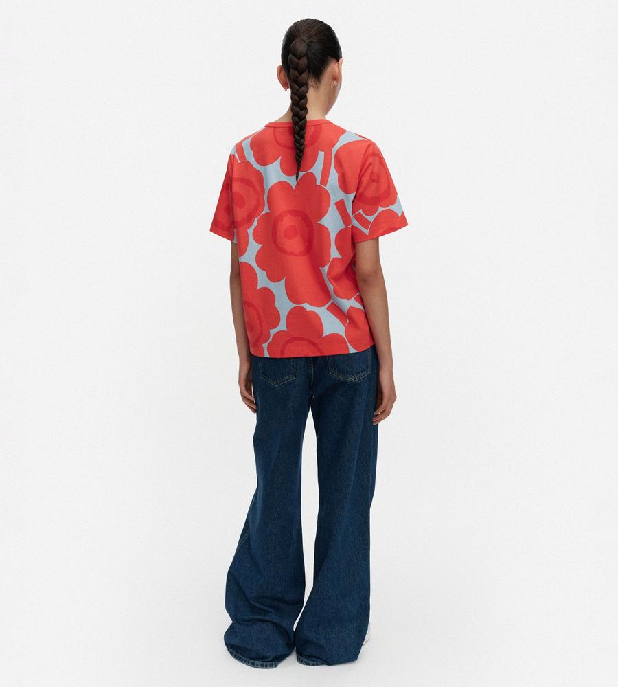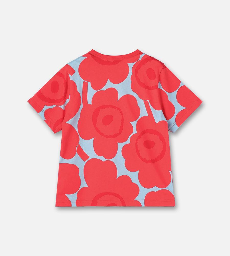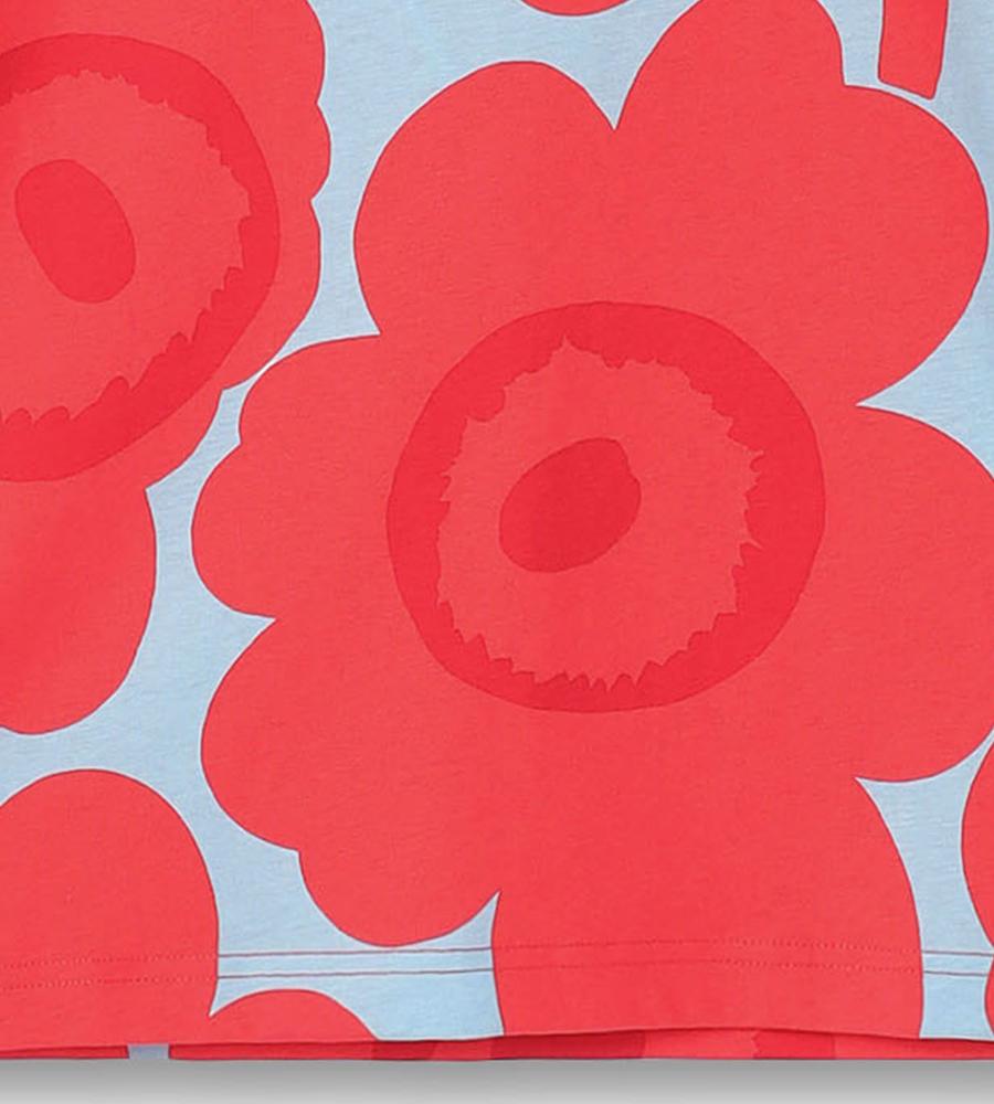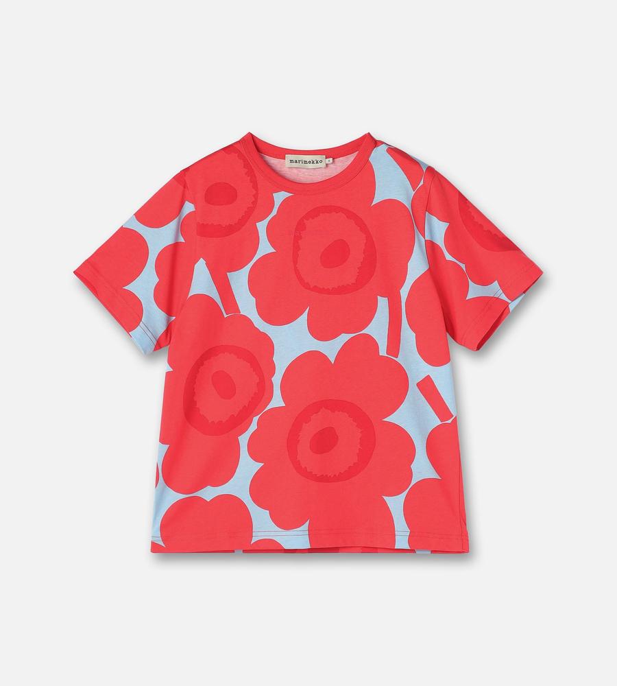 Marimekkoの人気プリント柄、Unikko(ウニッコ)のTシャツです。遠目にもインパクト抜群な配色プリント柄で、1枚着はもちろんインナーとしても存在感たっぷりにお使いいただけます。毎日のカジュアルシーンから、アクティブに動きたい日まで幅広いシーンで活躍間違いなしのアイテムです。