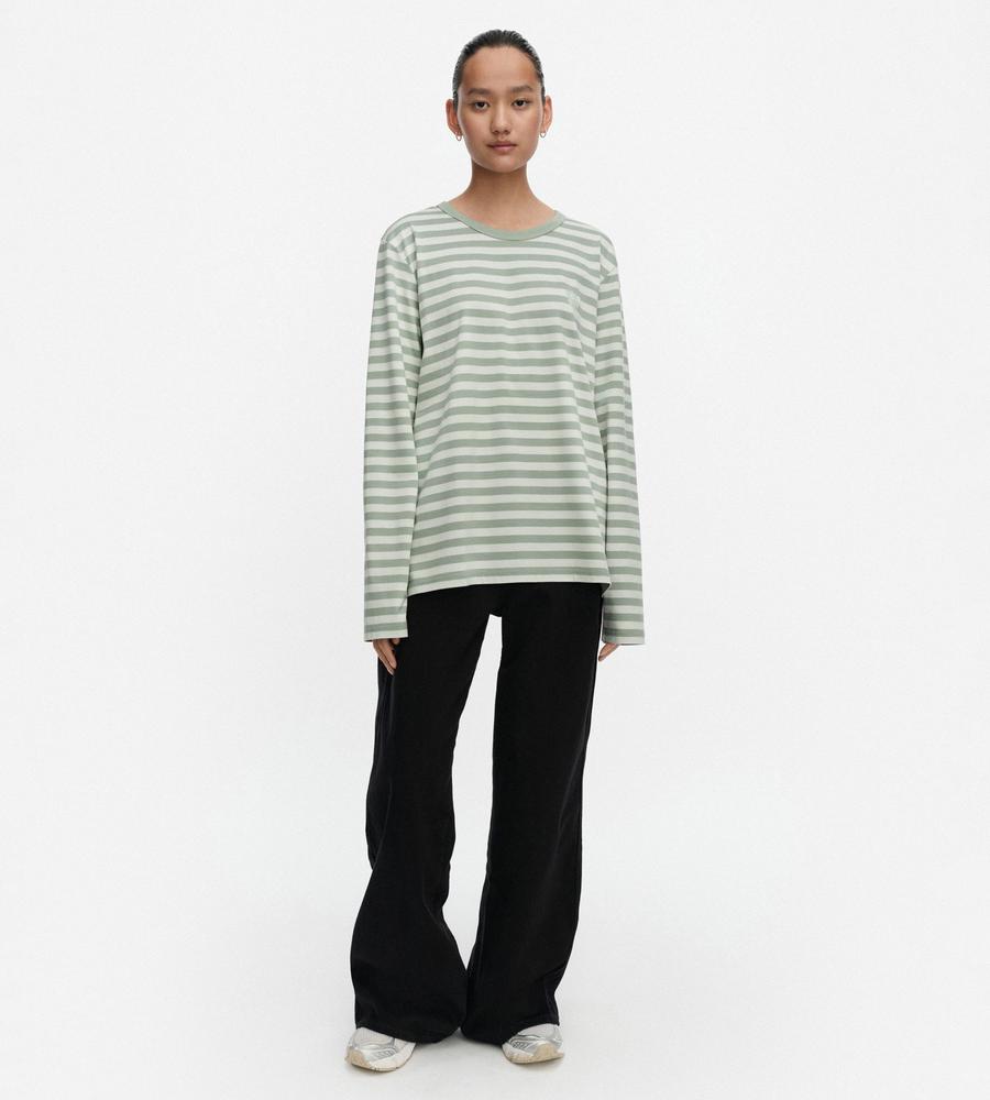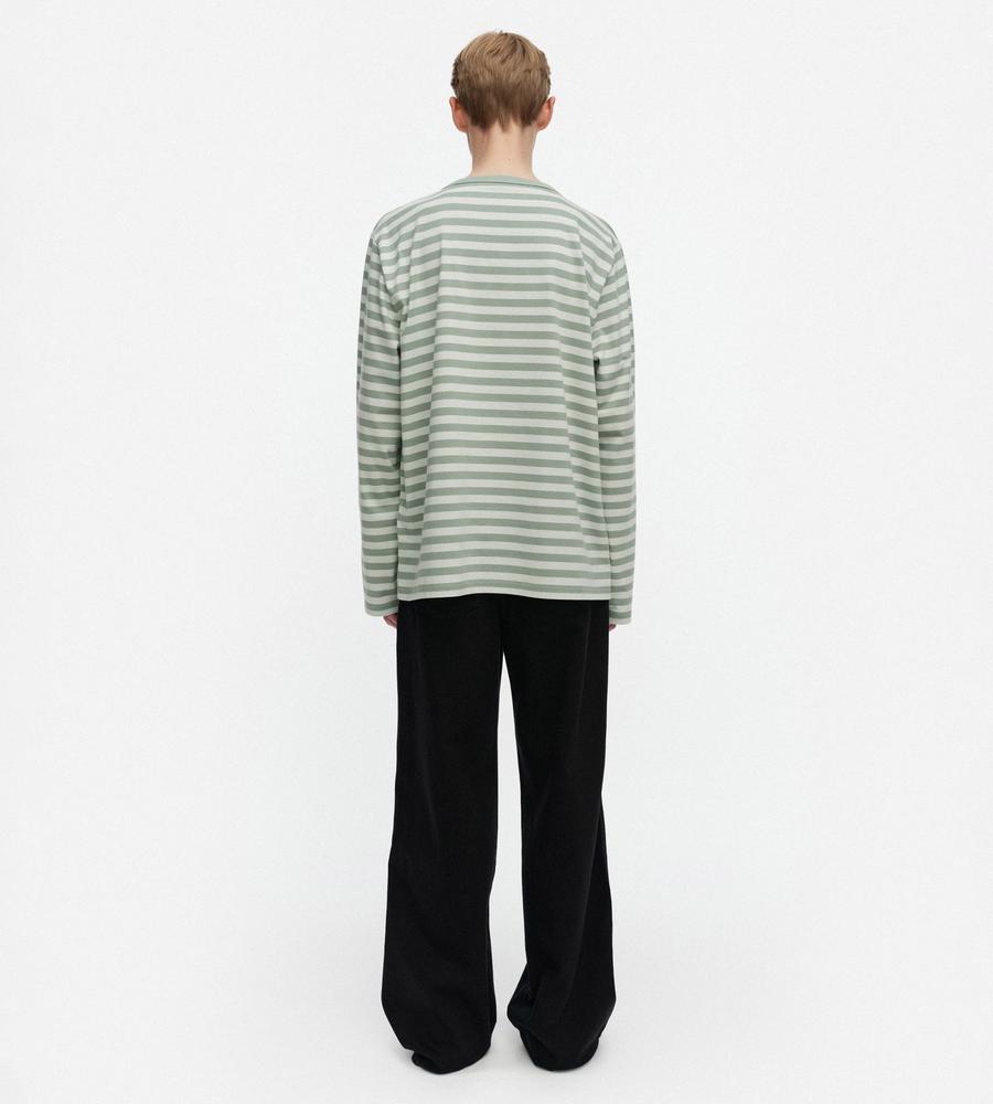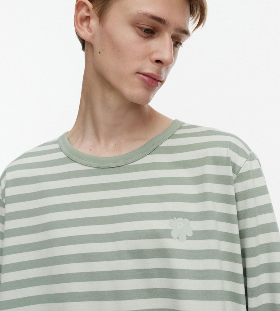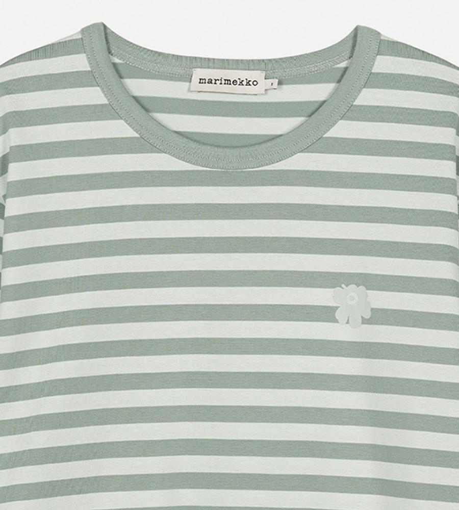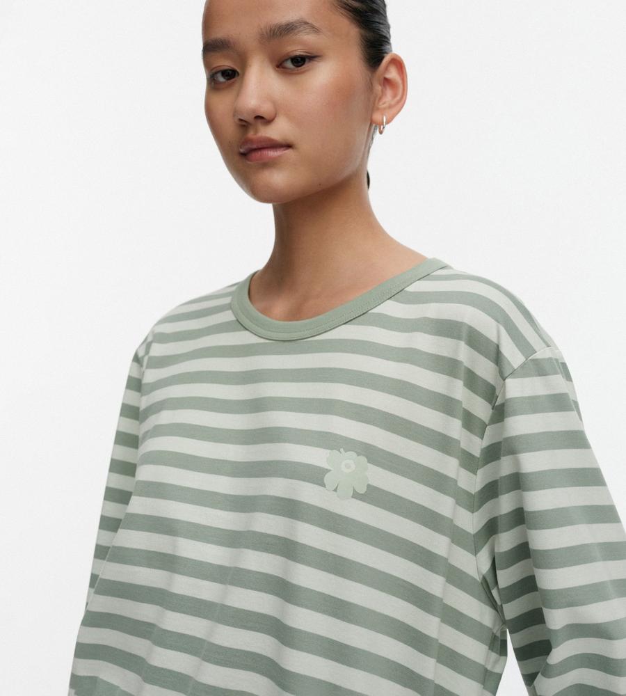 細めのボーダー柄がコーディネートのアクセントになる長袖カットソー。Unikko柄のモチーフを左胸にあしらった、さりげなくスタイリッシュなデザインアクセント。リラックスフィットのユニセックスなサイズ感、長めの袖丈も魅力です。肌触りに良いコットン生地で、着心地も抜群。デイリーに活躍するアイテムです。