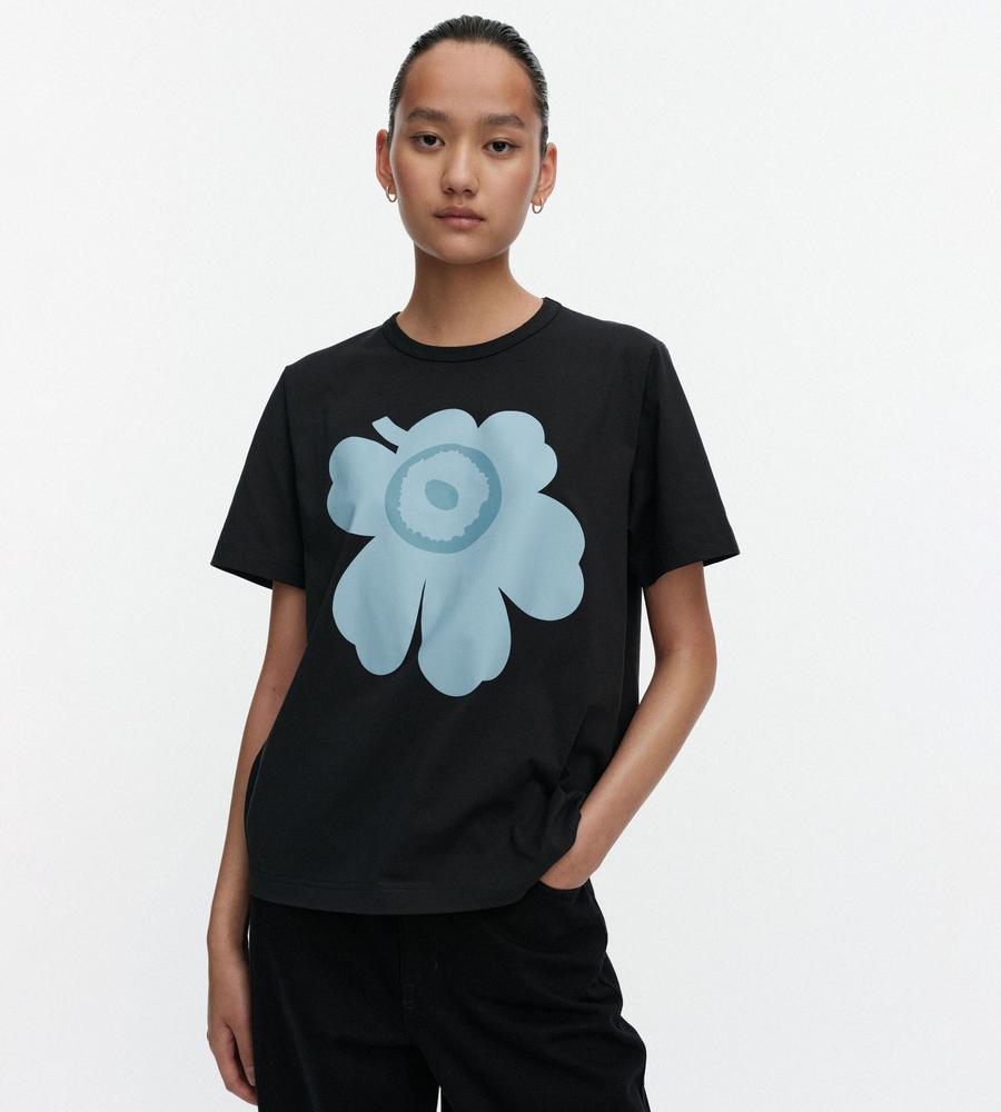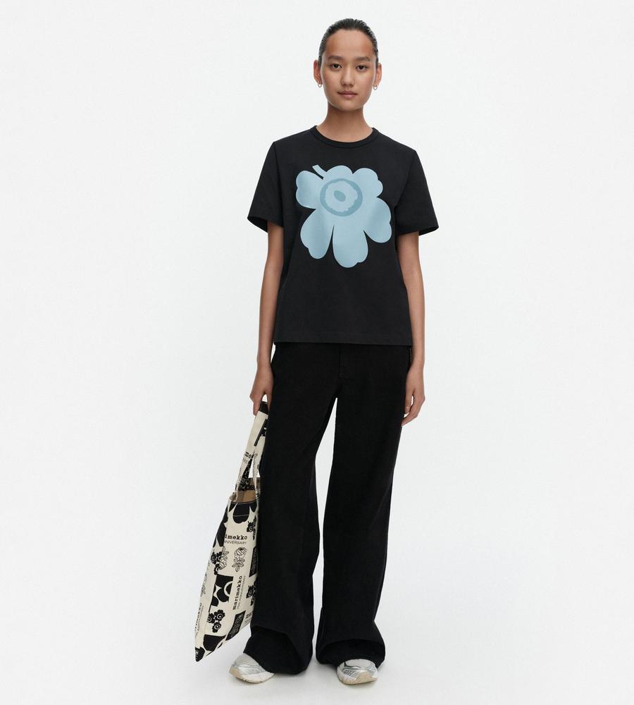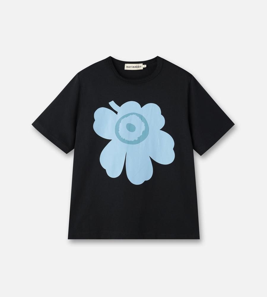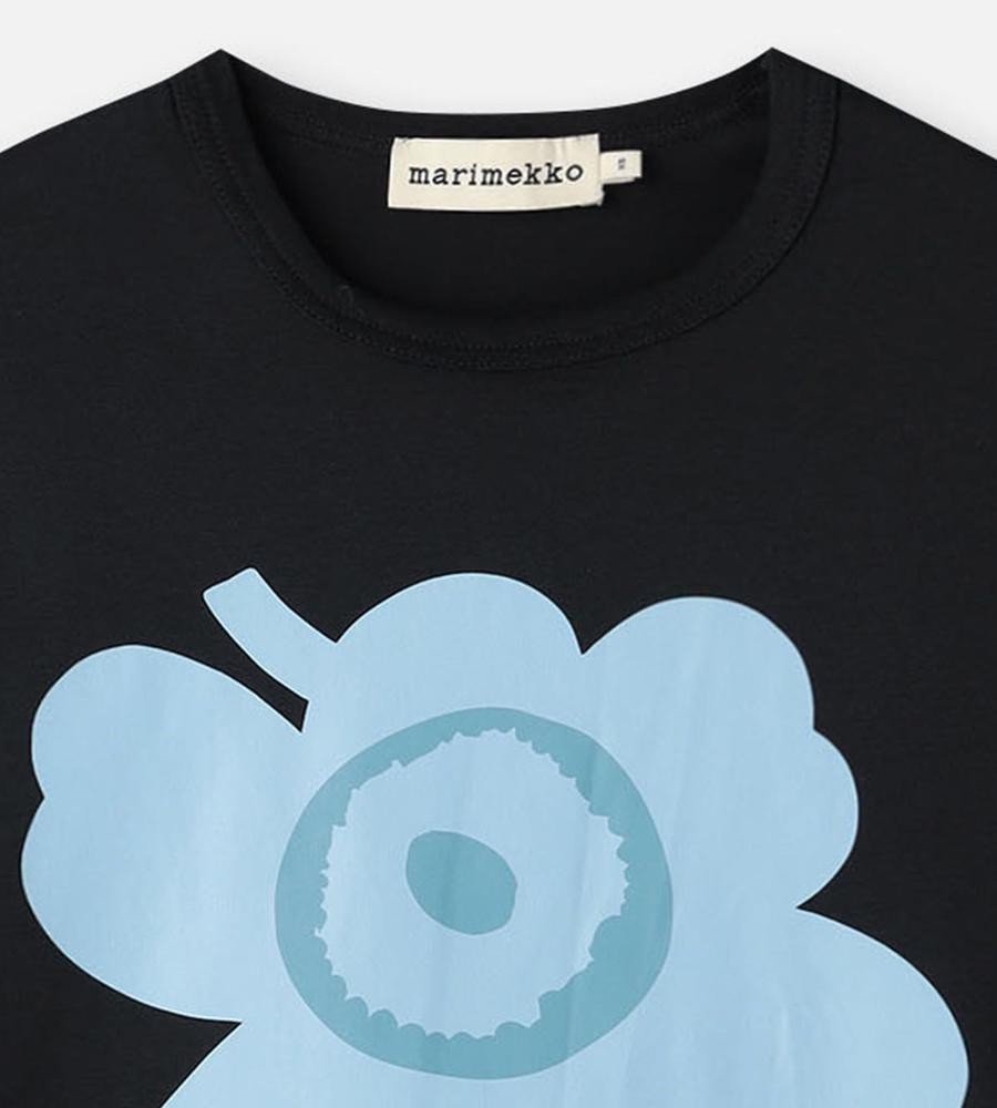 Marimekkoを代表するUnikko柄のモチーフを大きくフロントにプリントしたOネックTシャツ。フラワーモチーフがインパクトのある華やかなデザイン。ゆったりとしたフィット感のモダンなシルエット。お手持ちのボトムに合わせるだけで、スタイリッシュな着こなしが完成するアイテムです。