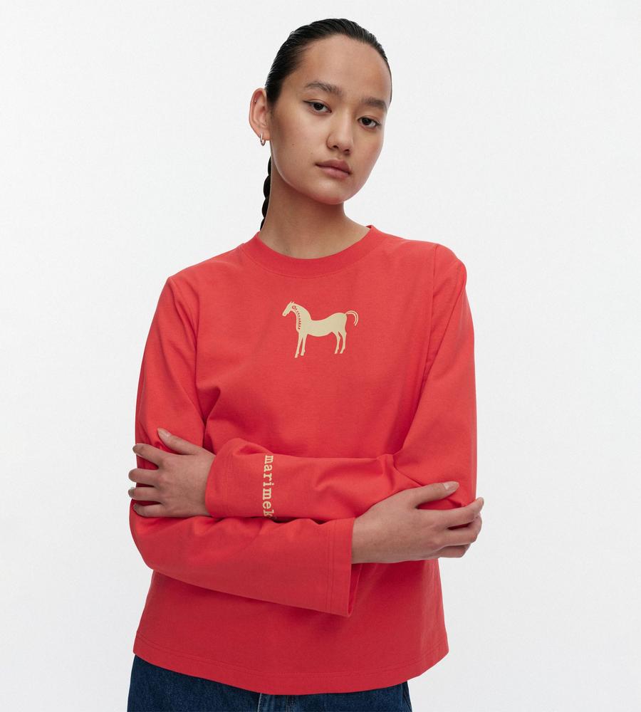 馬のワンポイントがチャーミングでいてクールな長袖Tシャツ。一枚でもレイヤードしても、アクセント効果を発揮してくれます。つかず離れずのシルエットで、コーディネイトしやすさも抜群です。