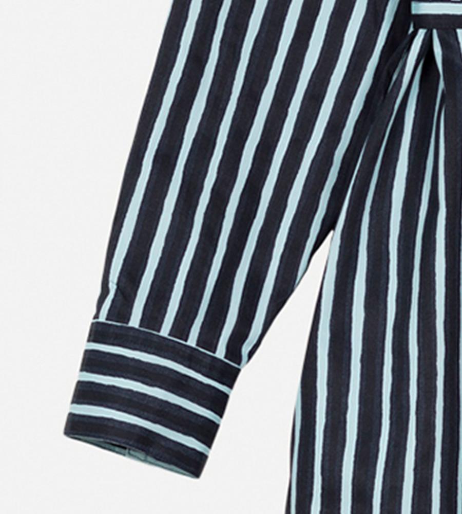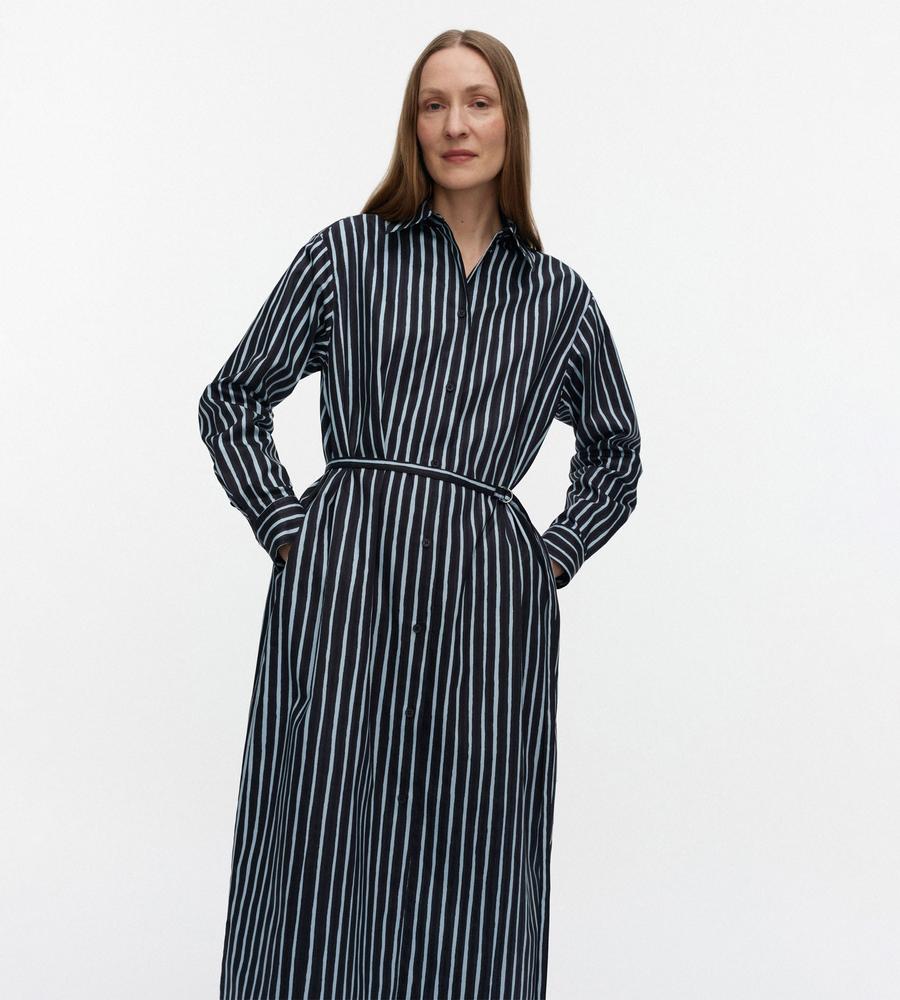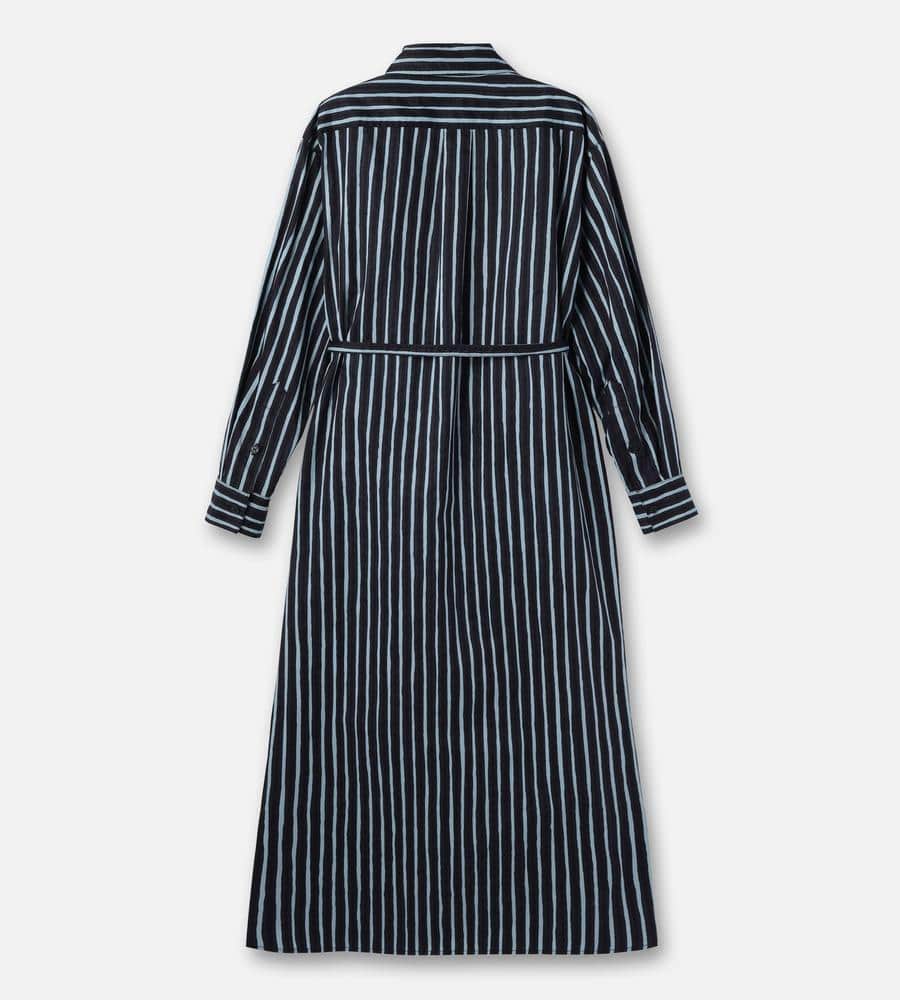 風通しの良いコットンの肌ざわりが心地良いシャツワンピース。シックなストライプ柄で、気負わずさらりと着こなせるのがうれしい。ウエストベルトが付属しており、シルエットのアレンジも楽しめます。