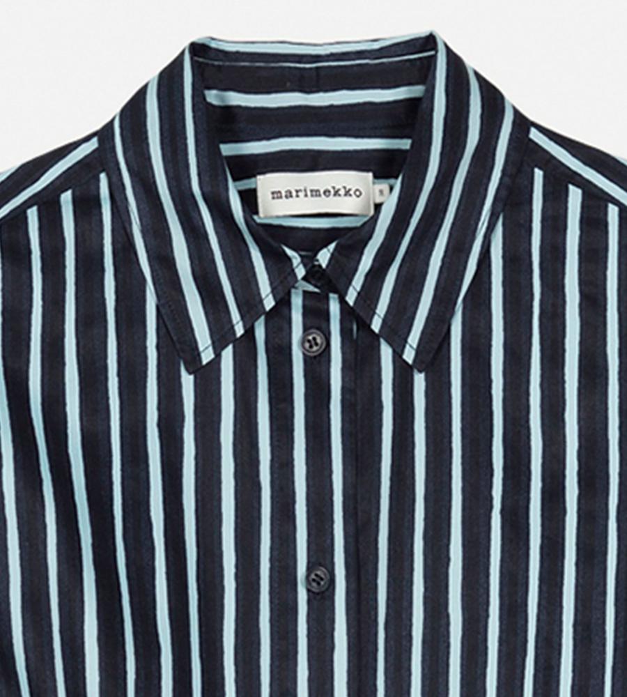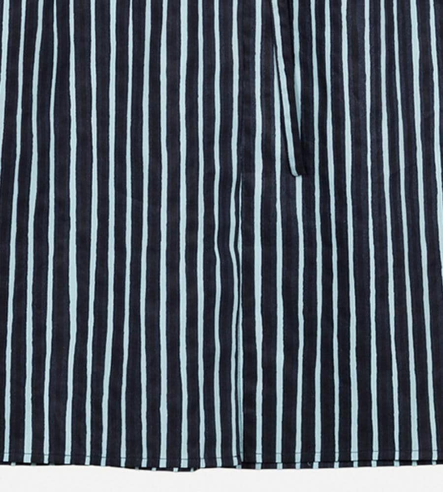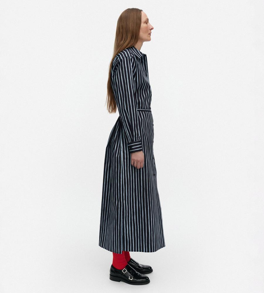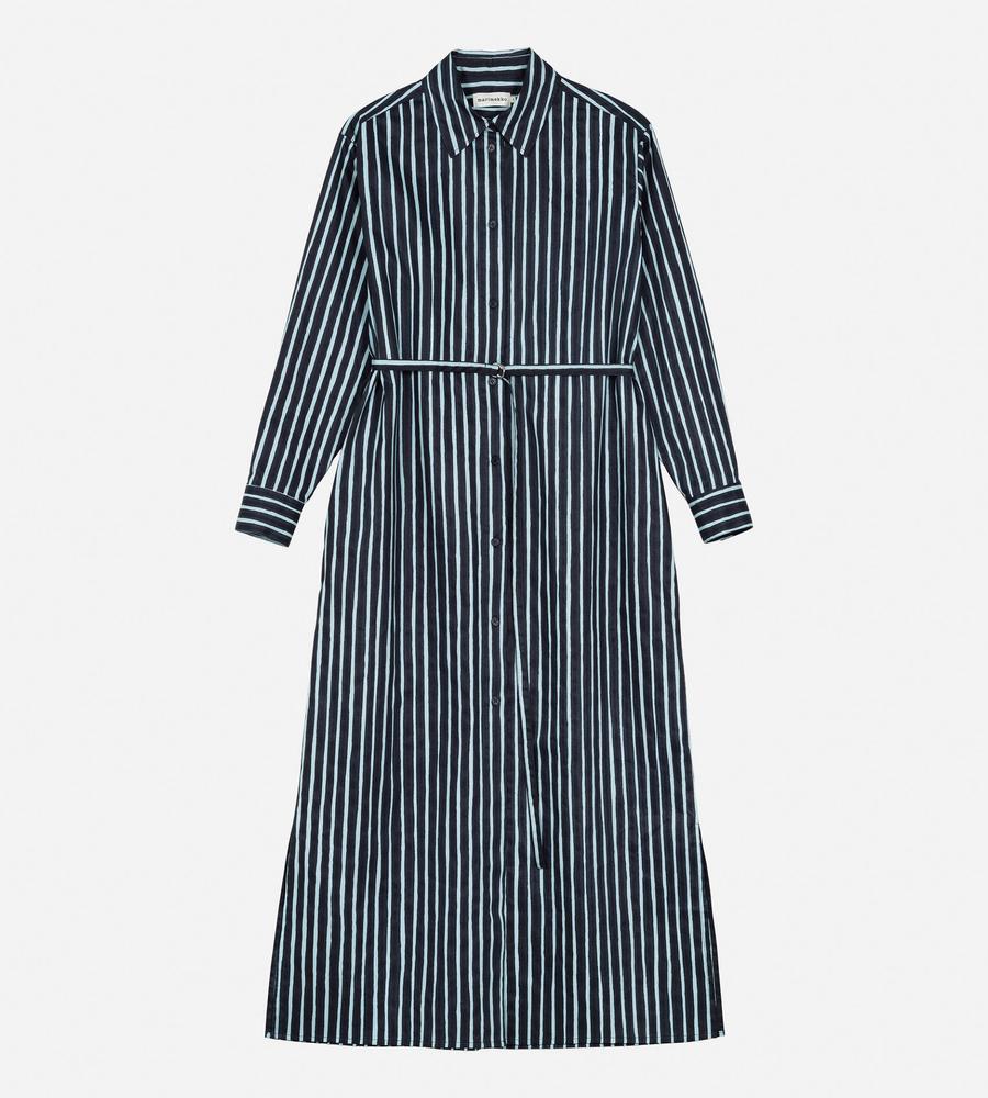 風通しの良いコットンの肌ざわりが心地良いシャツワンピース。シックなストライプ柄で、気負わずさらりと着こなせるのがうれしい。ウエストベルトが付属しており、シルエットのアレンジも楽しめます。