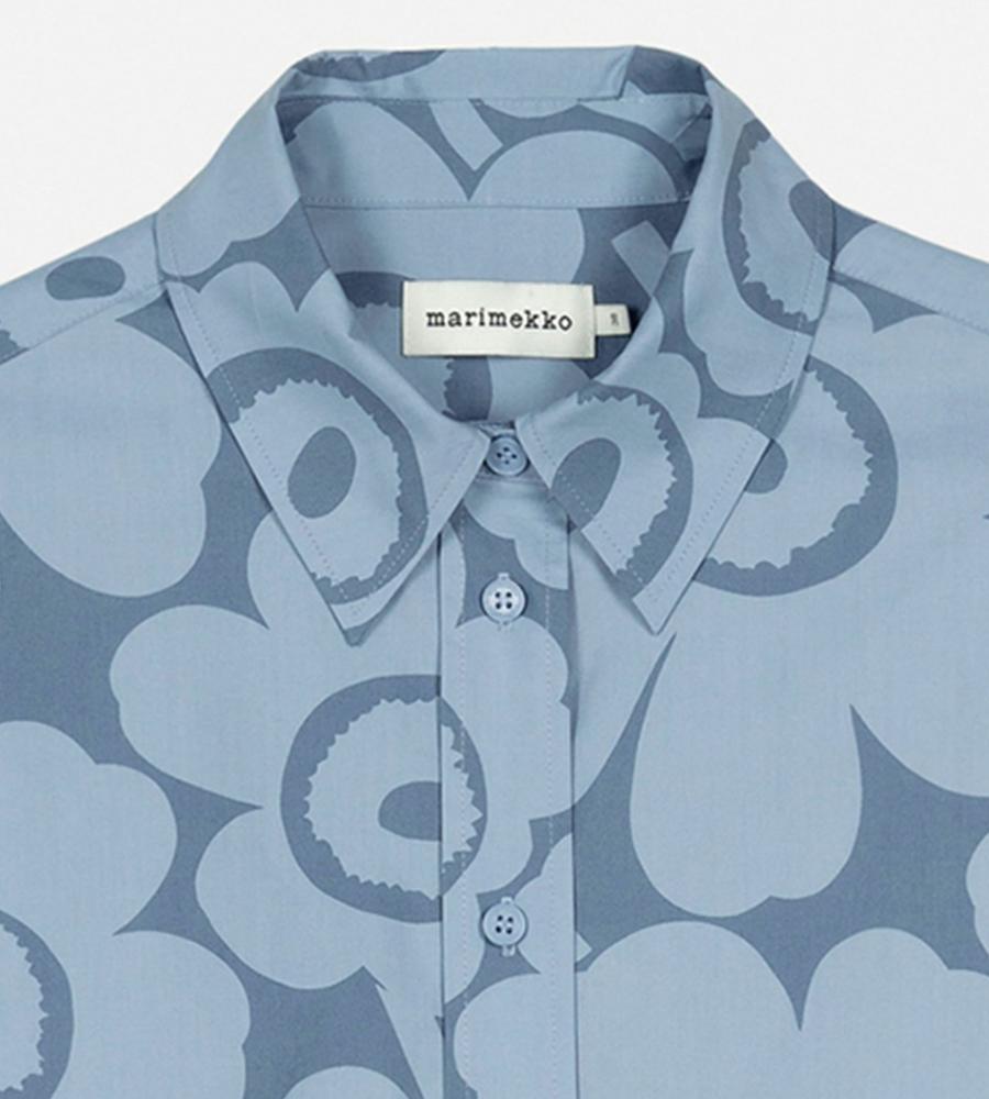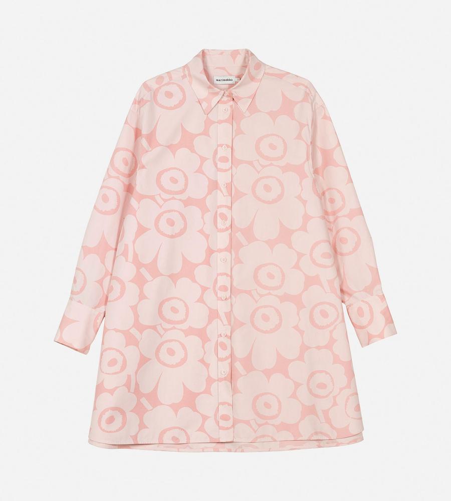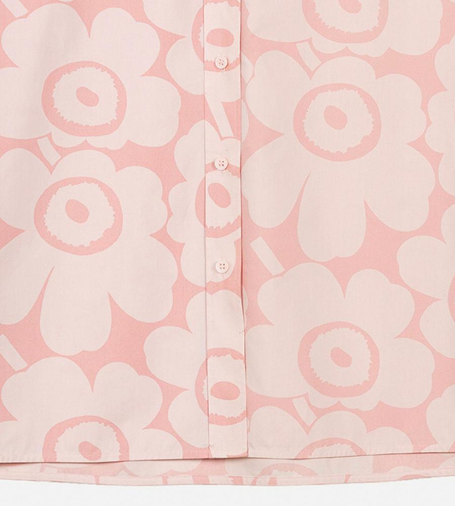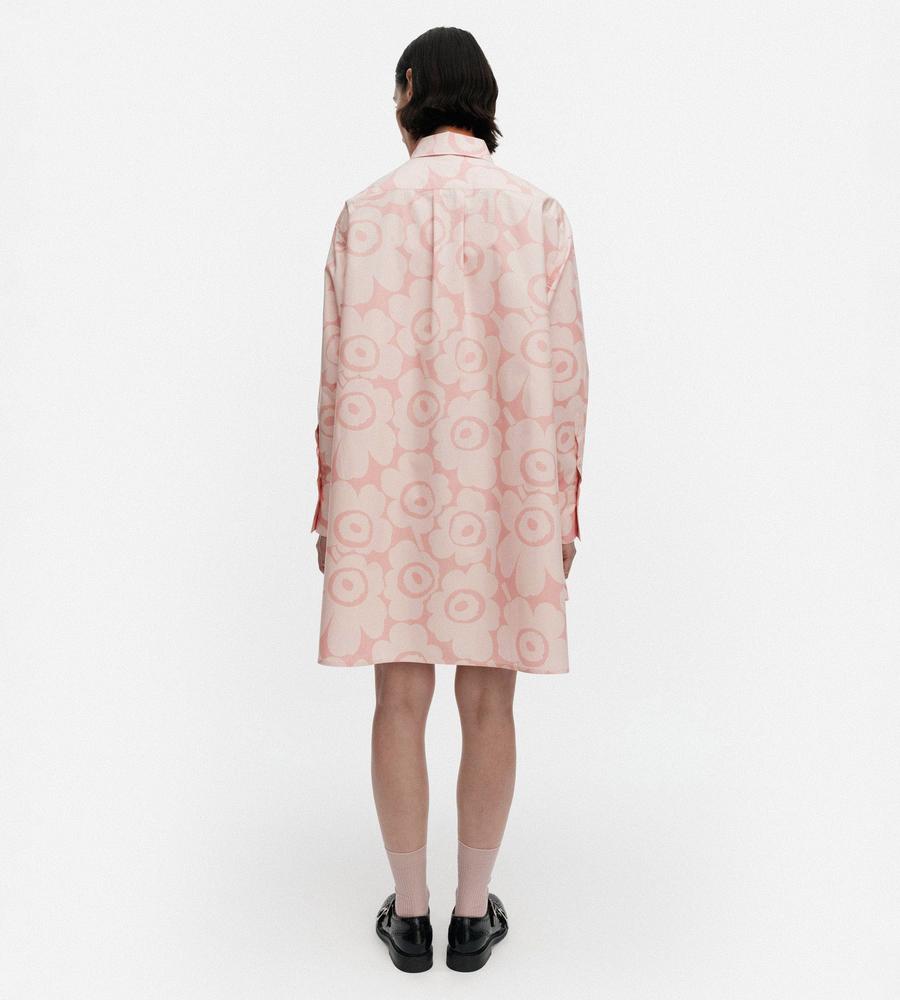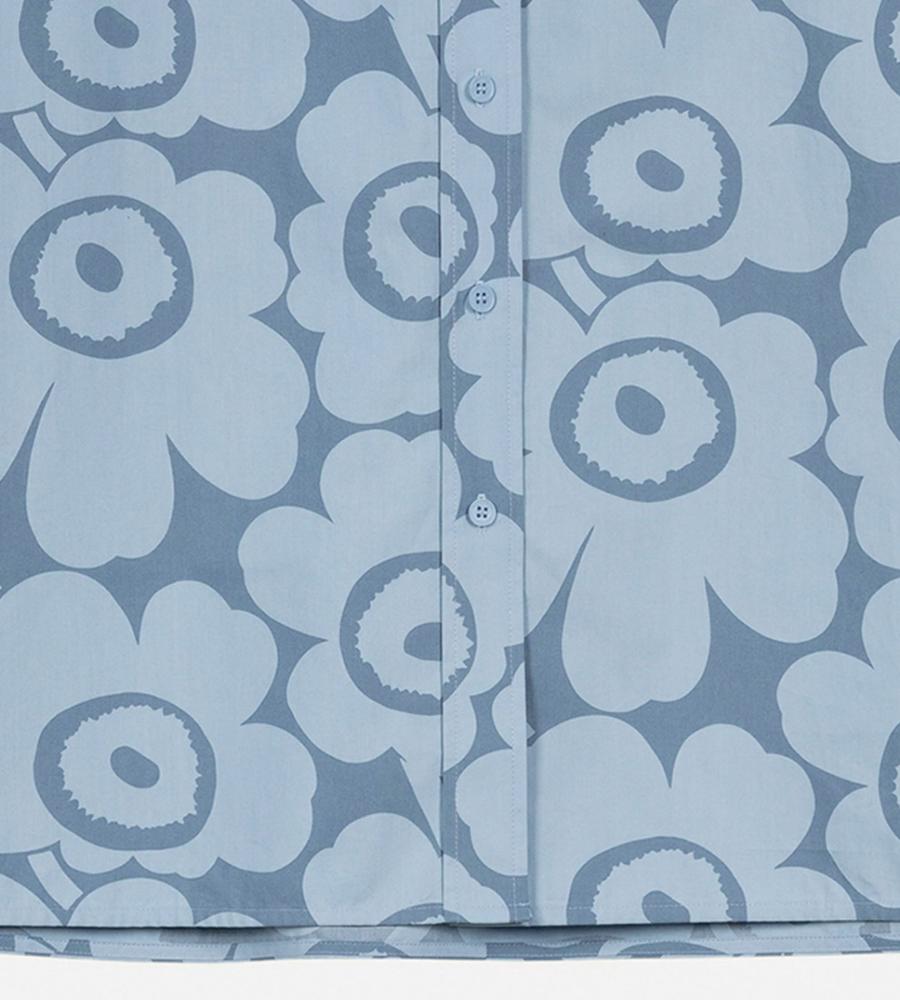 Unikko柄の総柄で仕上げた華やぎムード満点のシャツワンピース。ミニワンピースとしてシンプルに着るのはもちろん、オーバーシャツとしてボトムとレイヤードするのもおすすめです。