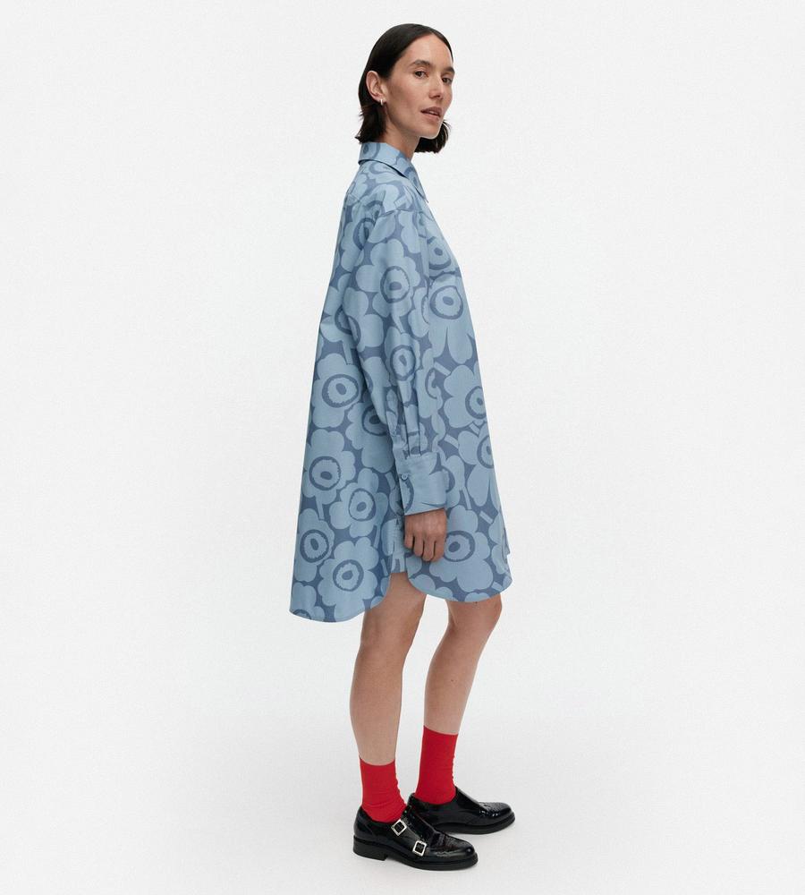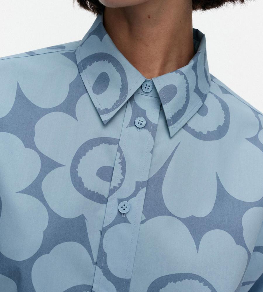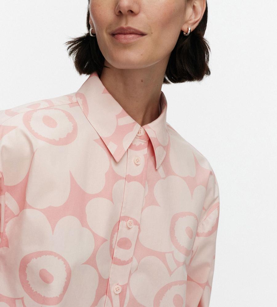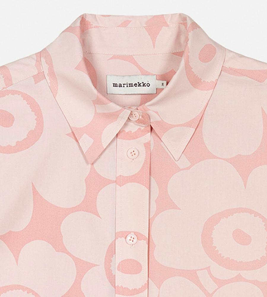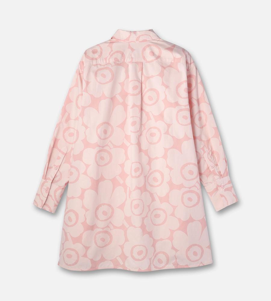 Unikko柄の総柄で仕上げた華やぎムード満点のシャツワンピース。ミニワンピースとしてシンプルに着るのはもちろん、オーバーシャツとしてボトムとレイヤードするのもおすすめです。