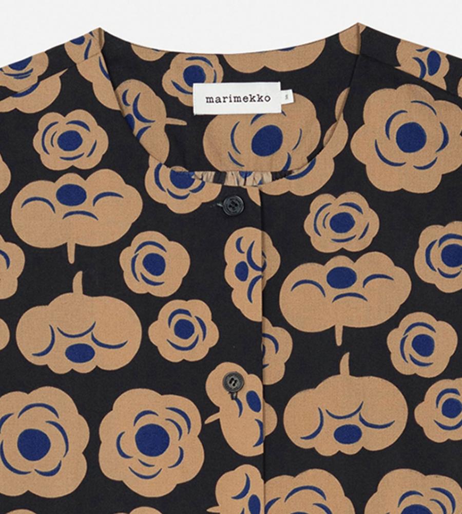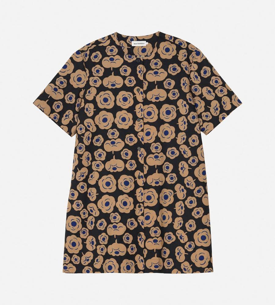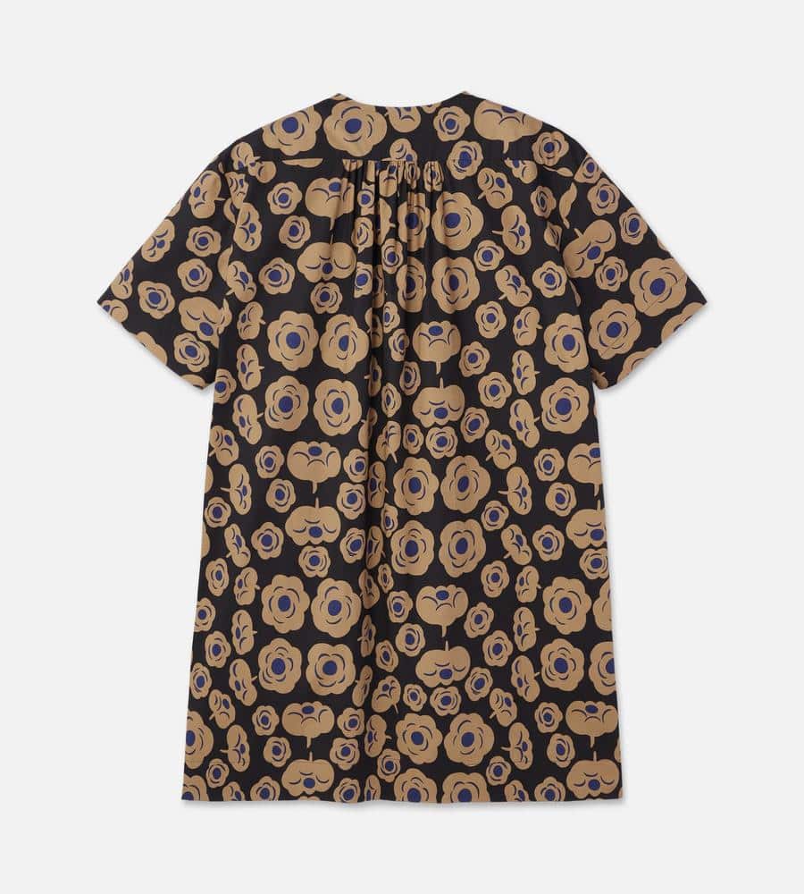ブラックとベージュ、アクセントカラーにブルーを取り入れたTummaパターンのワンピースです。コットン100%素材を採用。フロントはボタン仕様、ゆったりとしたスリーブがコンフォートなムードを演出。サイドにポケットを配置し、バックヨークの切り替え部分にギャザーを寄せています。