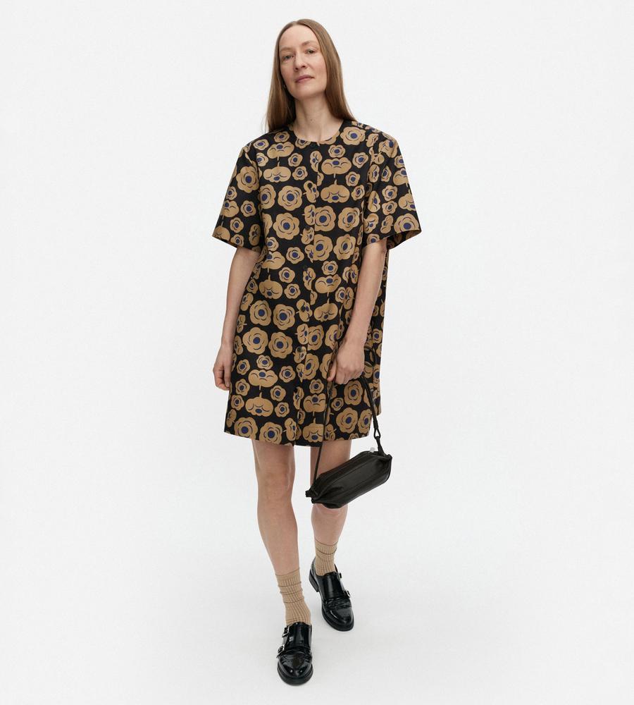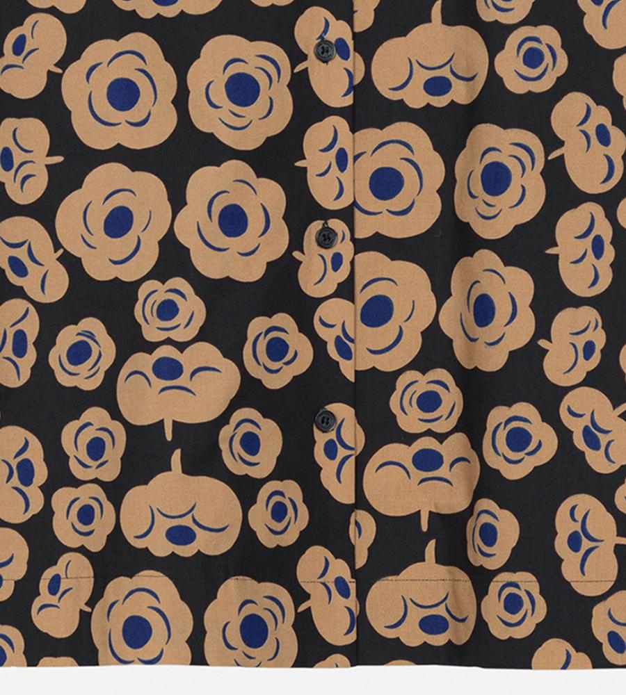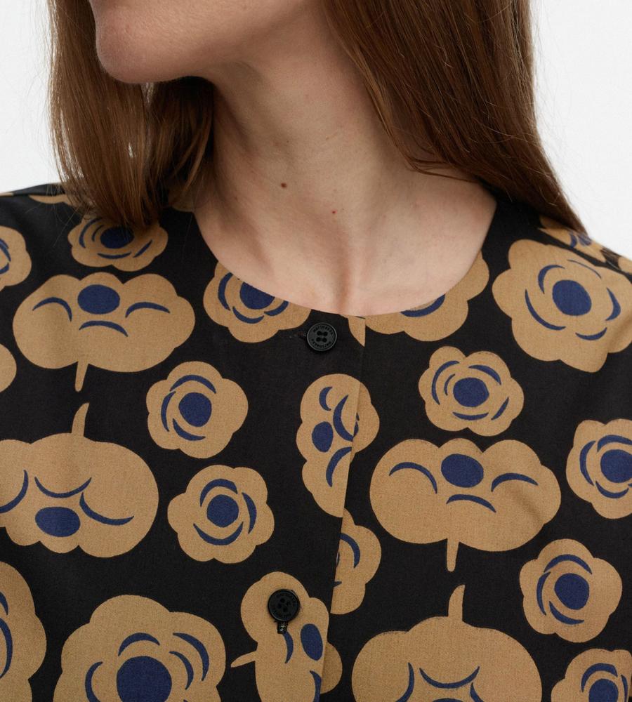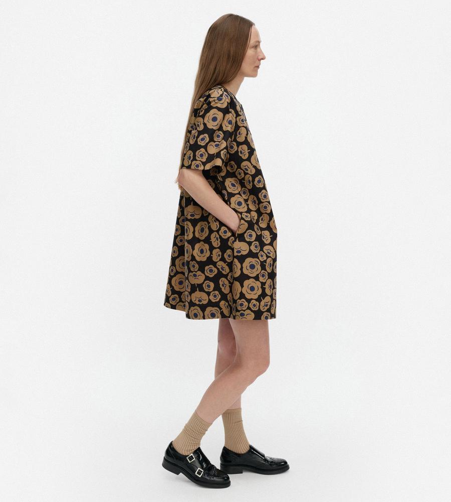 ブラックとベージュ、アクセントカラーにブルーを取り入れたTummaパターンのワンピースです。コットン100%素材を採用。フロントはボタン仕様、ゆったりとしたスリーブがコンフォートなムードを演出。サイドにポケットを配置し、バックヨークの切り替え部分にギャザーを寄せています。