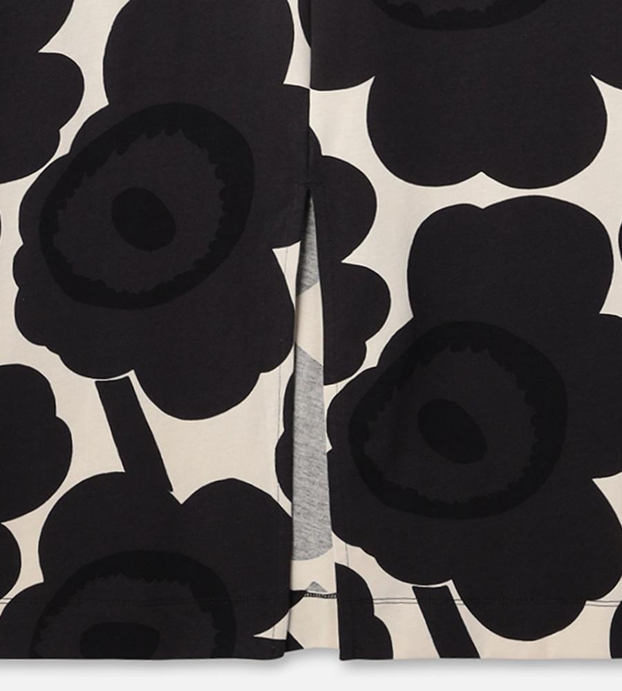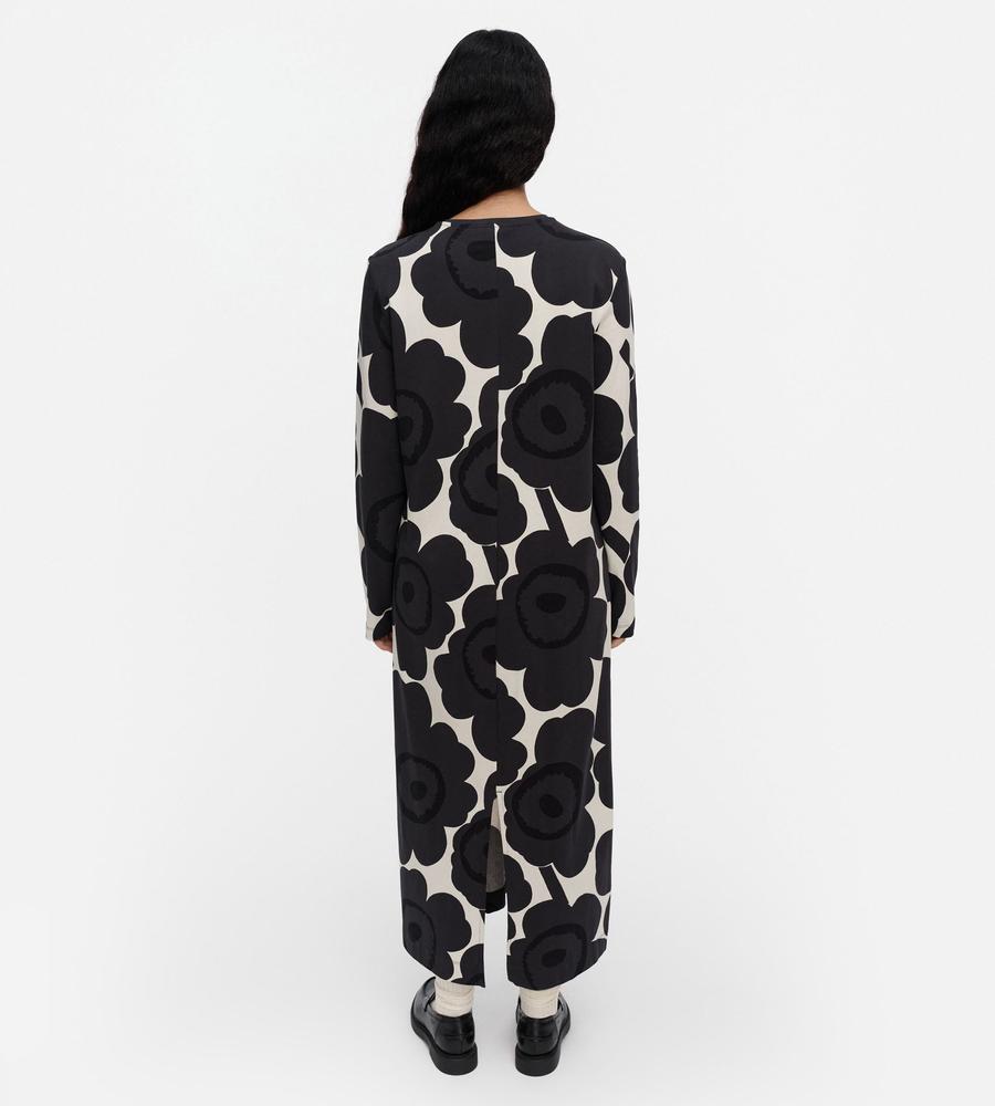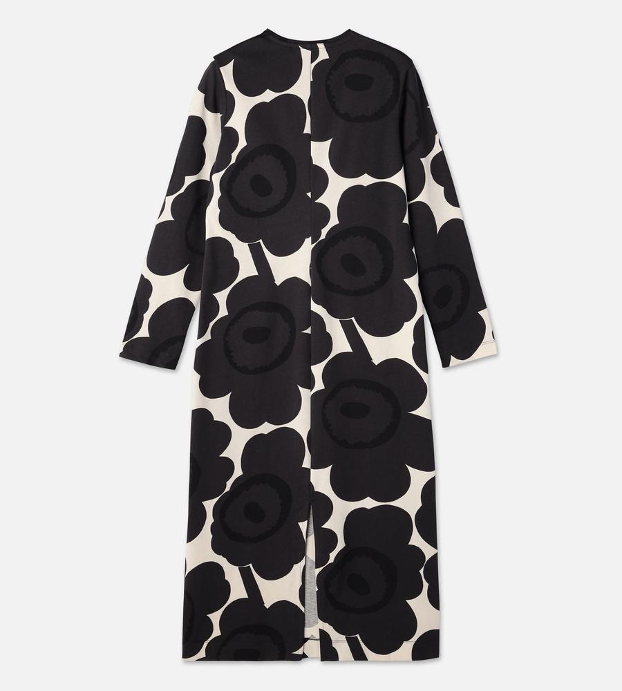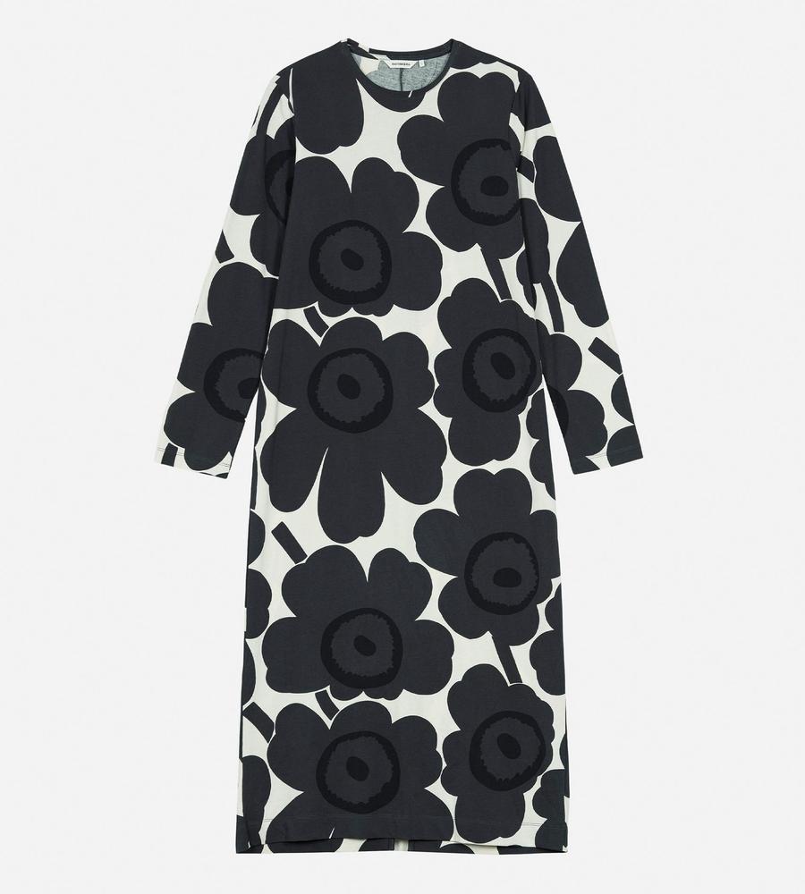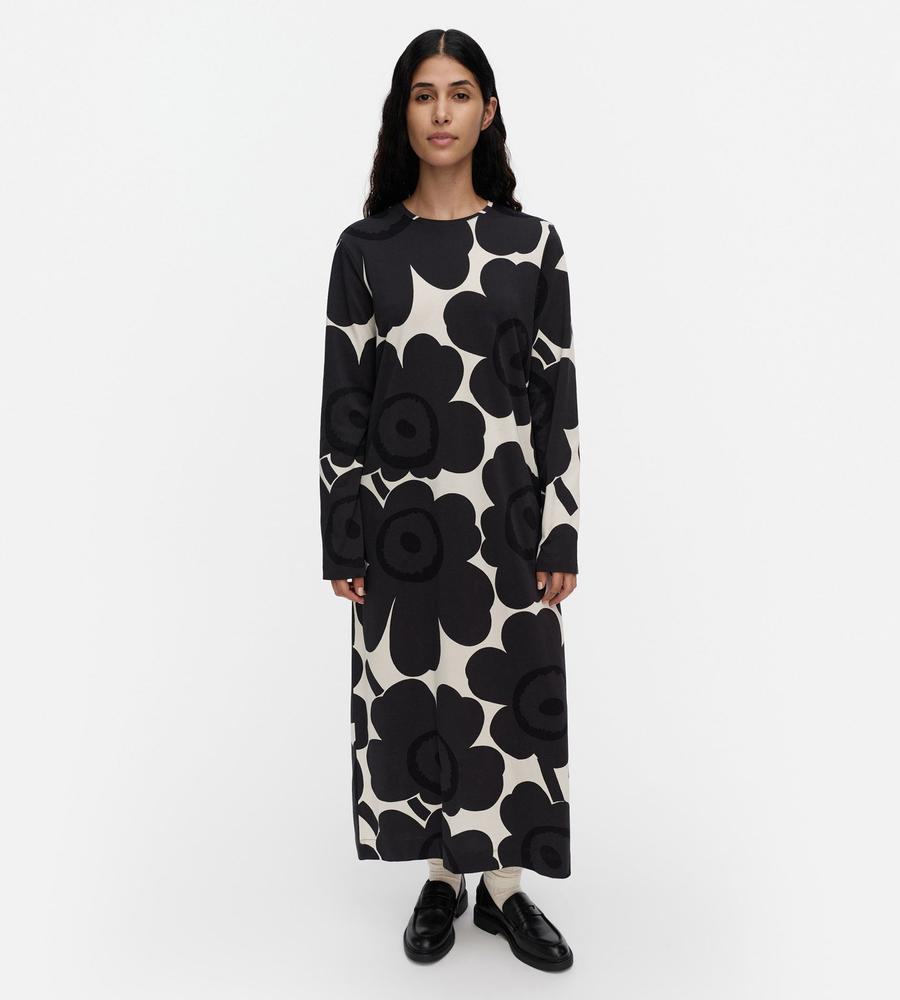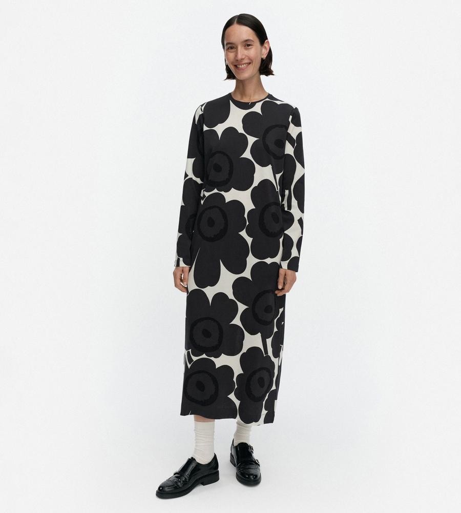 Unikko柄モチーフが全体にプリントされたロング丈ワンピース。スリムかつストレートなフィット感で、すっきりとした印象のシルエットを演出します。後ろ裾の大きなスリットがスタイリッシュなデザインポイント。便利なサイドシームポケット付き。一枚で華やかなお出かけコーディネートが完成するアイテムです。