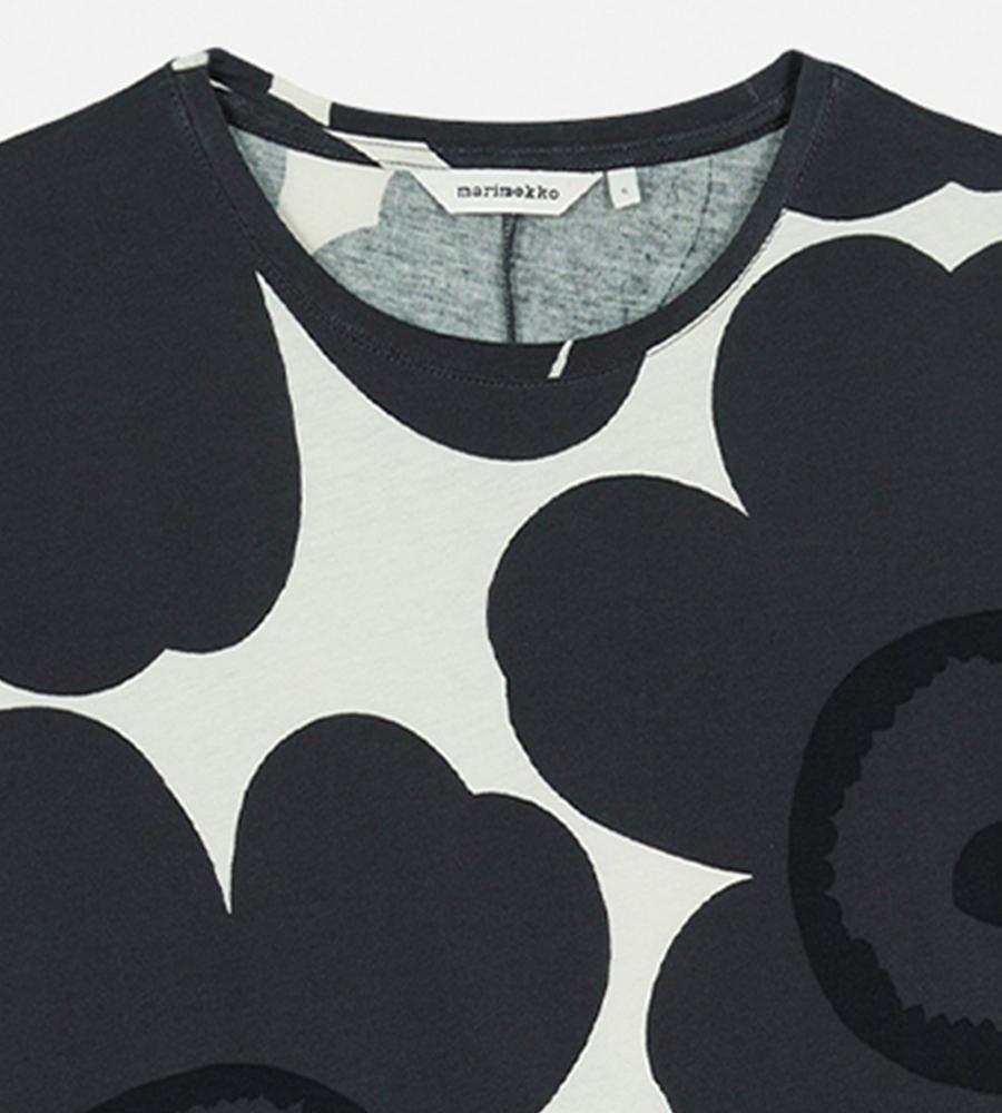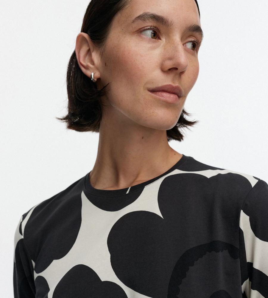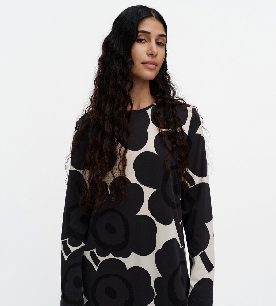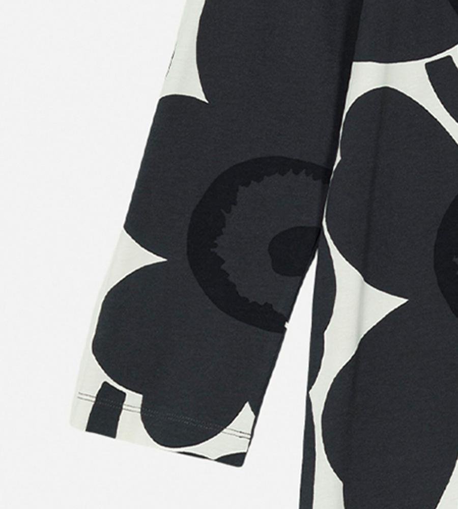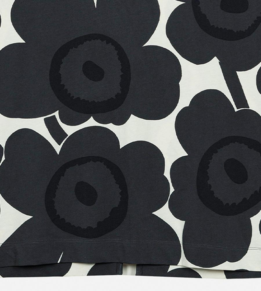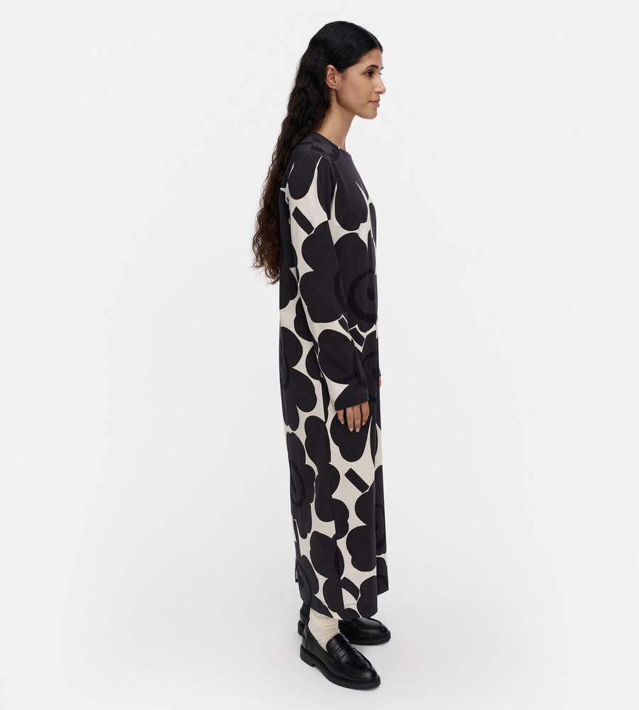 Unikko柄モチーフが全体にプリントされたロング丈ワンピース。スリムかつストレートなフィット感で、すっきりとした印象のシルエットを演出します。後ろ裾の大きなスリットがスタイリッシュなデザインポイント。便利なサイドシームポケット付き。一枚で華やかなお出かけコーディネートが完成するアイテムです。