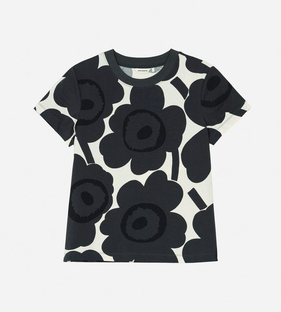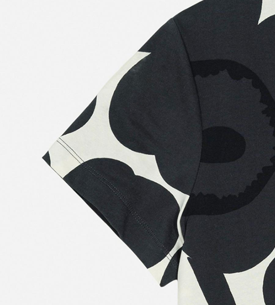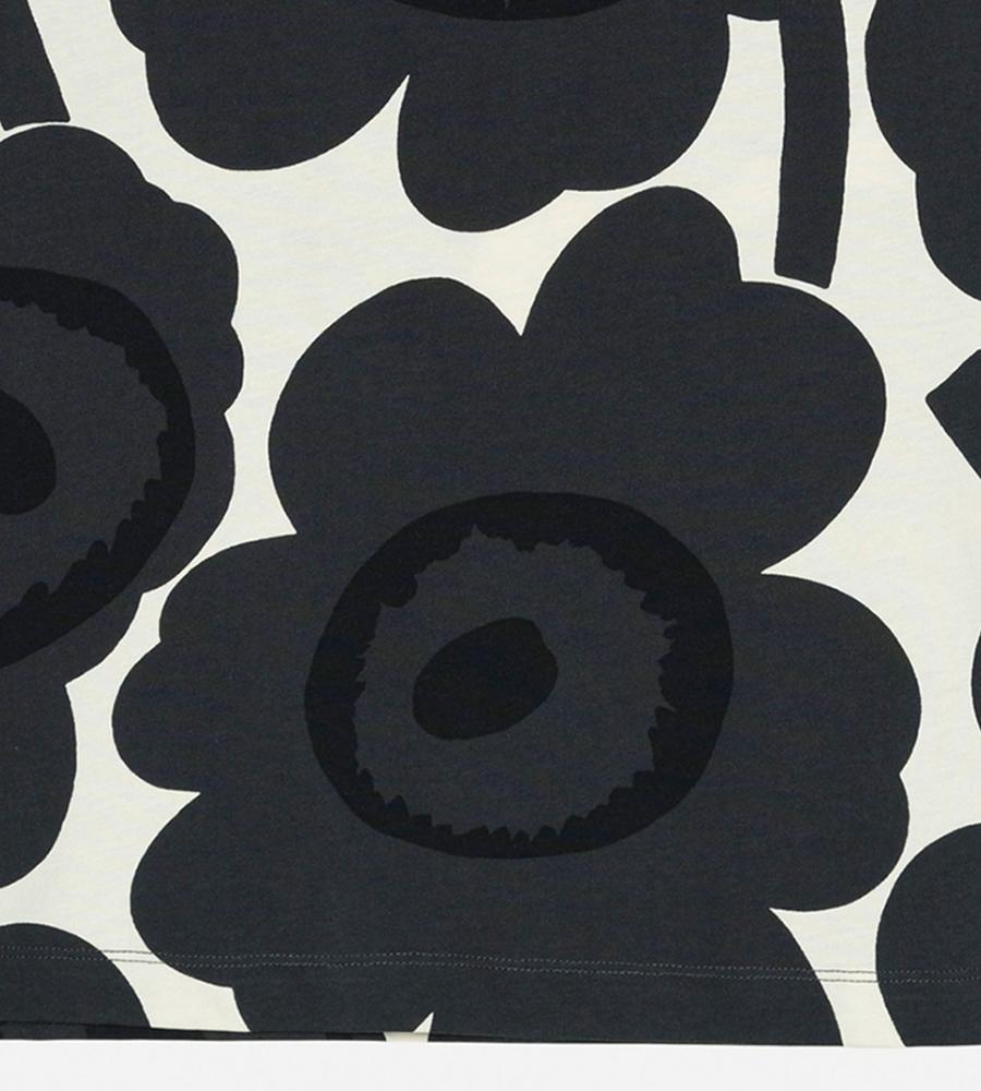 Marimekkoを代表するUnikko柄モチーフが目を惹くインパクトあるデザインのTシャツ。スリムでフィット感のあるすっきりとしたシルエットが特徴。Oネックのリブがメリハリのあるデザインアクセント。お手持ちのボトムを合わせて華やかでスタイリッシュなコーディネートが決まるアイテムです。
