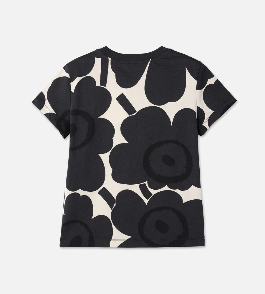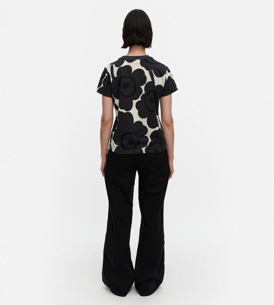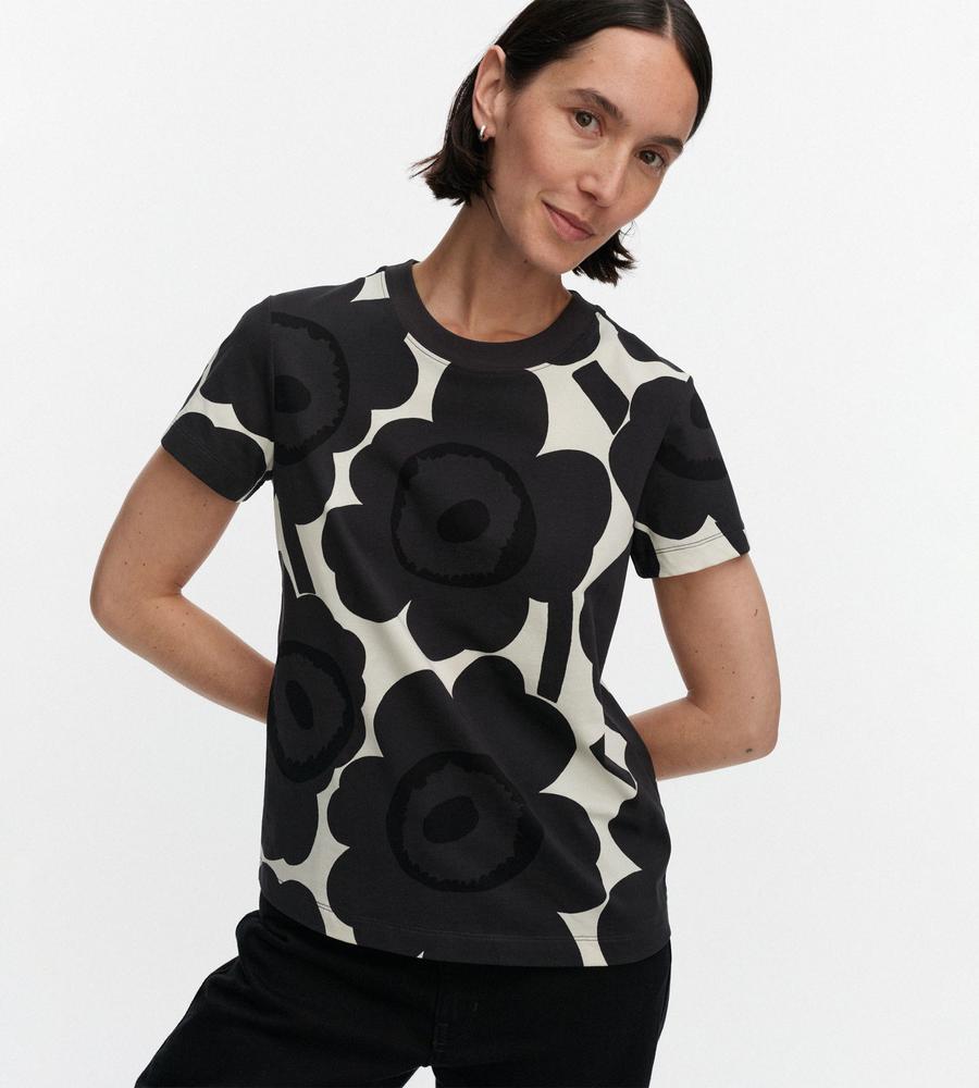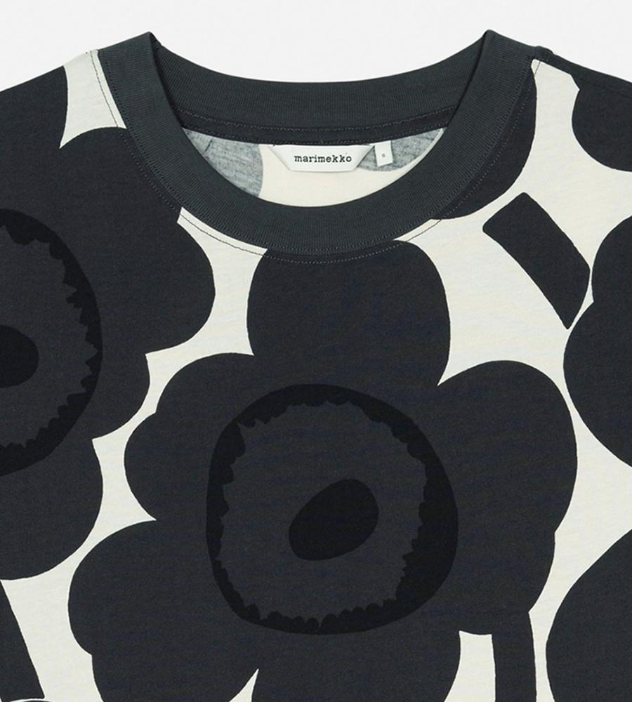 Marimekkoを代表するUnikko柄モチーフが目を惹くインパクトあるデザインのTシャツ。スリムでフィット感のあるすっきりとしたシルエットが特徴。Oネックのリブがメリハリのあるデザインアクセント。お手持ちのボトムを合わせて華やかでスタイリッシュなコーディネートが決まるアイテムです。