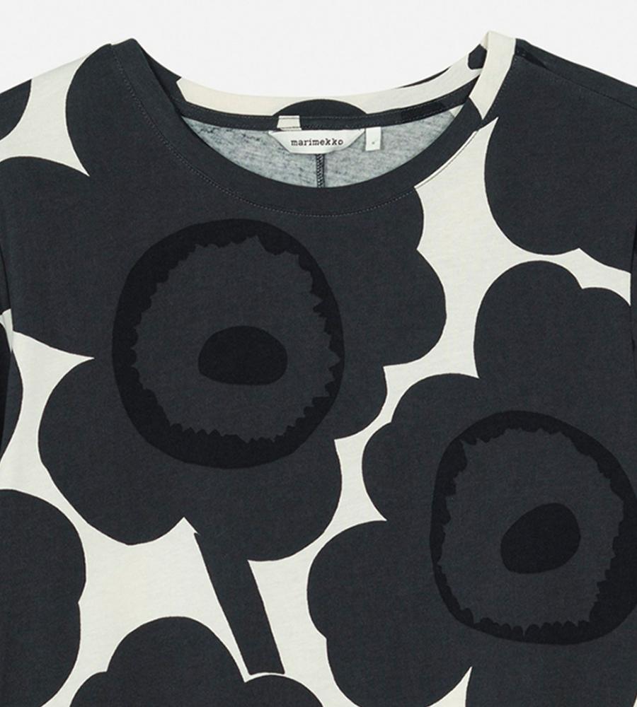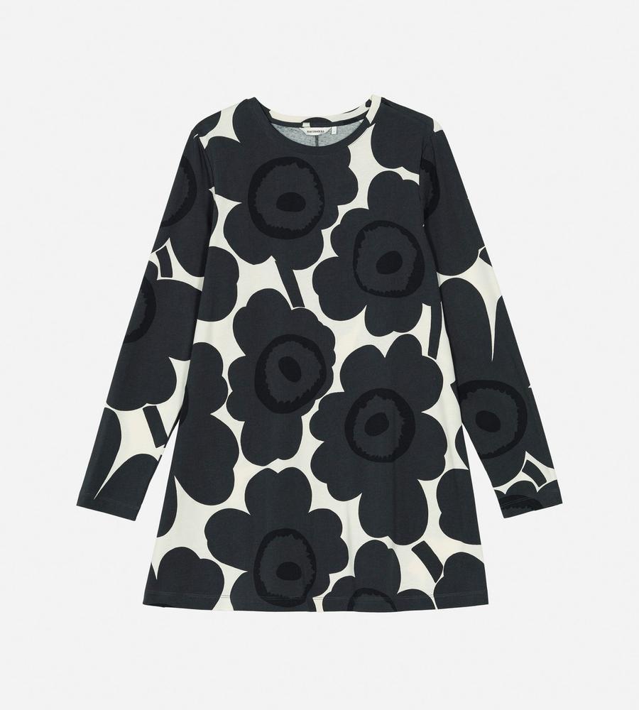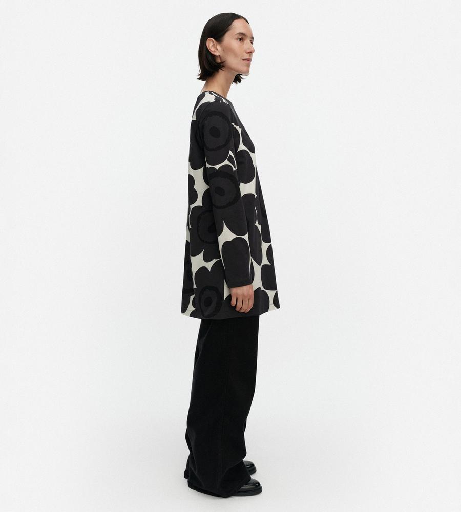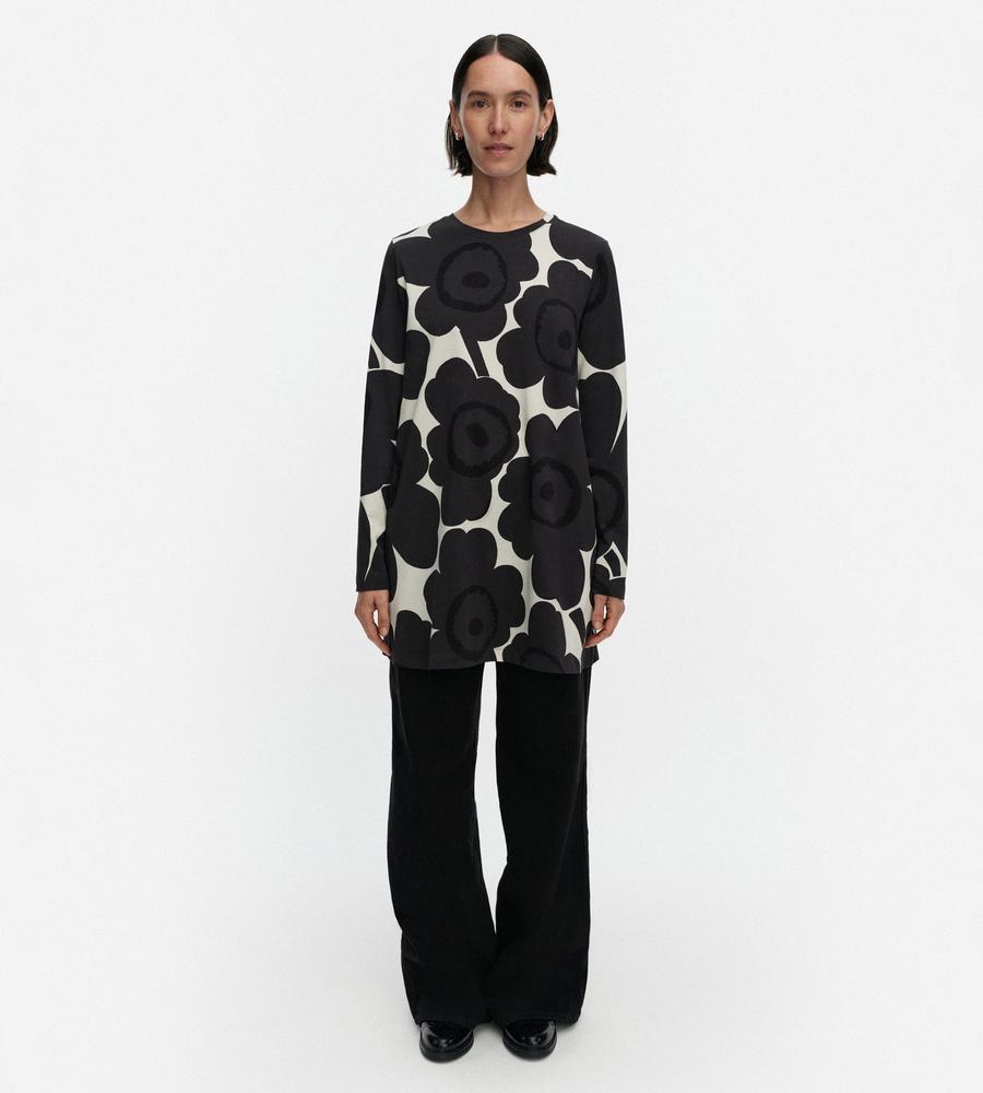 Marimekkoを代表するUnikko柄モチーフのチュニック。大きくプリントされたフラワーモチーフが華やかなデザイン。スリムフィットのトップから裾に向かってAラインに広がる少し長めの丈感がフェミニンさのあるシルエット。お手持ちのボトムを合わせるだけでスタイリッシュなコーディネートが実現します。