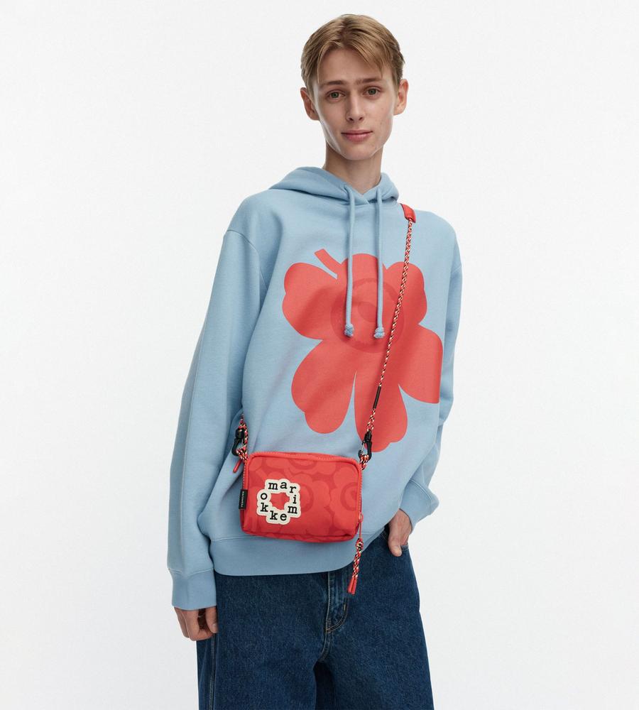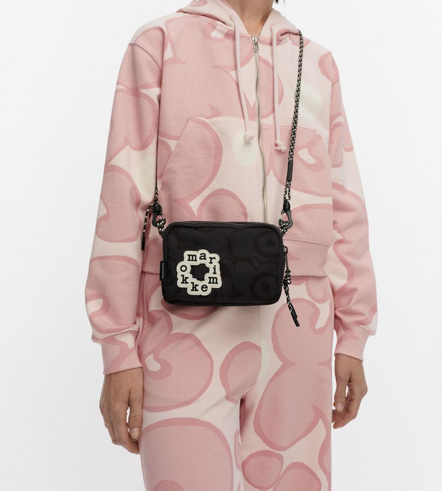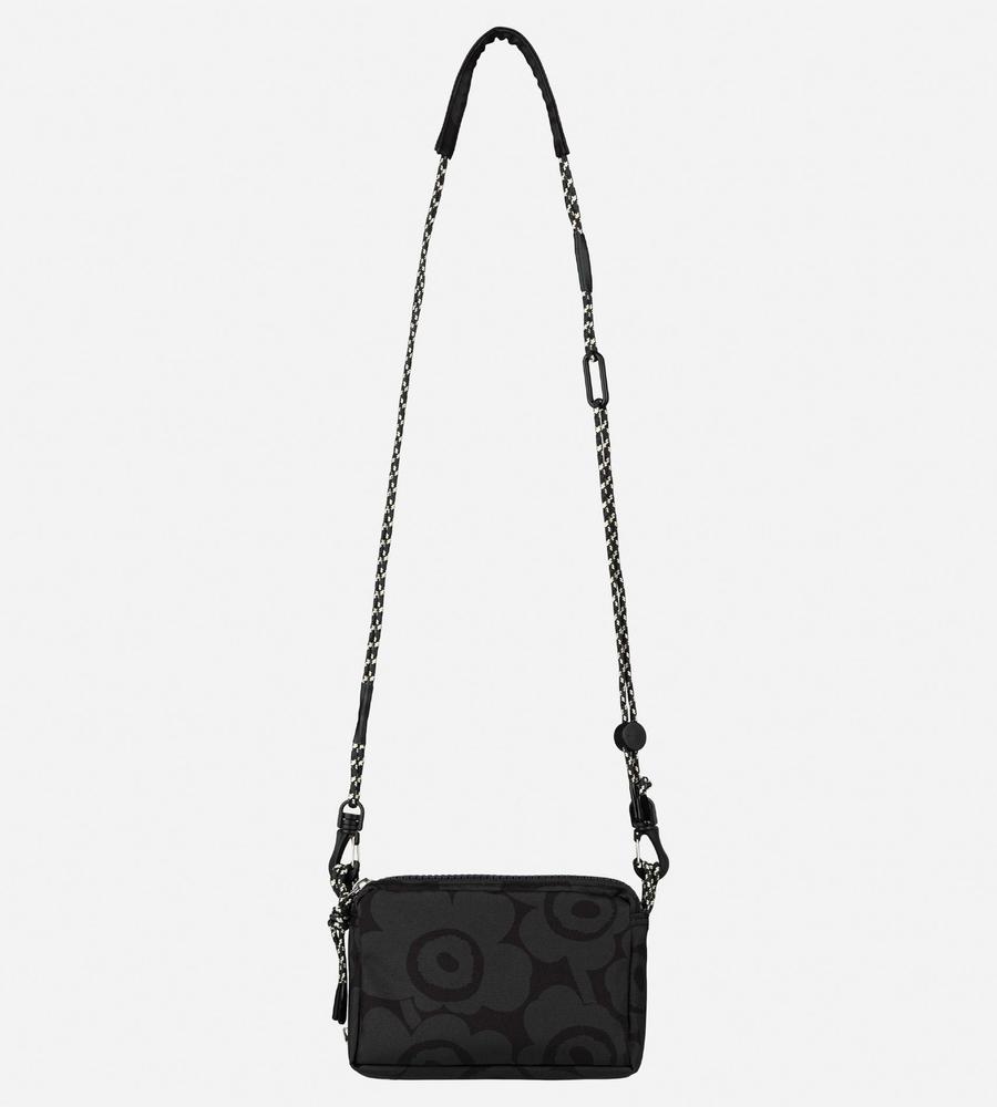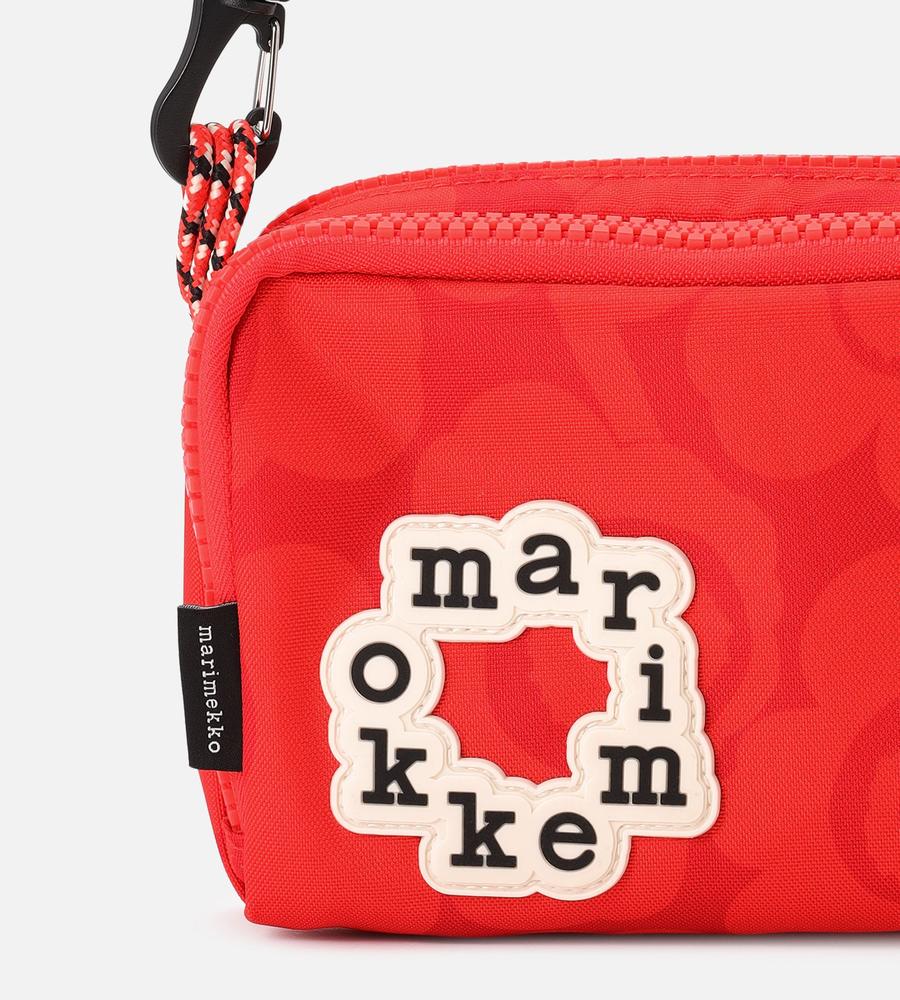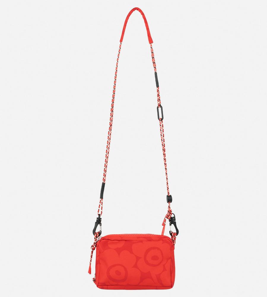 Marimekkoを代表するUnikko柄のショルダーバッグ。サークル型のブランドロゴがスタイリッシュなデザインポイント。ショルダーストラップは、着こなしに合わせて斜めがけにしたりと長さ調整可能。コンパクトなフォルムながら、2つのジップ付きポケットで使い勝手抜群なアイテムです。