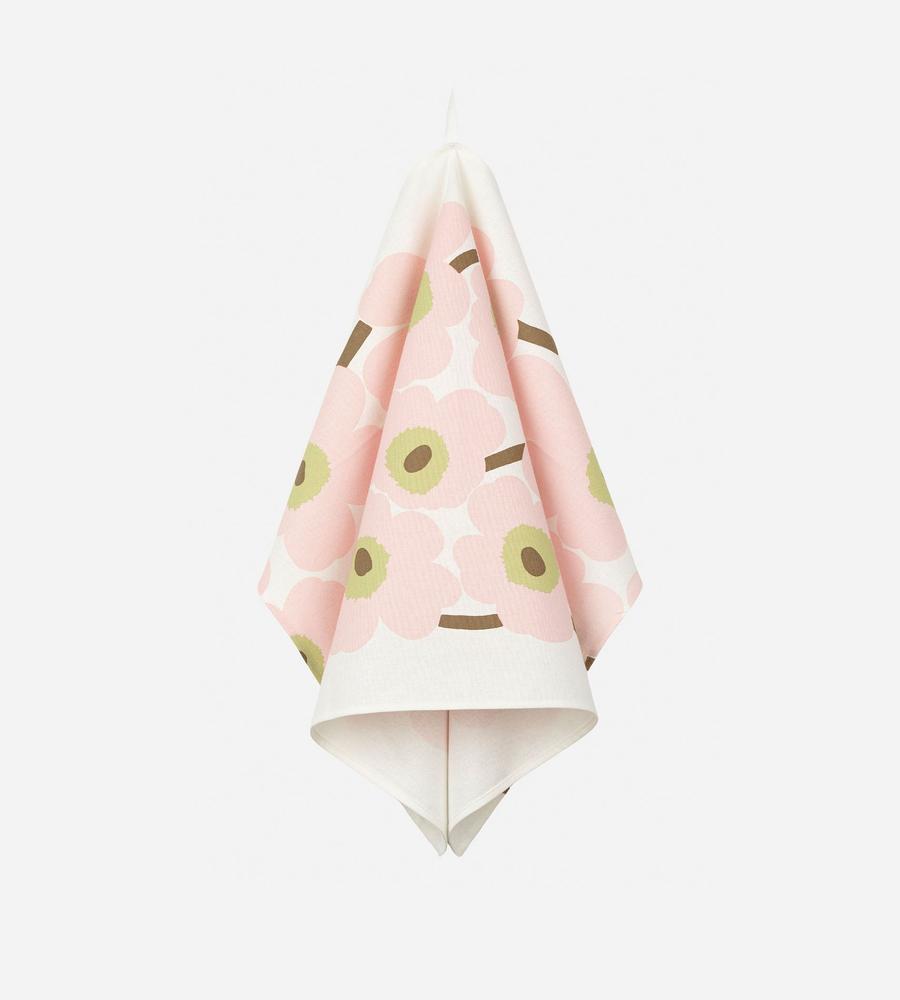 Marimekkoの人気シリーズ、Unikko(ウニッコ)からティータオルの登場です。ピンク×ホワイトを基調としたデザインで、いつもの食卓を明るく華やかに見せてくれます。吸水や速乾性にも優れた素材でキッチンまわりの色んなシーンで大活躍、同じデザインのアイテムとセットでそろえるのもおすすめです。
