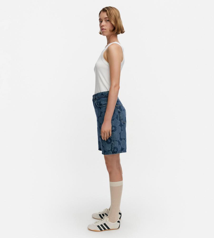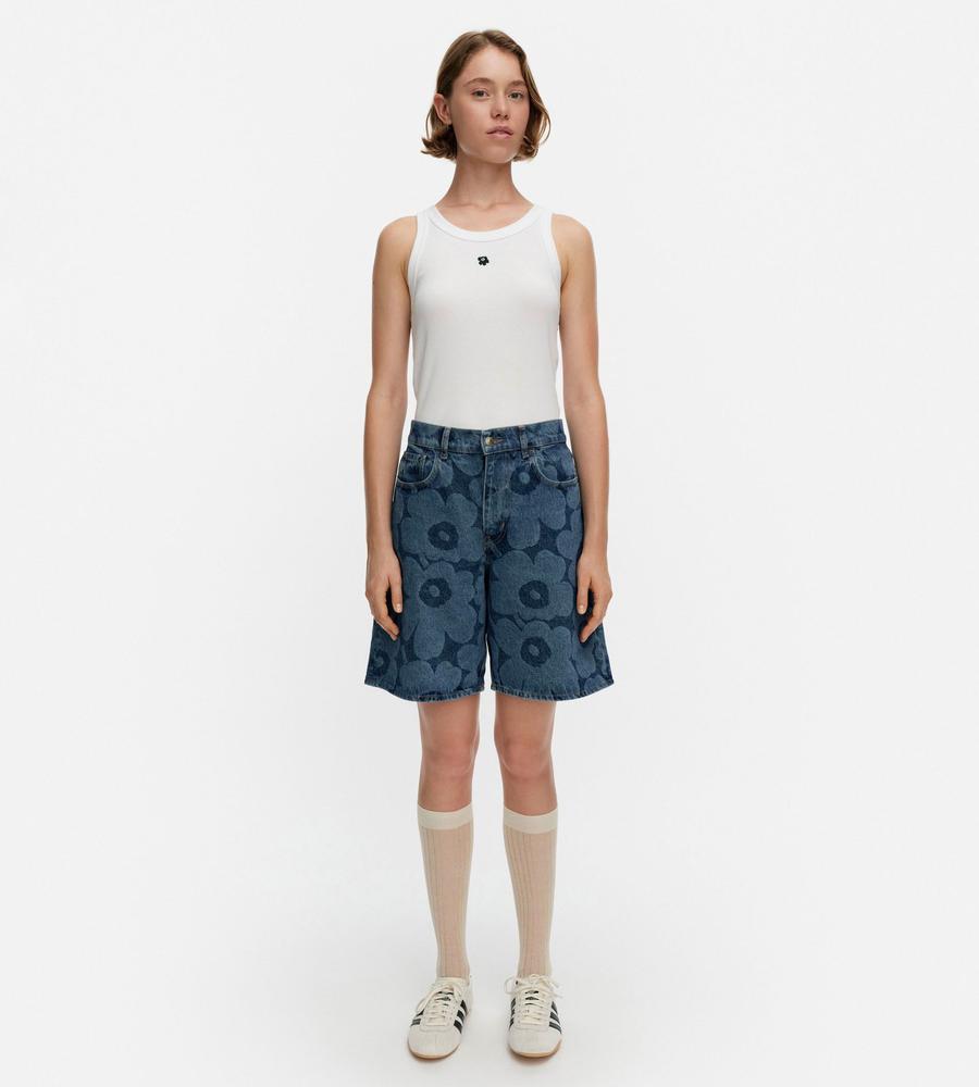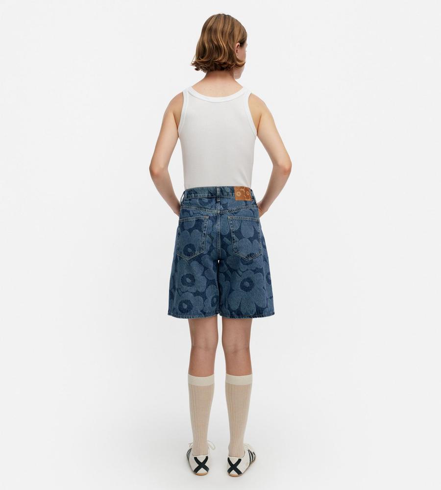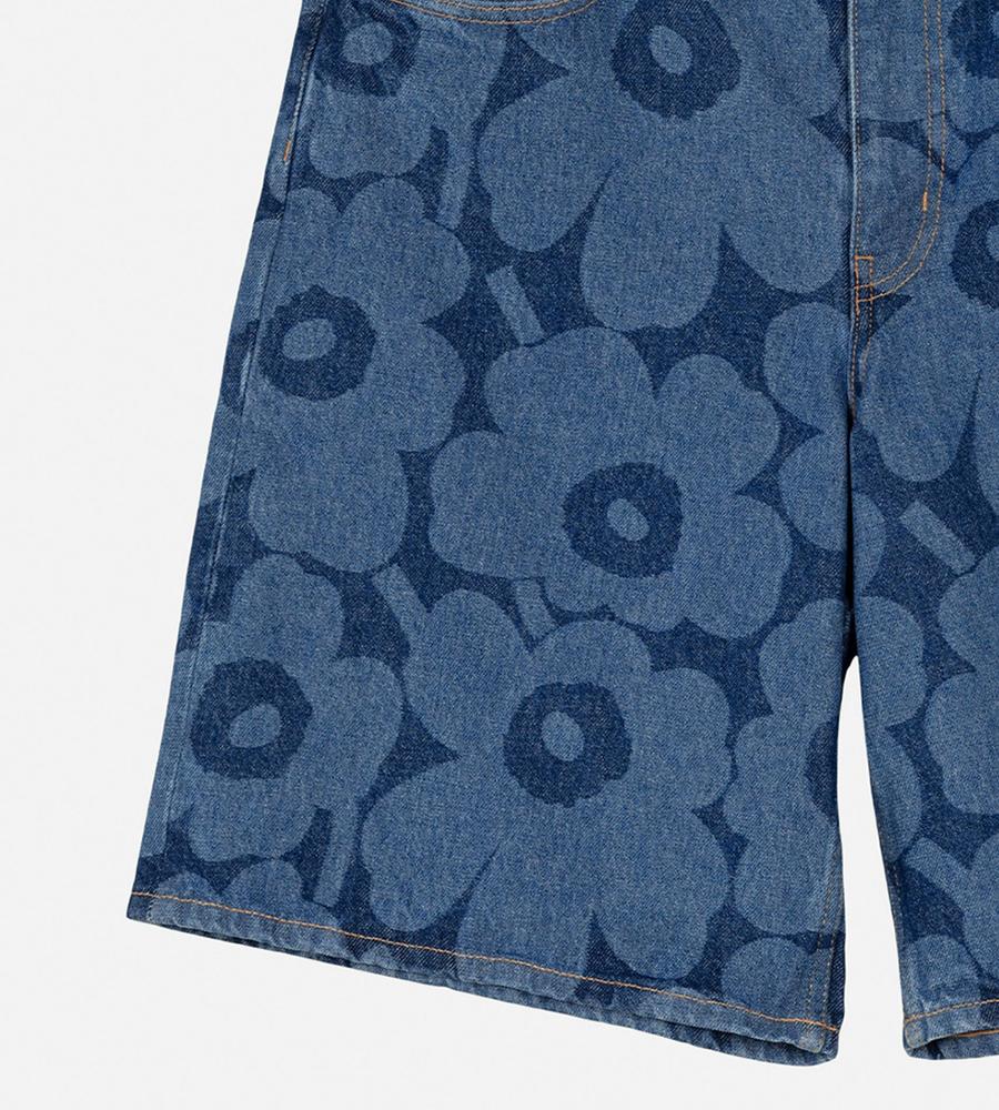 さりげなく主張するUnikko柄が可愛いデニムショートパンツ。いつものカジュアルスタイルも、ワンランク華やかに仕上げてくれそう。さわやかさを演出したいシーンにもおすすめの一本です。