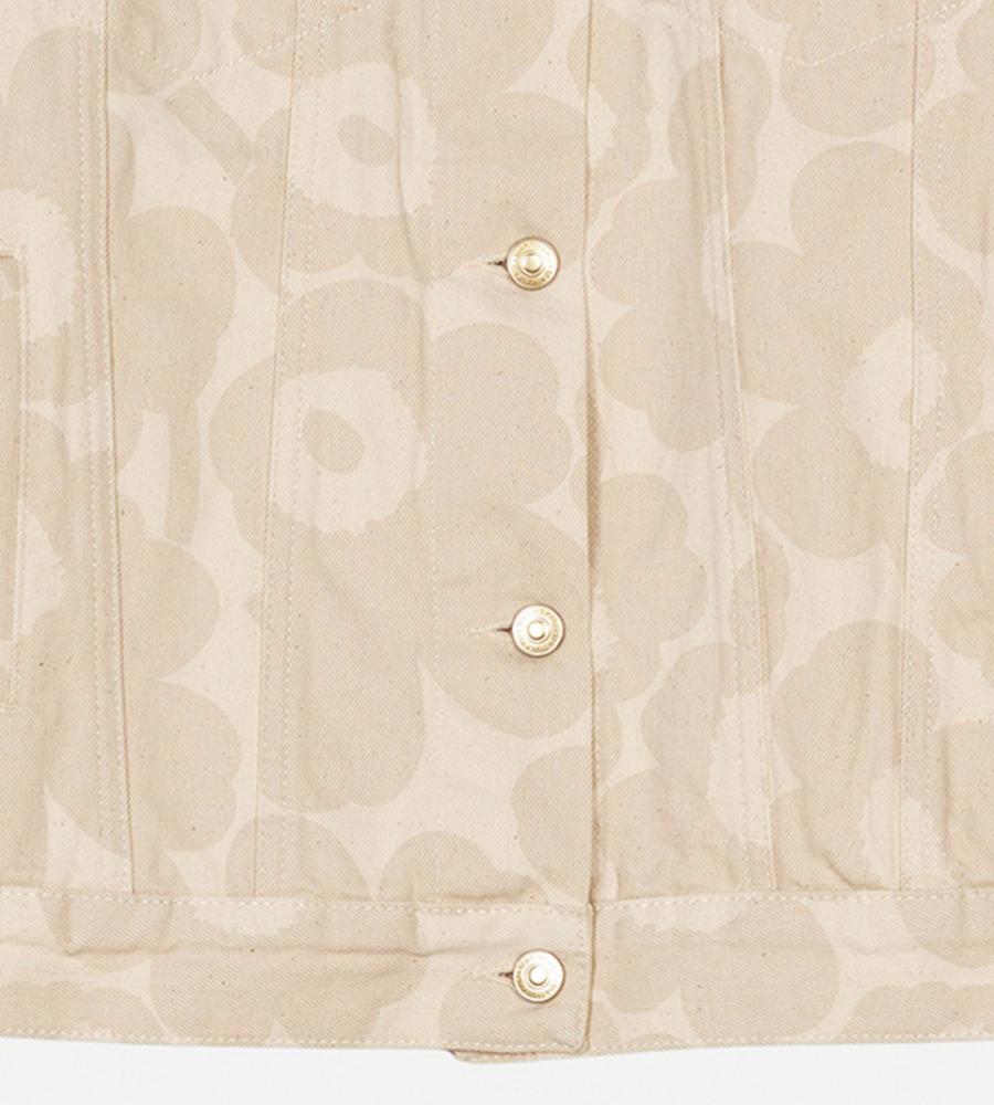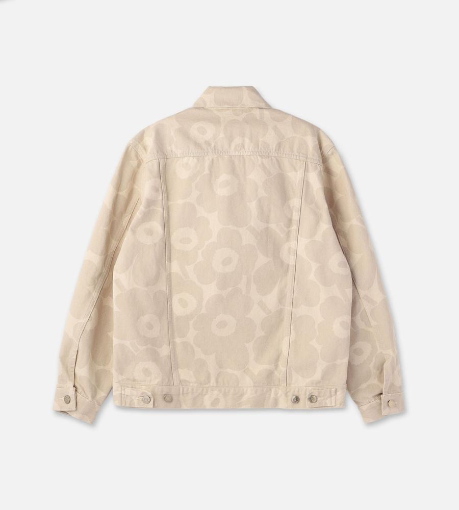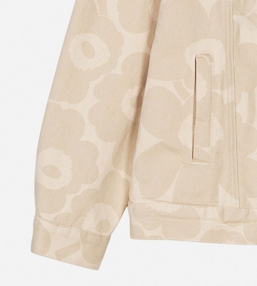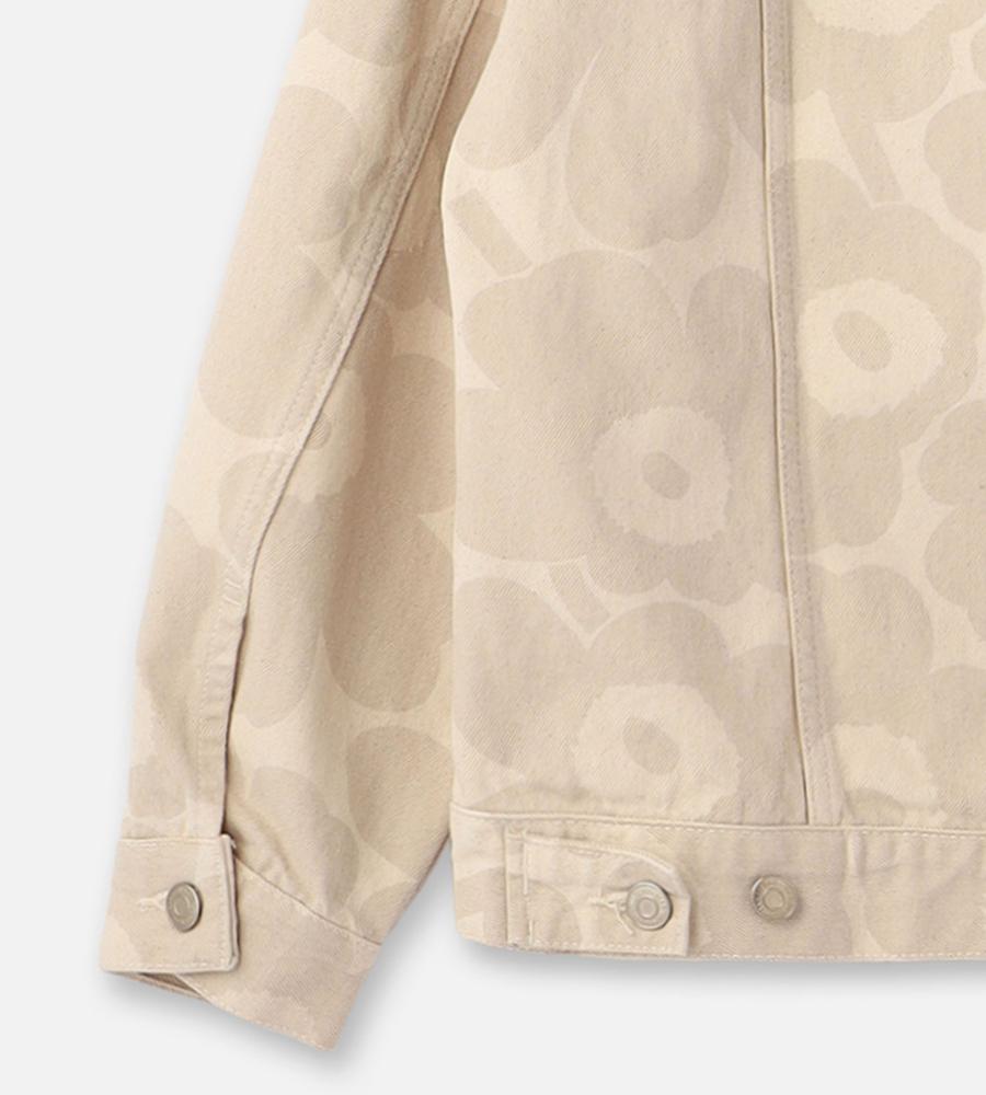 着るたびに心華やぐ、Unikko柄のデニムジャケット。メンズライクなイメージのデニムジャケットも、ぐっと新鮮なムードにきまるのがうれしい。明るいベージュカラーが顔まわりをトーンアップしてくれるのもポイントです。