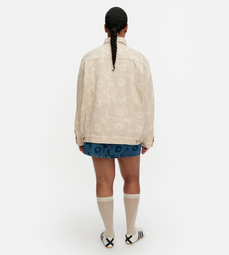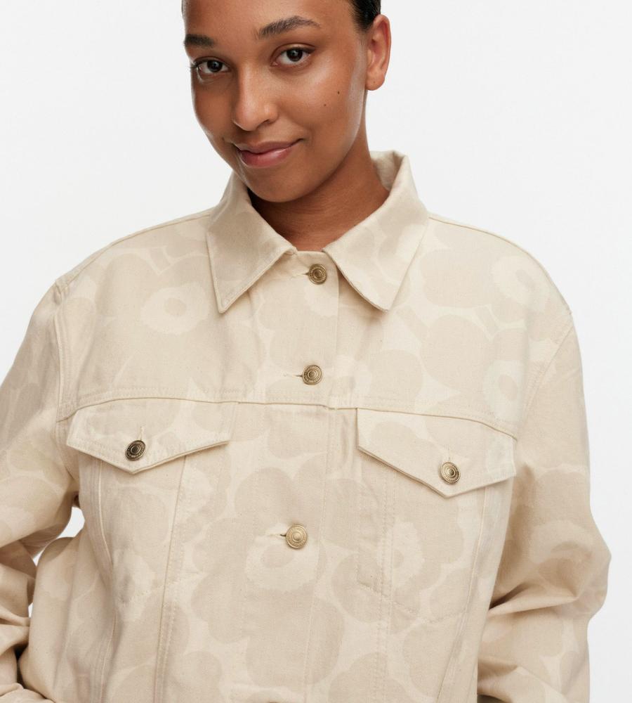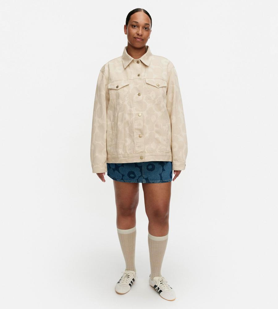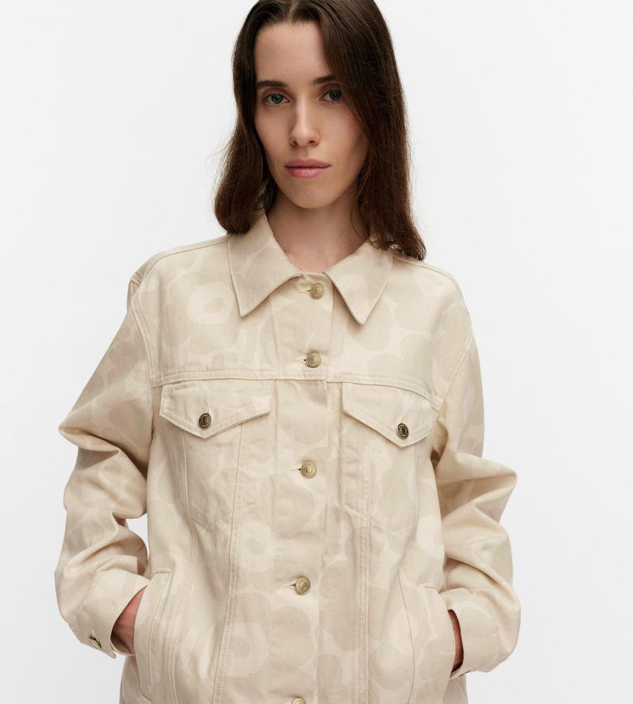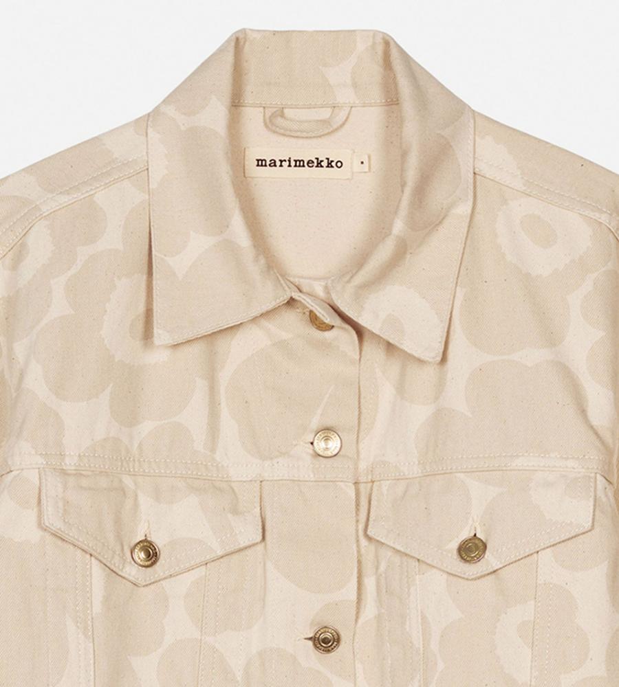 着るたびに心華やぐ、Unikko柄のデニムジャケット。メンズライクなイメージのデニムジャケットも、ぐっと新鮮なムードにきまるのがうれしい。明るいベージュカラーが顔まわりをトーンアップしてくれるのもポイントです。