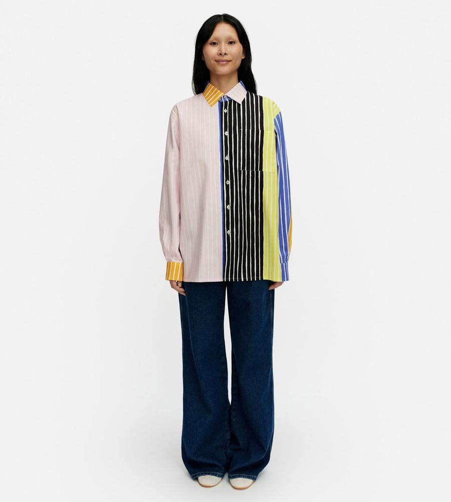 手書き風のストライプをあしらったPiccolo柄の長袖シャツ。斬新なマルチカラーデザインが、コーディネートをモダンに演出してくれます。シルエットはほどよくリラックス感があり、胸ポケットと直線的な裾ラインが特徴。肌触りのよいコットン布帛もポイント。男女兼用でおすすめのアイテムです。