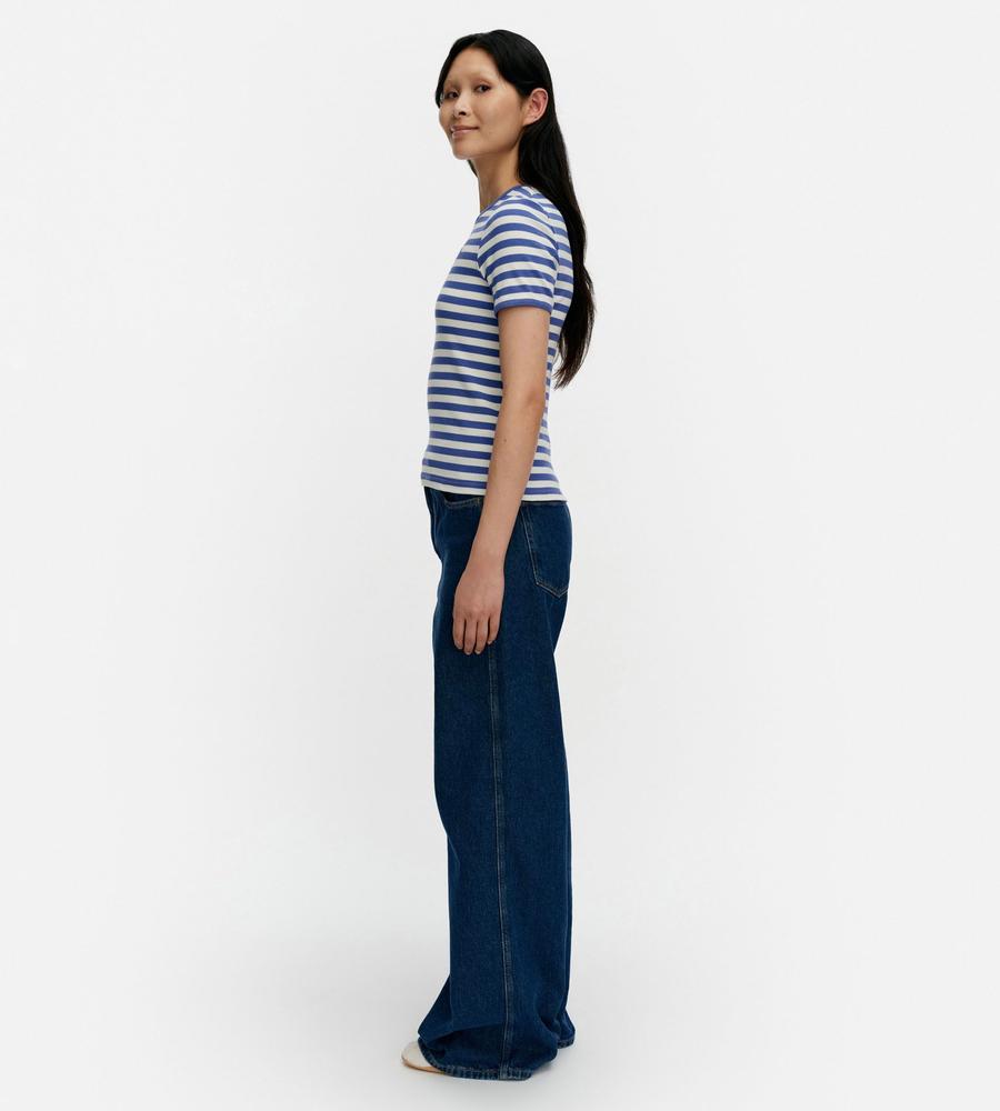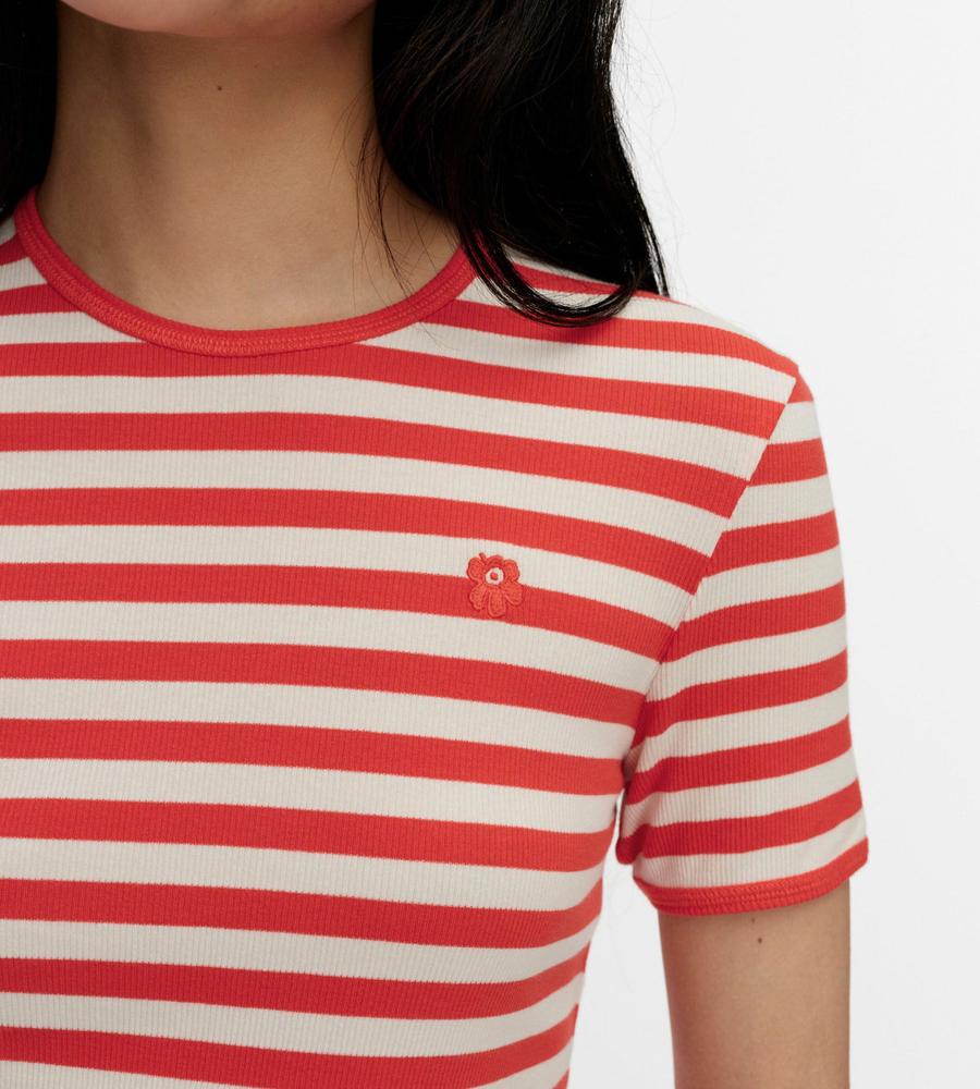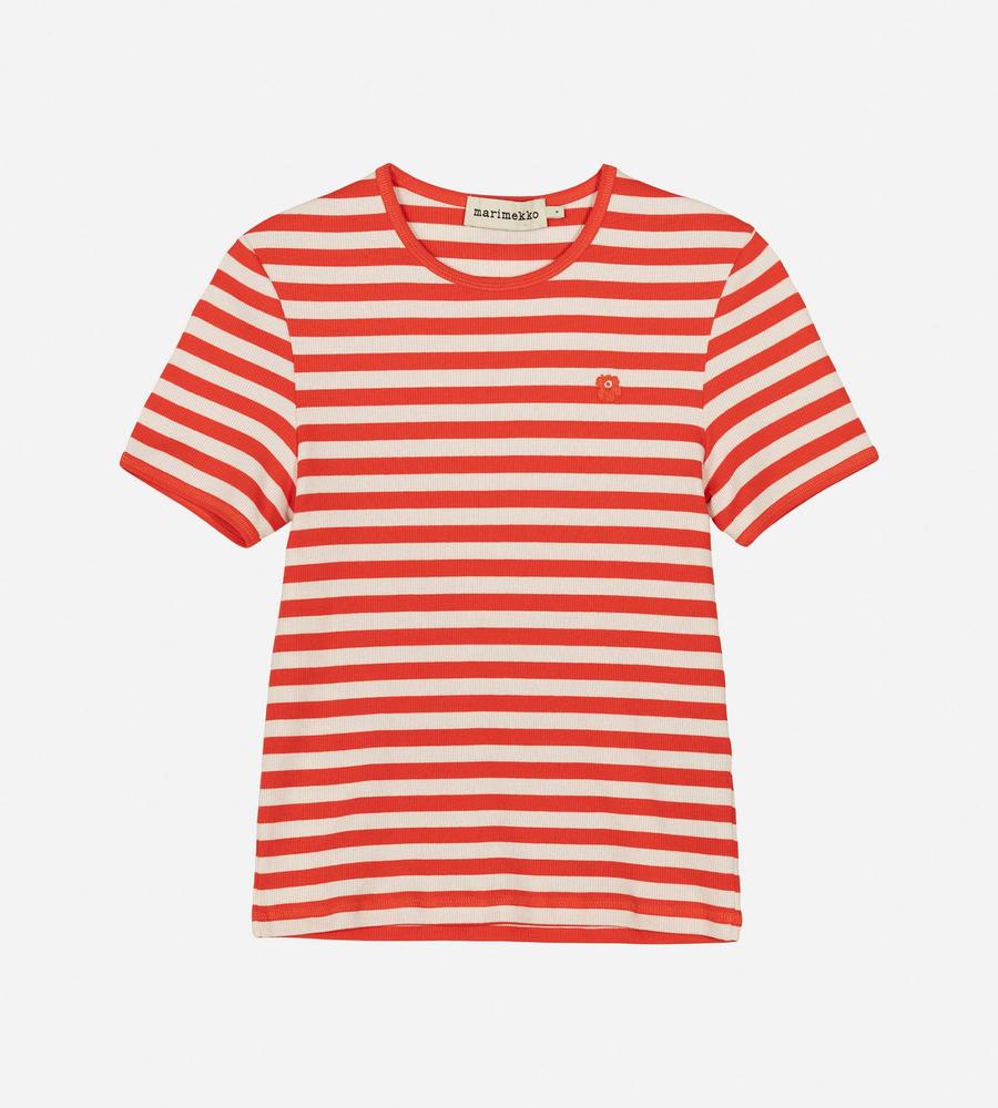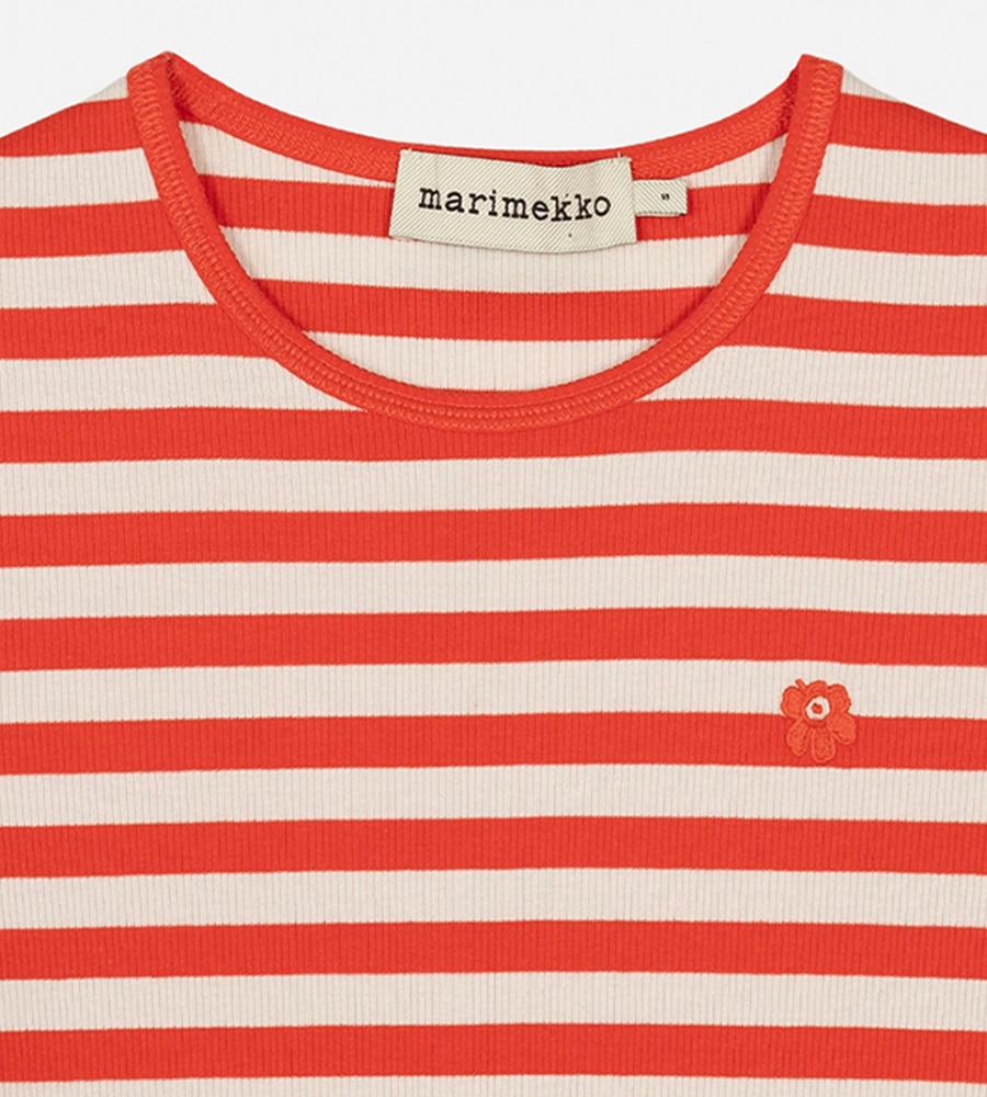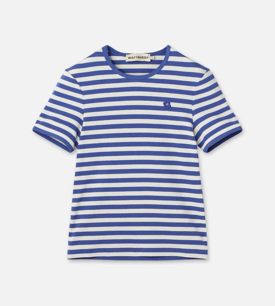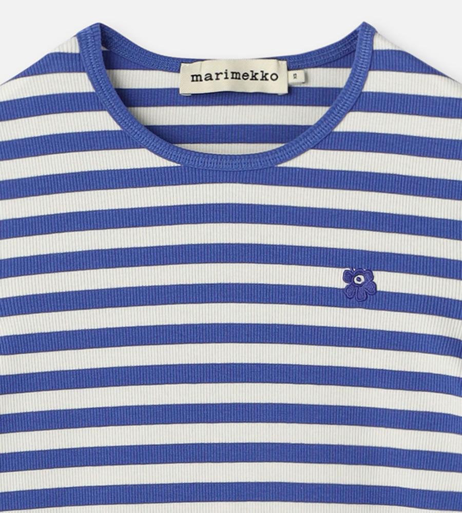 Marimekkoを代表する横縞と花モチーフを組み合わせたTasaraita Unikko柄のクルーネックTシャツ。ソフトなリブ生地を用い、フィット感のあるシルエットに仕上げています。胸元の小さな花刺繍がワンポイント。どこかマリン風のデザインで、街中はもちろん、ビーチやレジャーにもおすすめの一枚です。