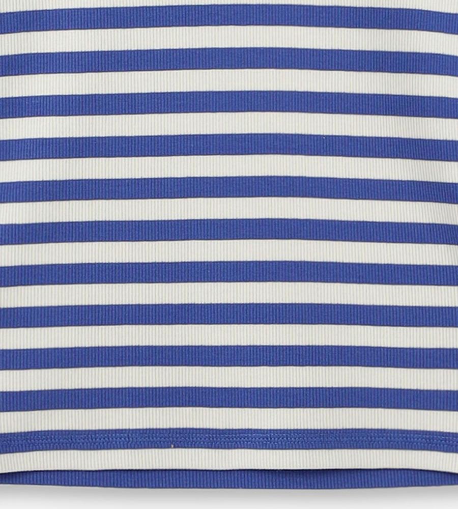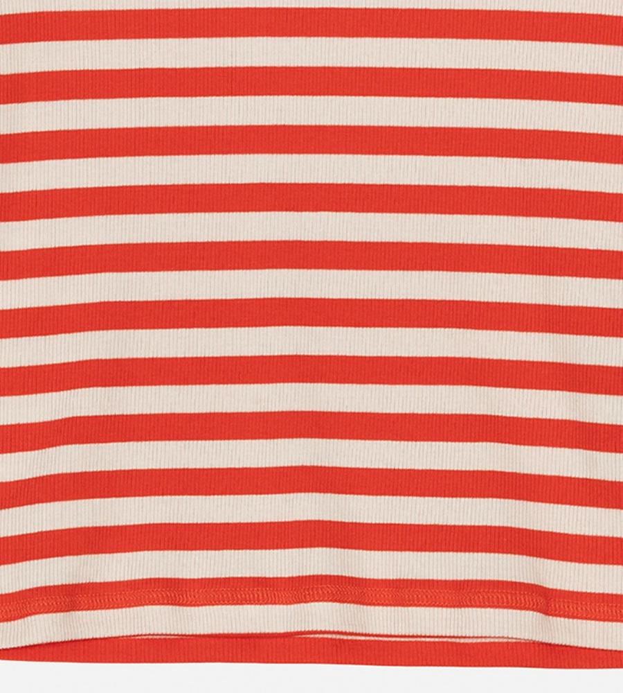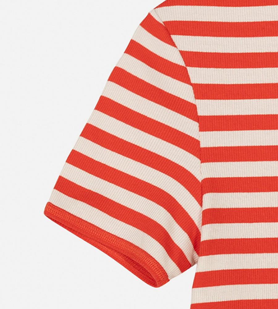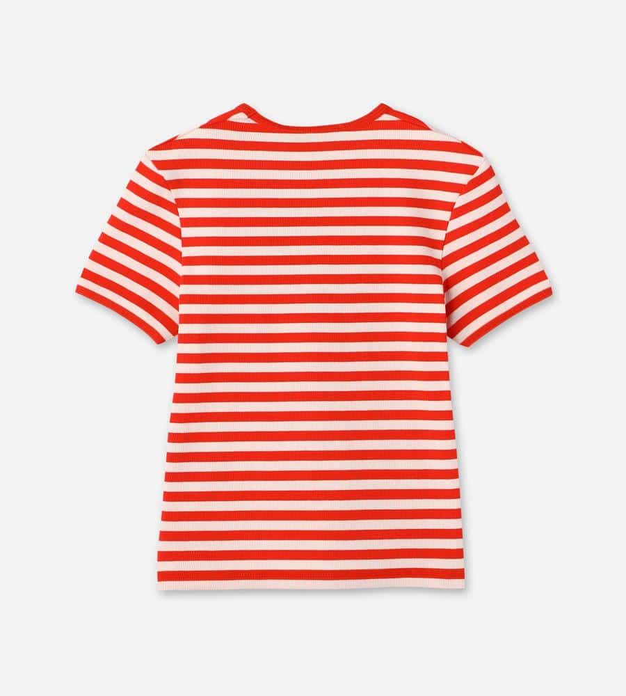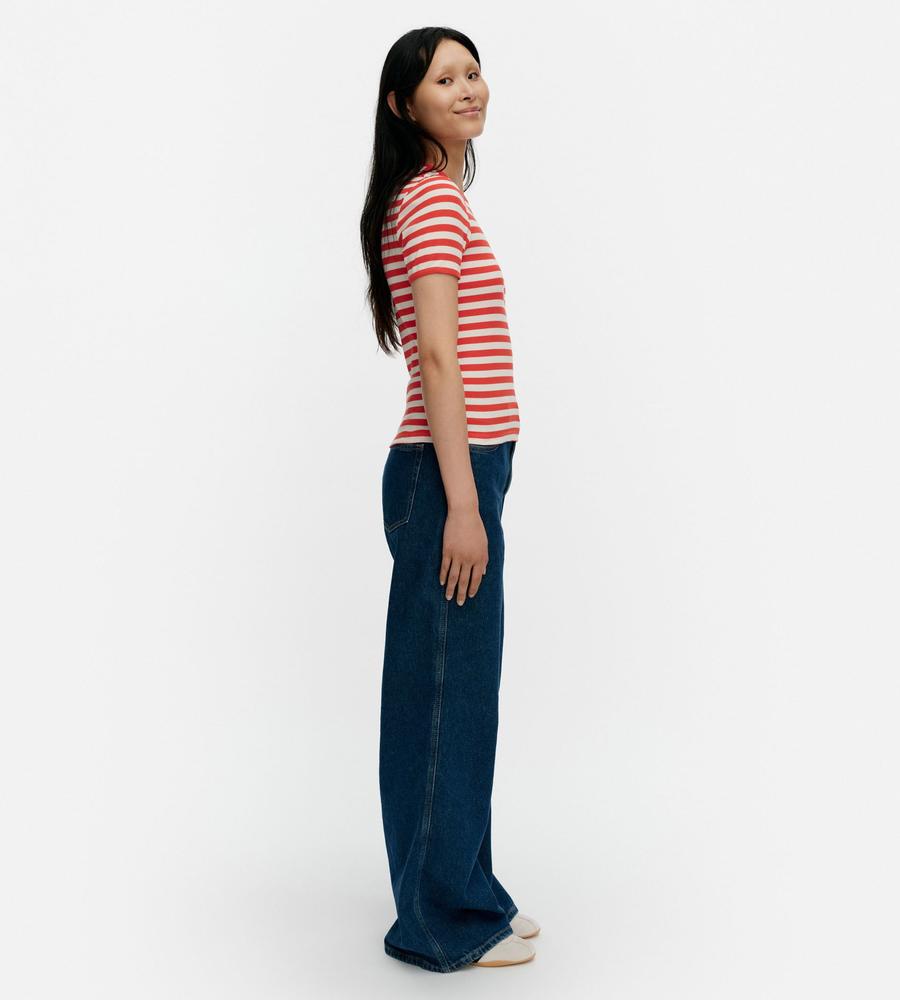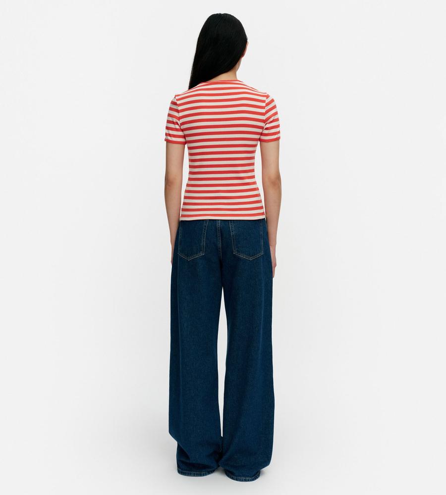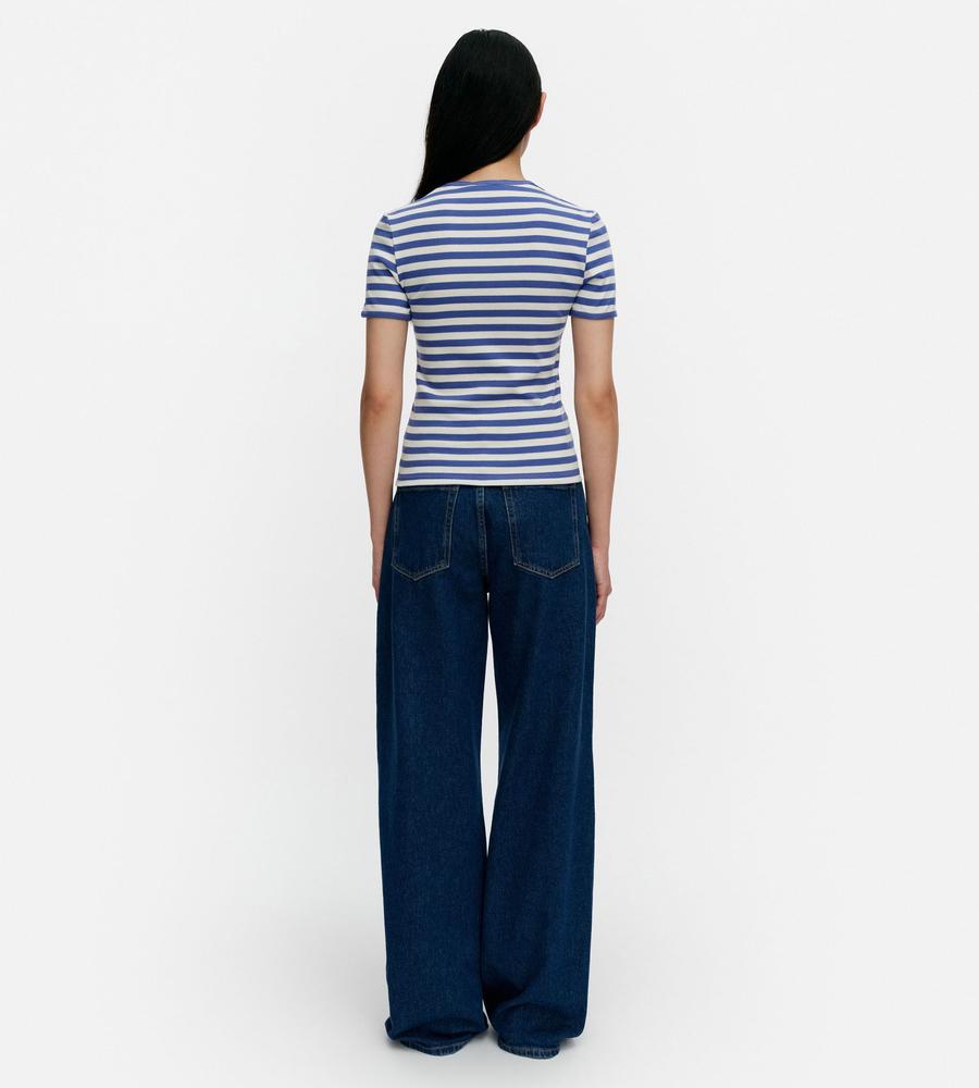 Marimekkoを代表する横縞と花モチーフを組み合わせたTasaraita Unikko柄のクルーネックTシャツ。ソフトなリブ生地を用い、フィット感のあるシルエットに仕上げています。胸元の小さな花刺繍がワンポイント。どこかマリン風のデザインで、街中はもちろん、ビーチやレジャーにもおすすめの一枚です。